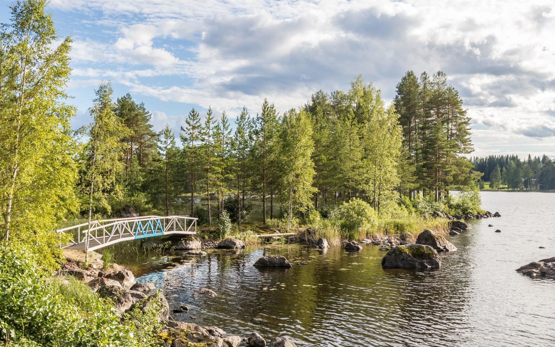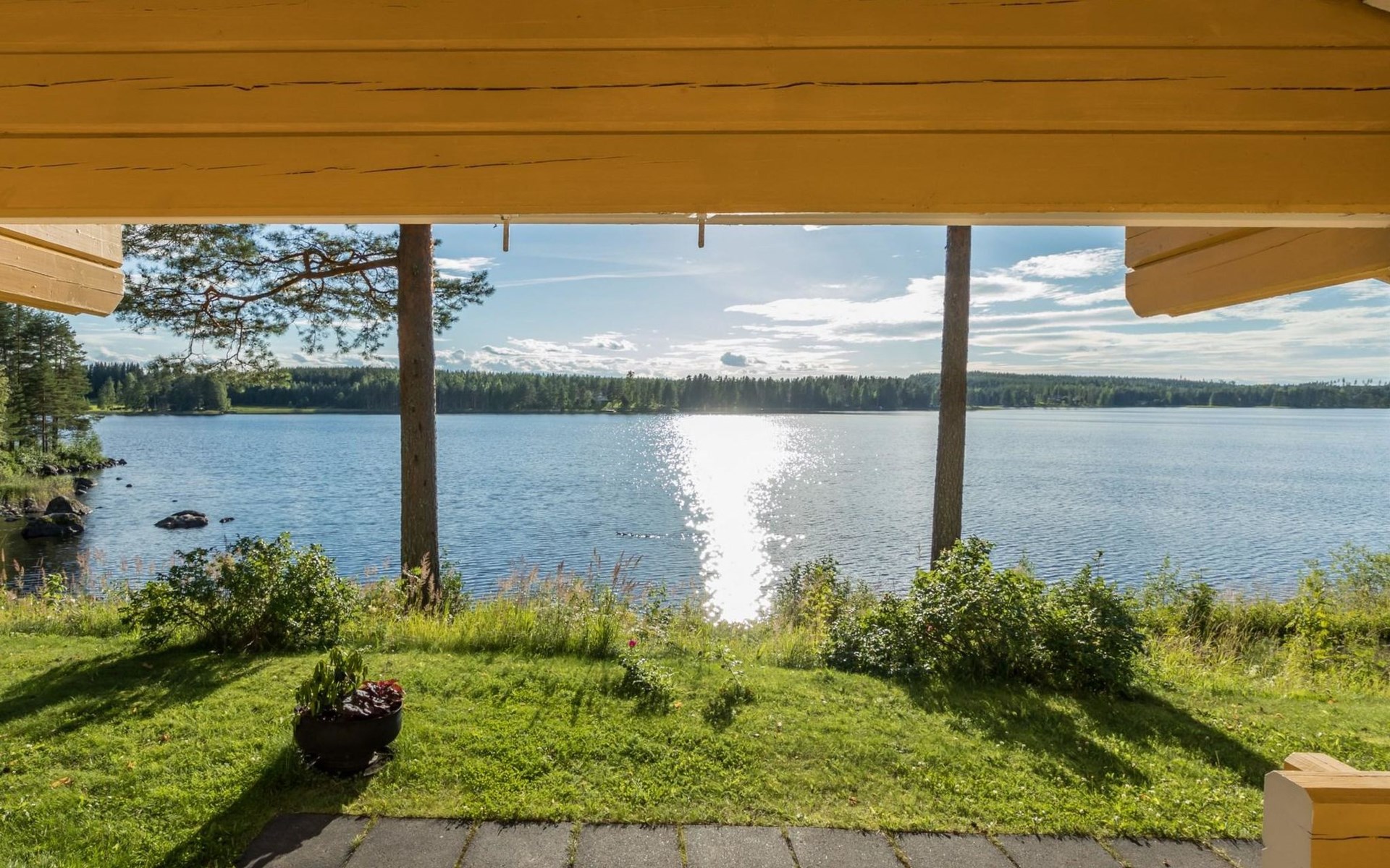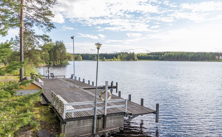 A spacious log villa on a peninsula.