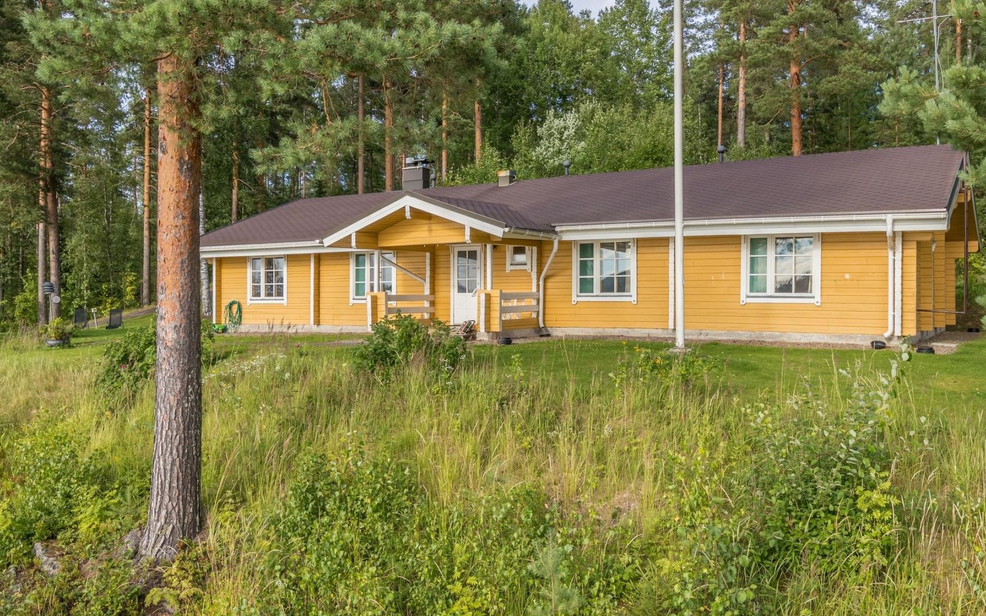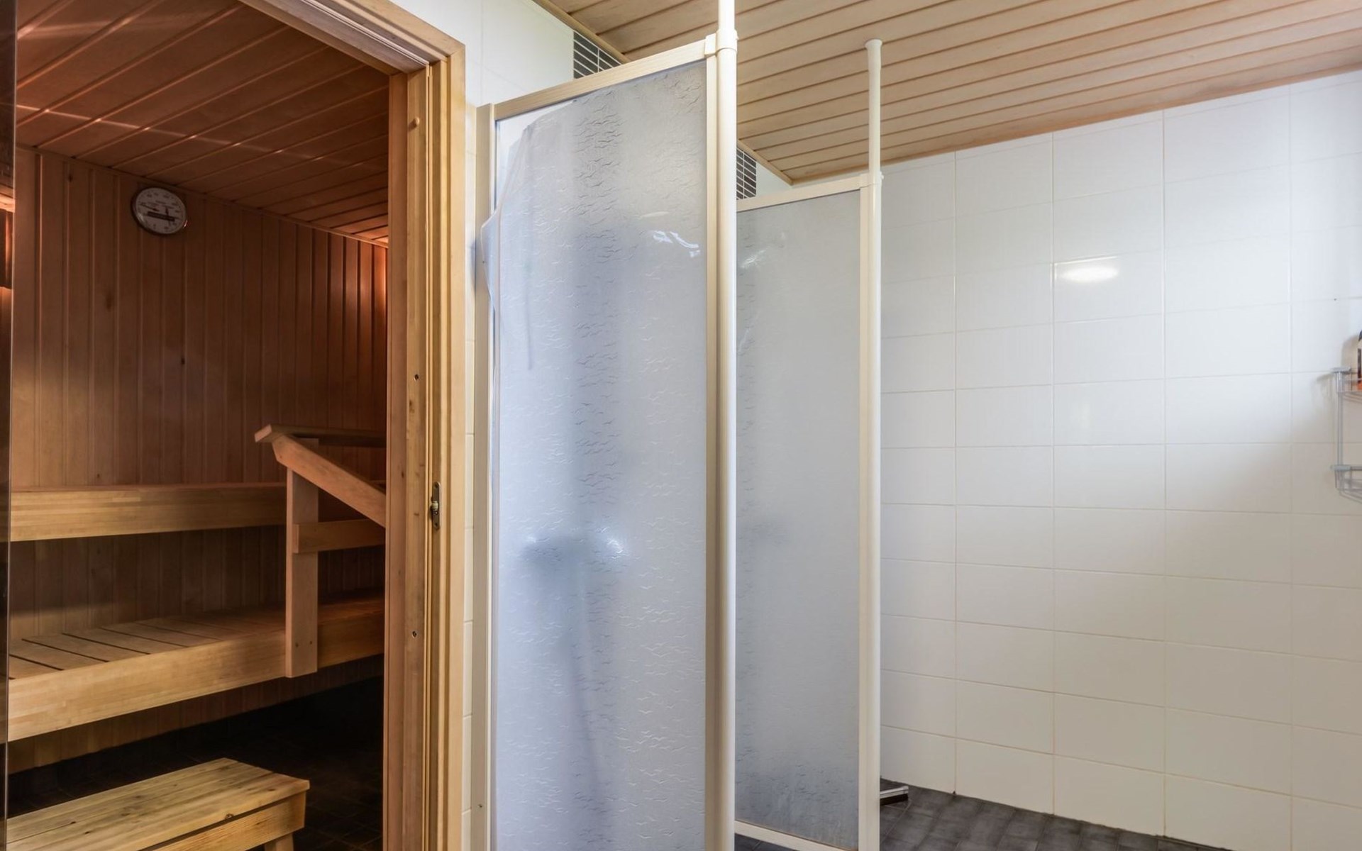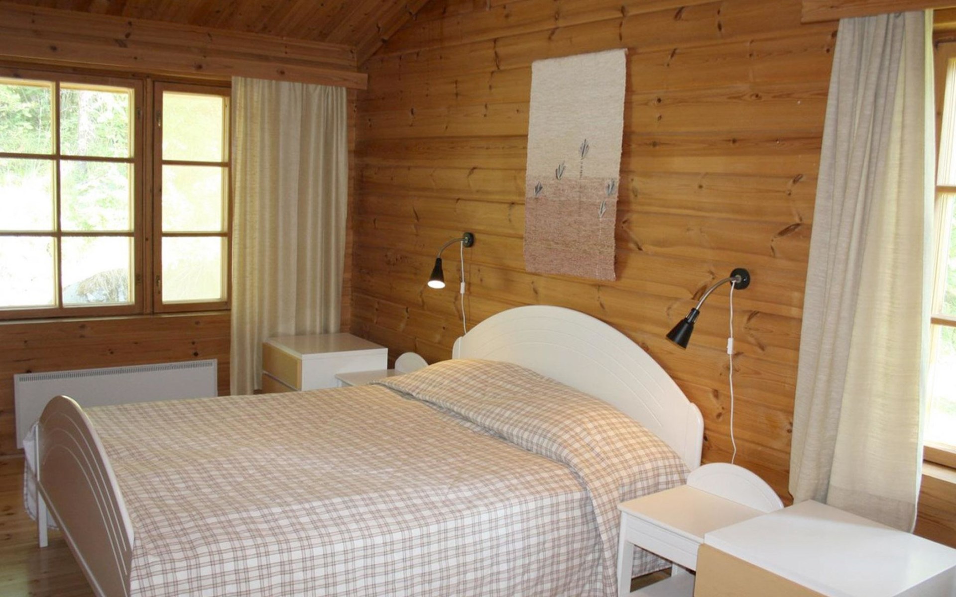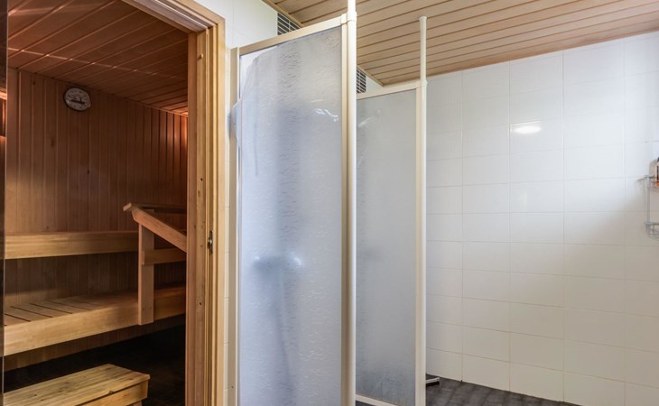 Villa built in 1980, kitchen-living room, utility room, room with fireplace, living room/meeting room, vestibule, bedroom with double bed and a private toilet/shower, three bedrooms with 2 beds in each (+ 2 with extra beds). The extra beds are foldable mattresses. Sauna, washing room, dressing room and terrace.