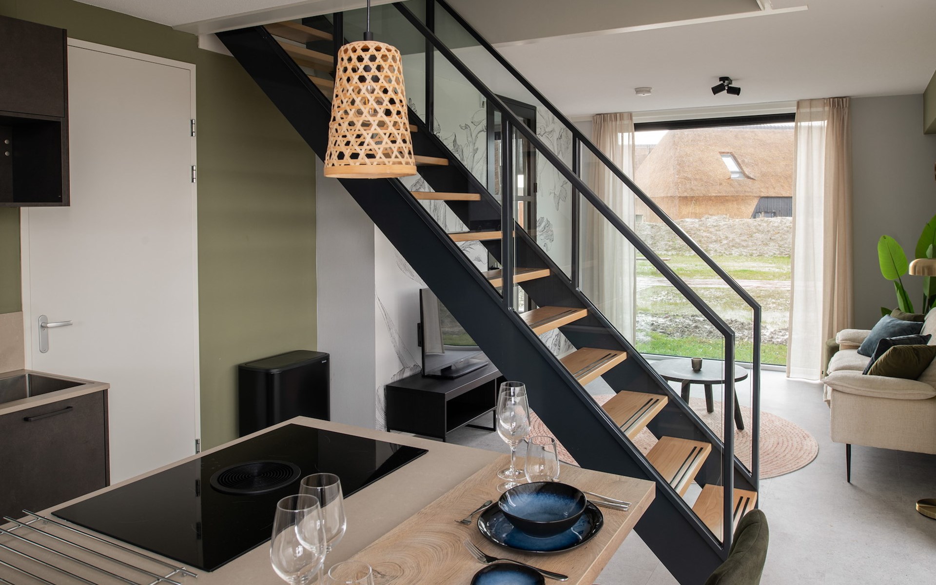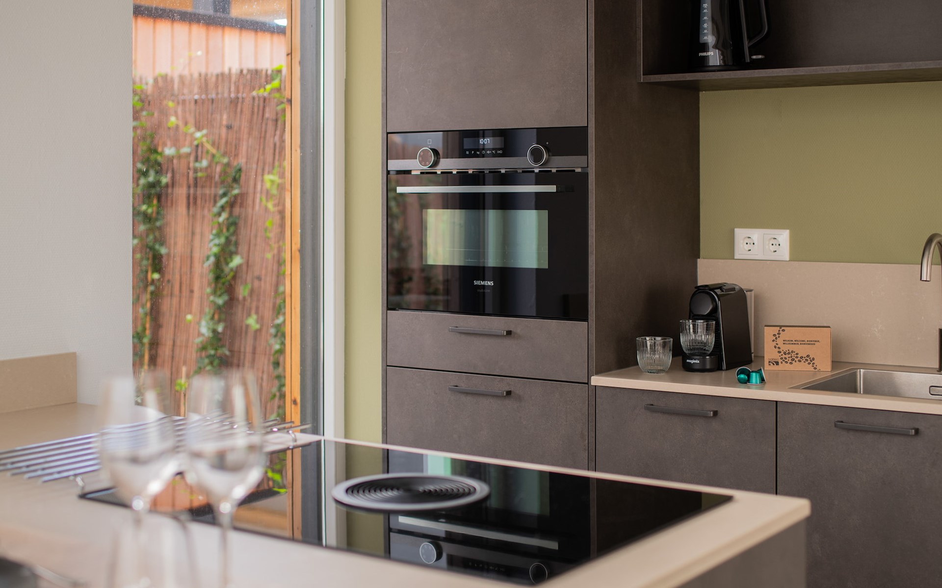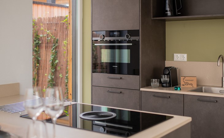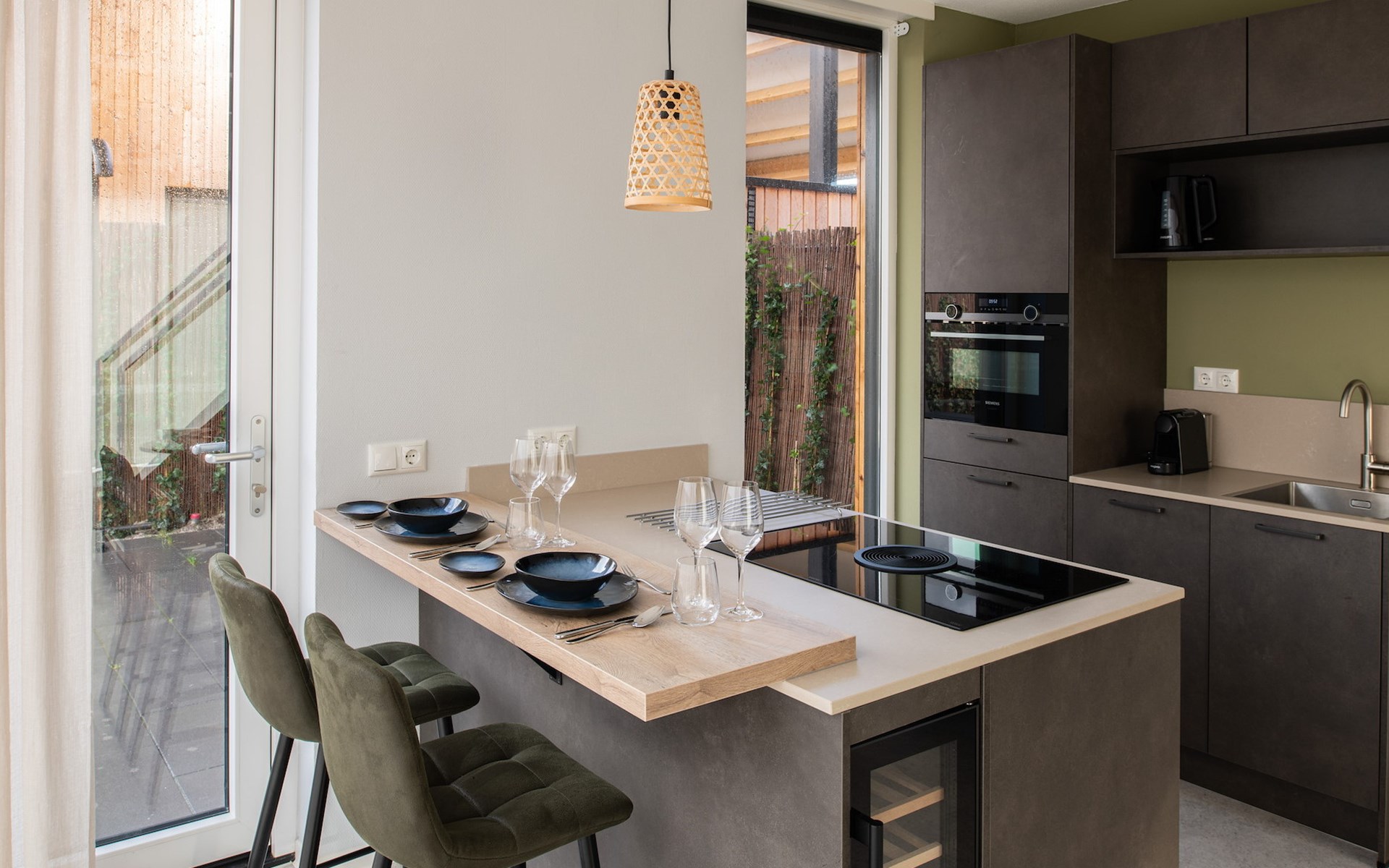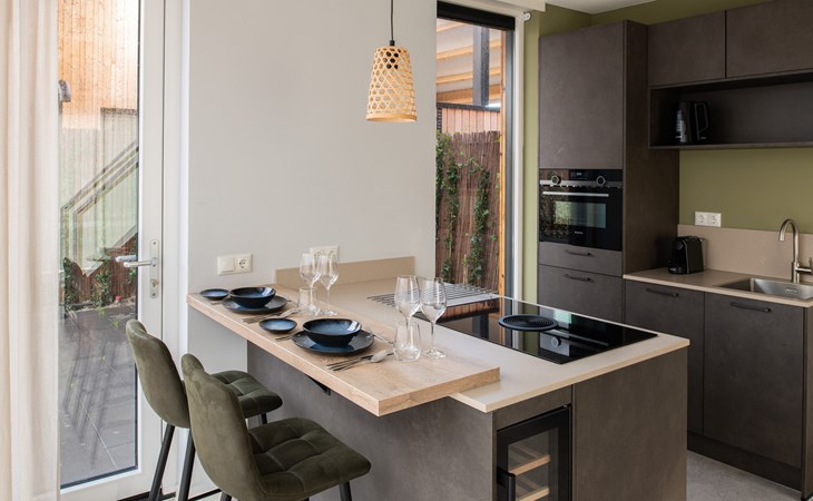 Oase Aqua Wellness holiday home has a stylish living/dining room with a smart TV with streaming capability. The open-plan kitchen features a kitchen island with luxury appliances including a Bora hob, fridge freezer, combi-oven oven, dishwasher, Nespresso machine and wine cooler. There is also a separate toilet on the ground floor.