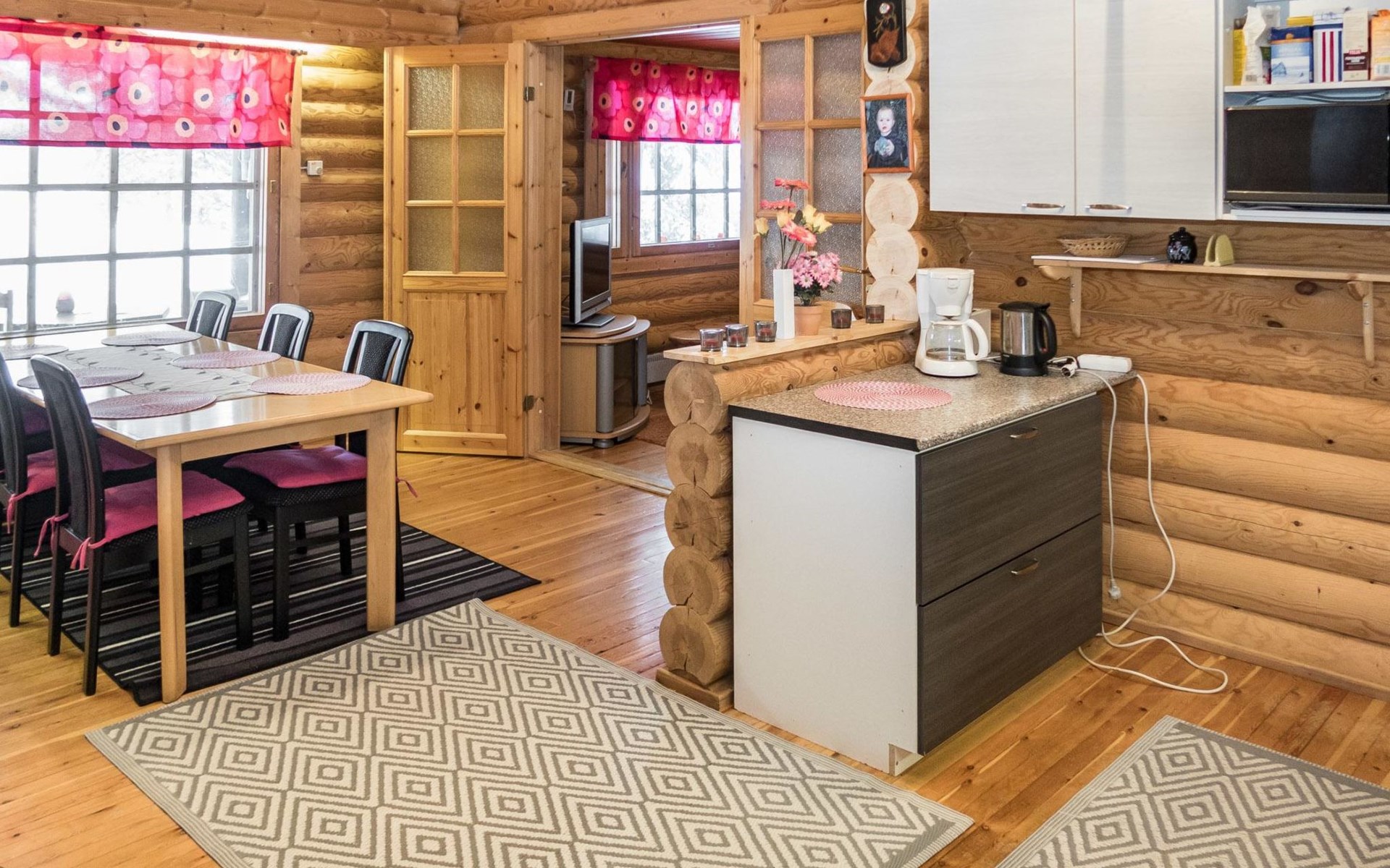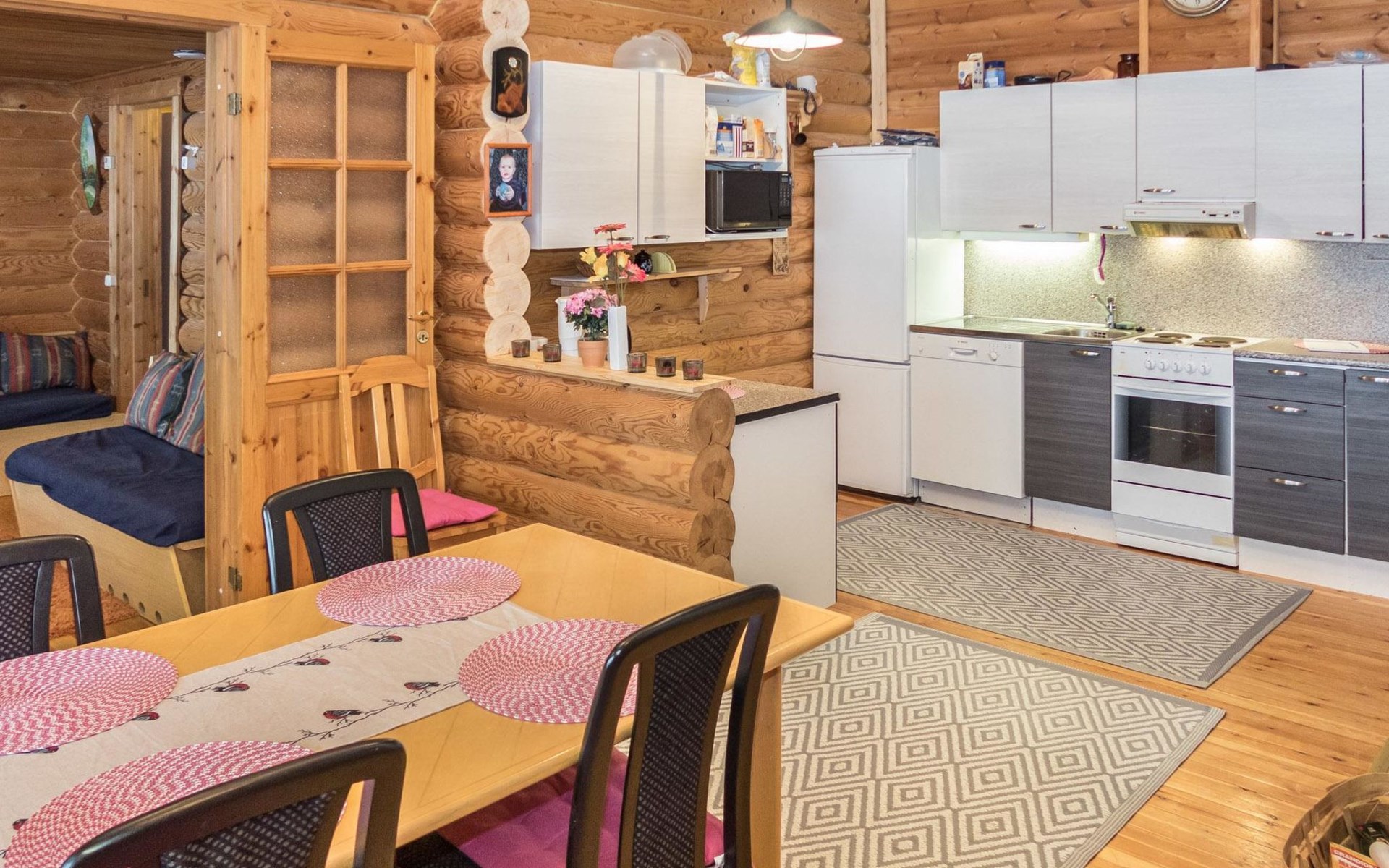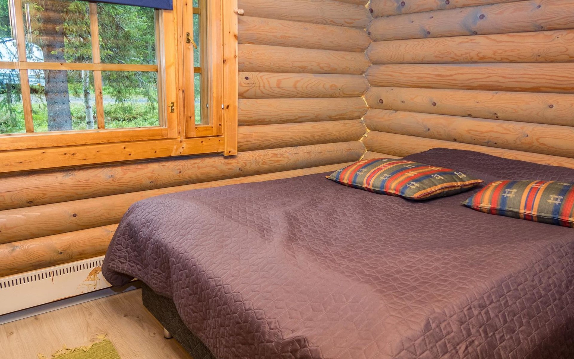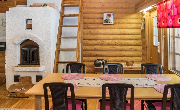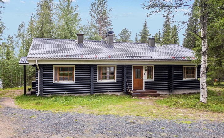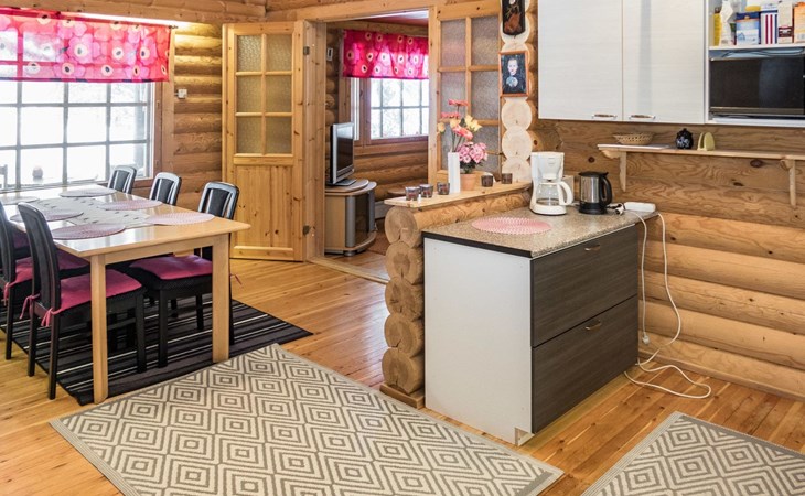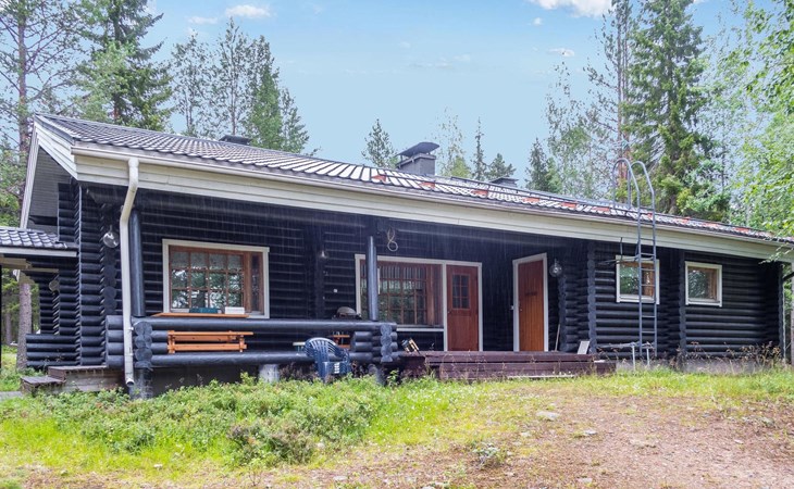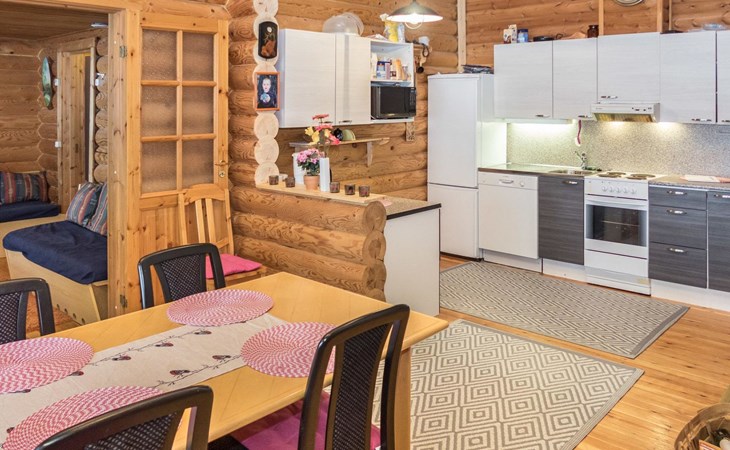 Log cottage, built in 1989, bedroom 1: double bed, bedroom 2: 120 cm bed 2, bedroom 3: 3 beds, living room sofa bed for 2, bedroom 4: double bed. Combined kitchen/living room, wood heated sauna (entrance through the terrace).