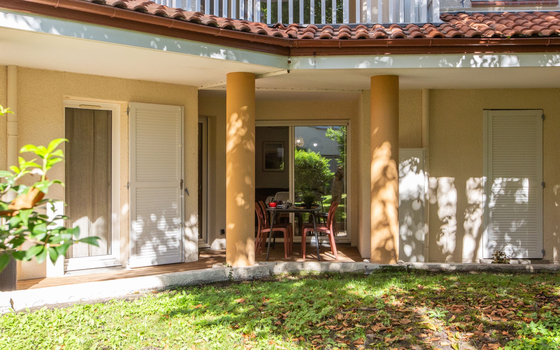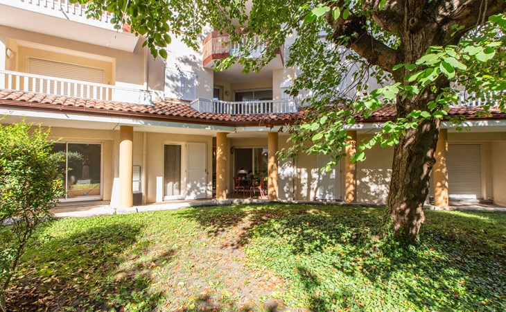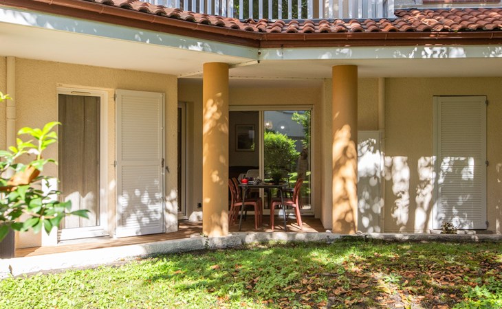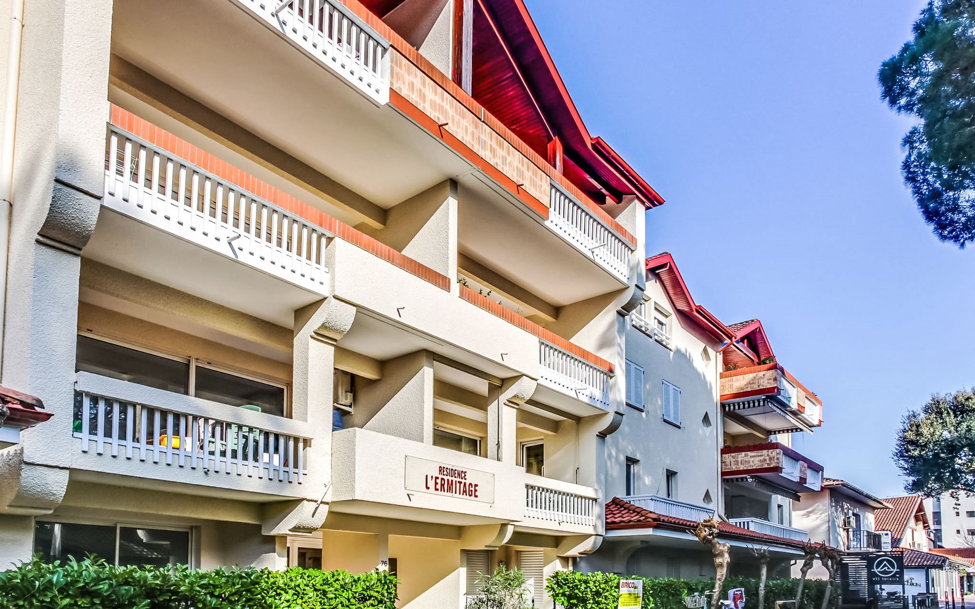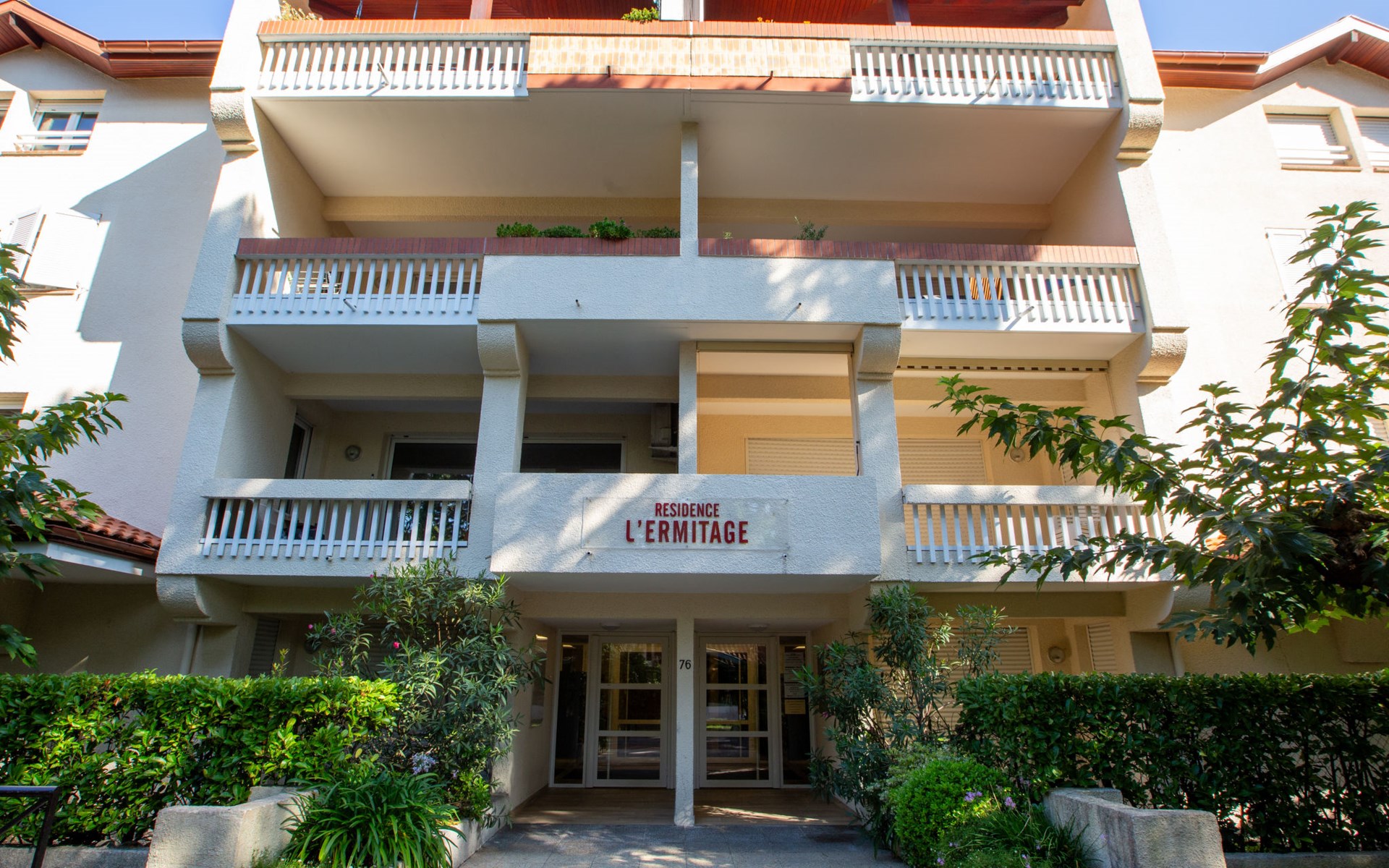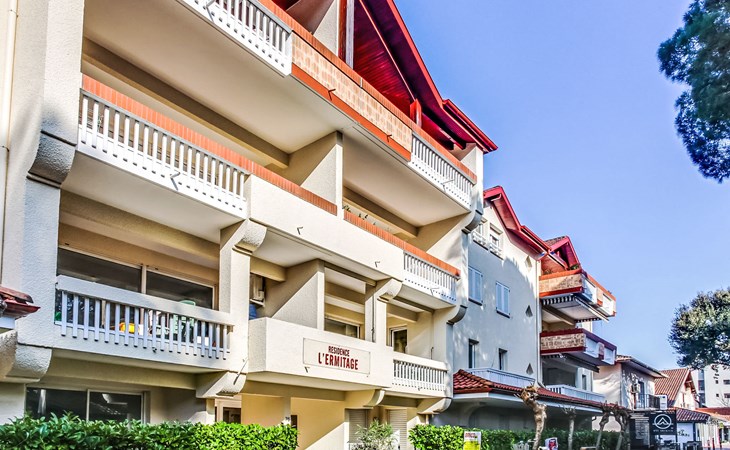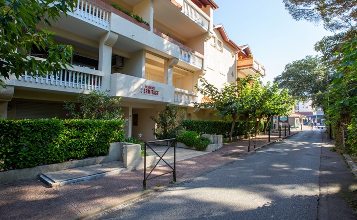 Beautiful residence "Ermitage", 3 storeys. In the centre of la ville, 1.5 km from the sea, 200 m from the lake, 1.5 km from the beach. Public parking 10 m extra. Restaurant, bar 30 m, bus stop 600 m, sandy beach 2 km. Golf course (18 hole) 500 m. Please note: suitable for families. Groups of teenagers on request only. There is a kinesio therapy, a dentist and a veterinary practise on the ground floor.