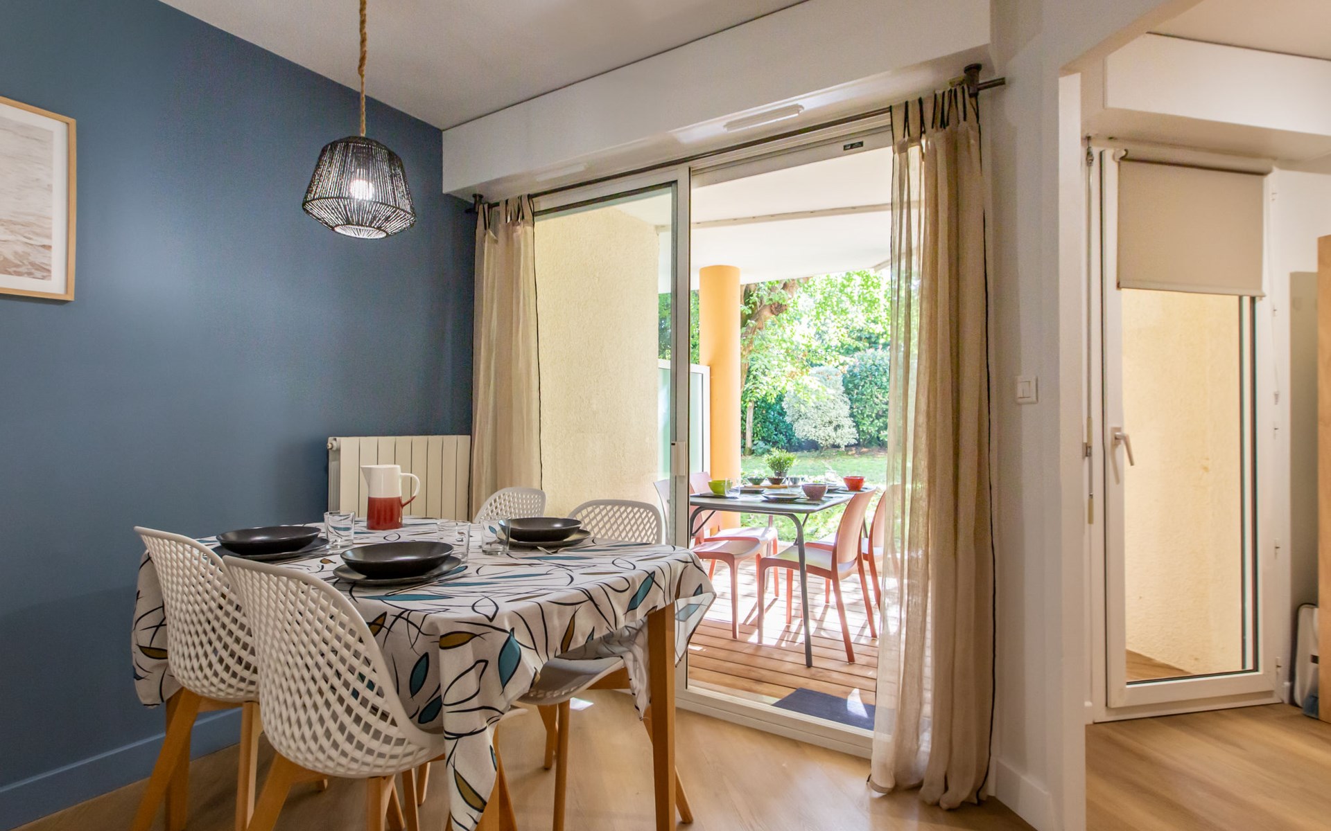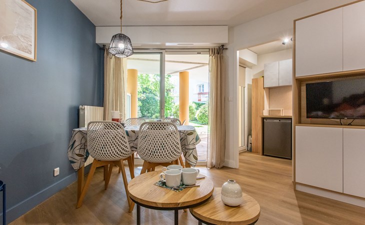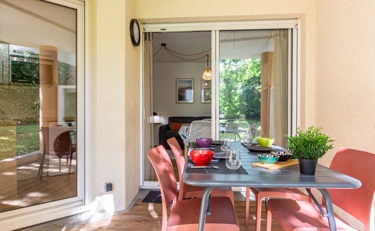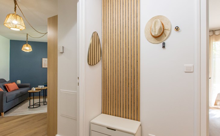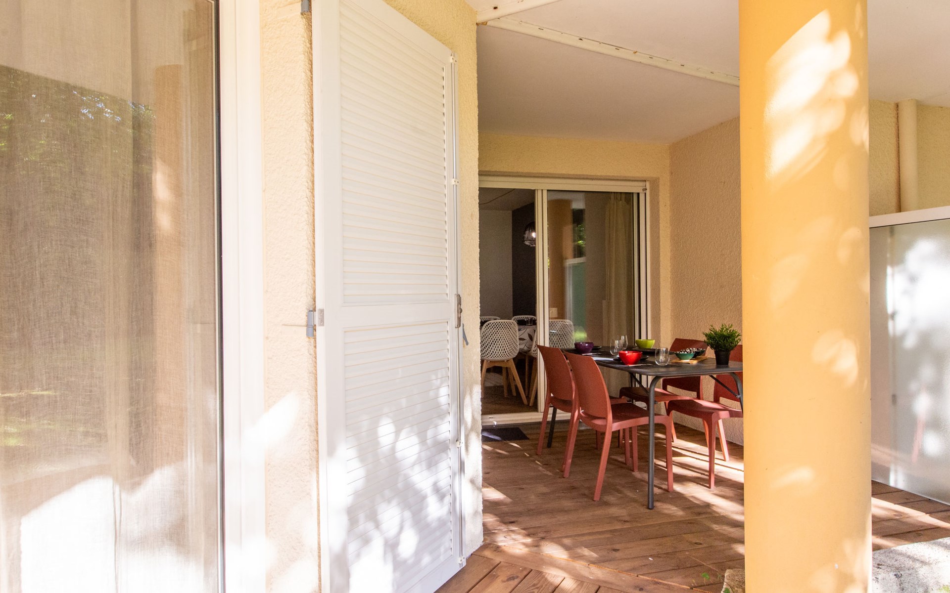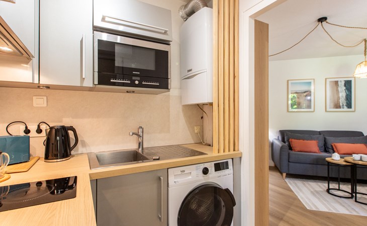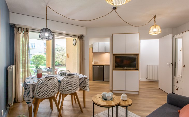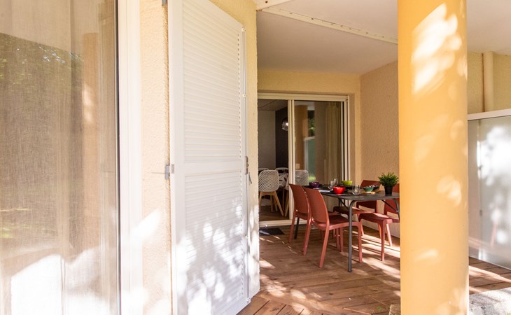 Beautiful residence "Ermitage", 3 storeys. In the centre of la ville, 1.5 km from the sea, 200 m from the lake, 1.5 km from the beach. Public parking 10 m extra. Restaurant, bar 30 m, bus stop 600 m, sandy beach 2 km. Golf course (18 hole) 500 m. Please note: suitable for families. Groups of teenagers on request only. There is a kinesio therapy, a dentist and a veterinary practise on the ground floor.