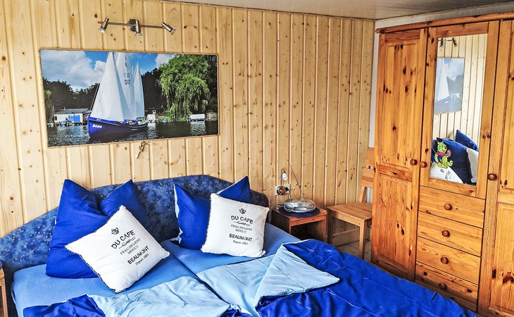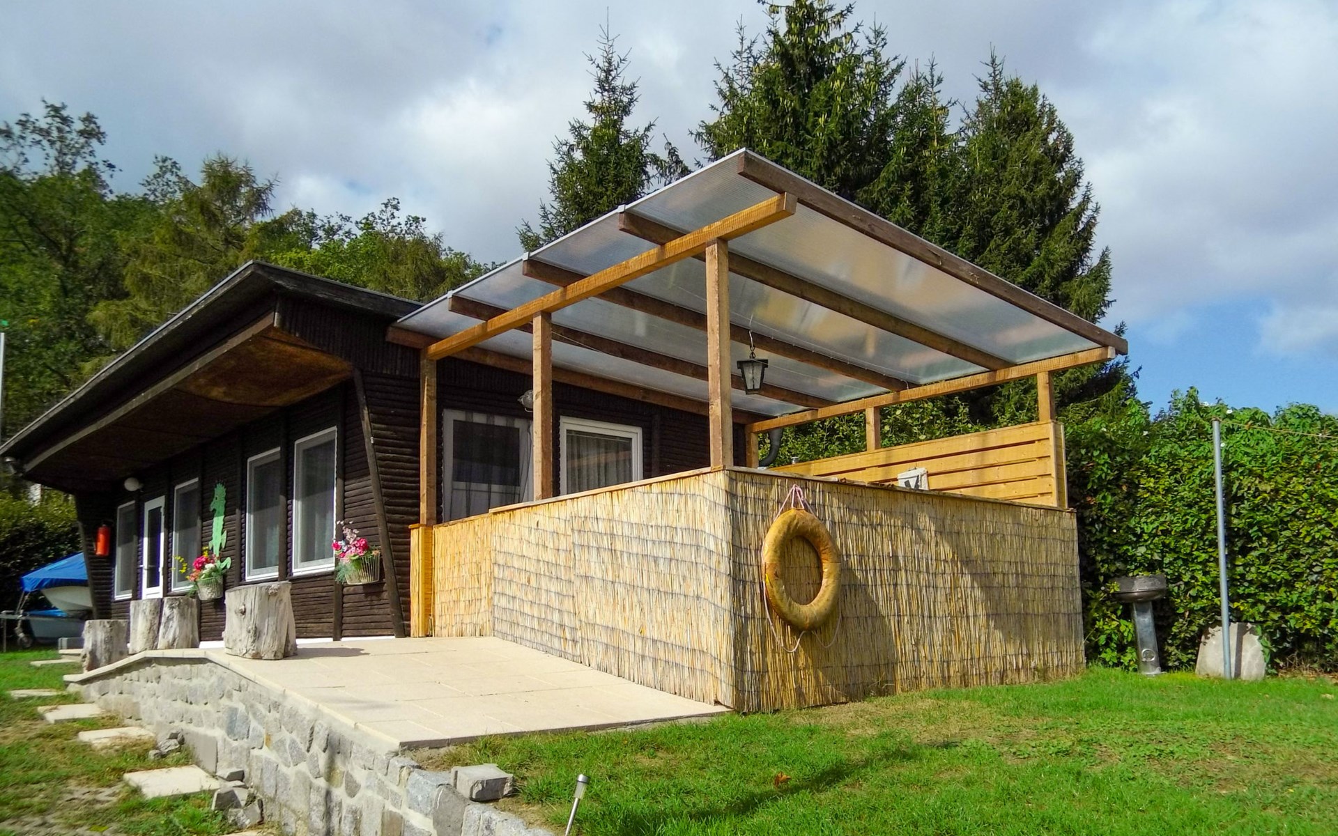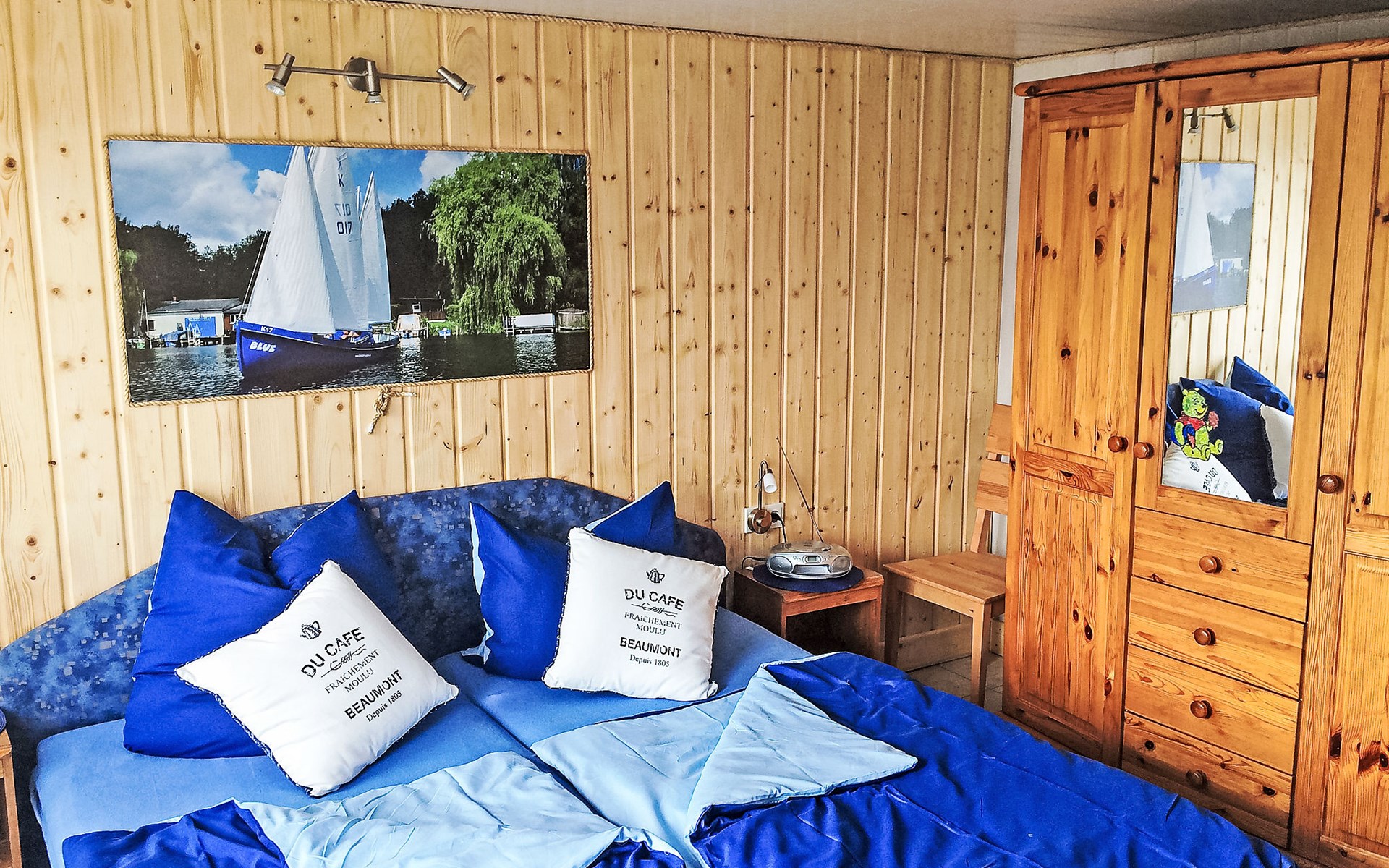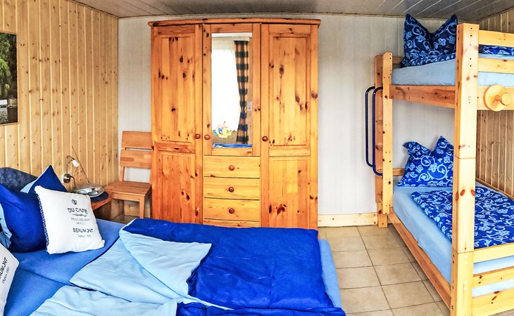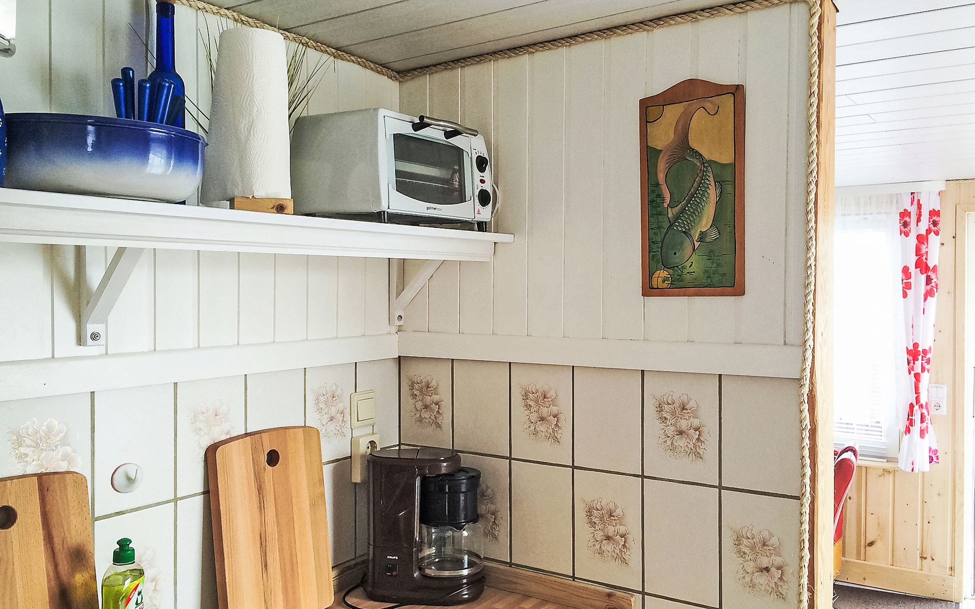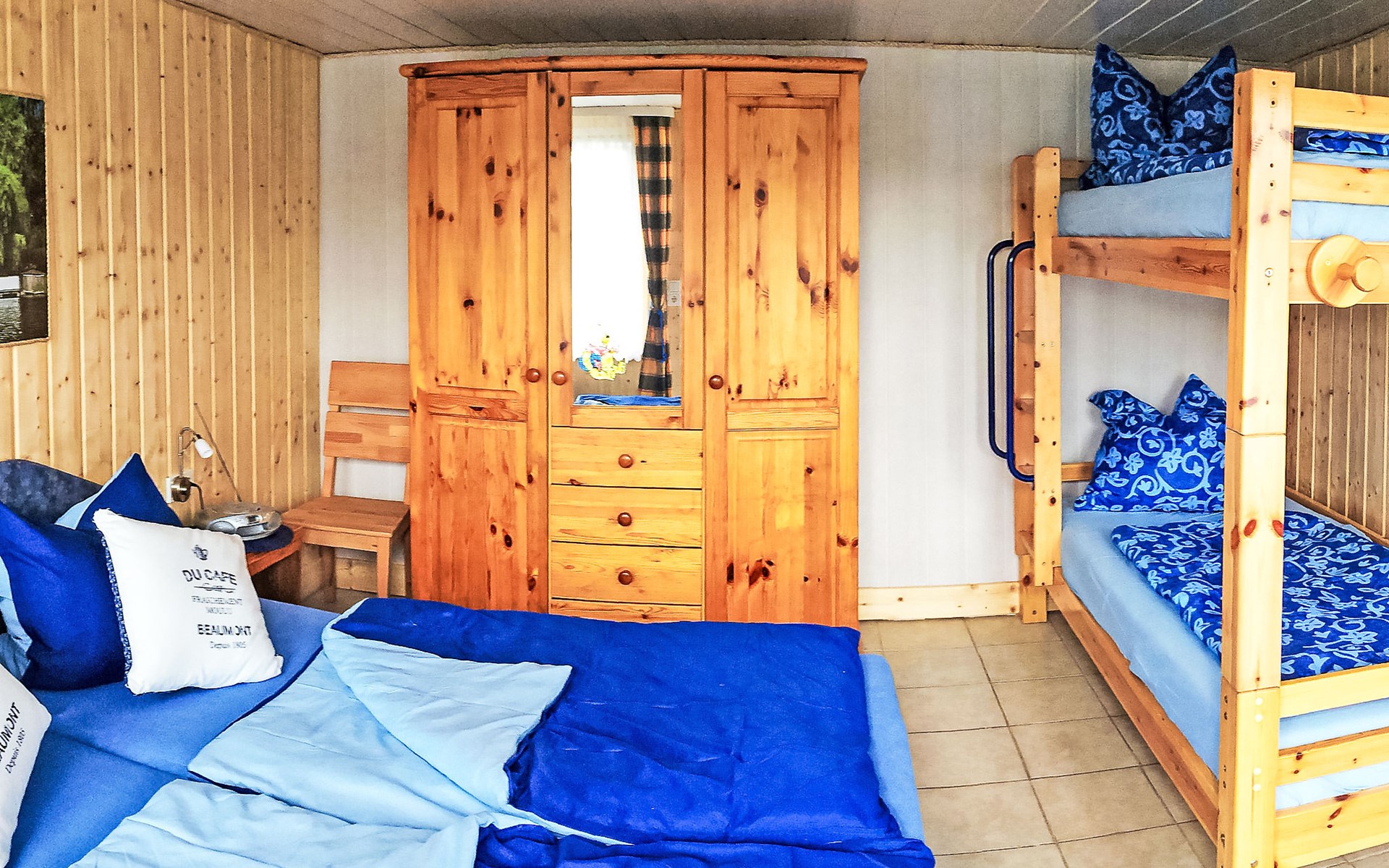 Simple timber house "Güstrower Chaussee". 800 m from the centre of Krakow, on the lake. For shared use: lawn for sunbathing. Private: barbecue. Shop 800 m, restaurant 300 m, bus stop "Krakow am See,Güstrower Chaussee" 300 m, railway station "Güstrow" 20 km. Golf course (18 hole) 10 km. Please note: car recommended. This wooden house overlooking the lake (Krakowersee) provides good opportunities for fishing. It is set back from the main road, on the ground of a sailing club. Private beach and jetty. Rowing boat available free of charge. Motorboat (no license) available on request and charges.