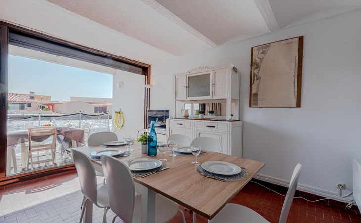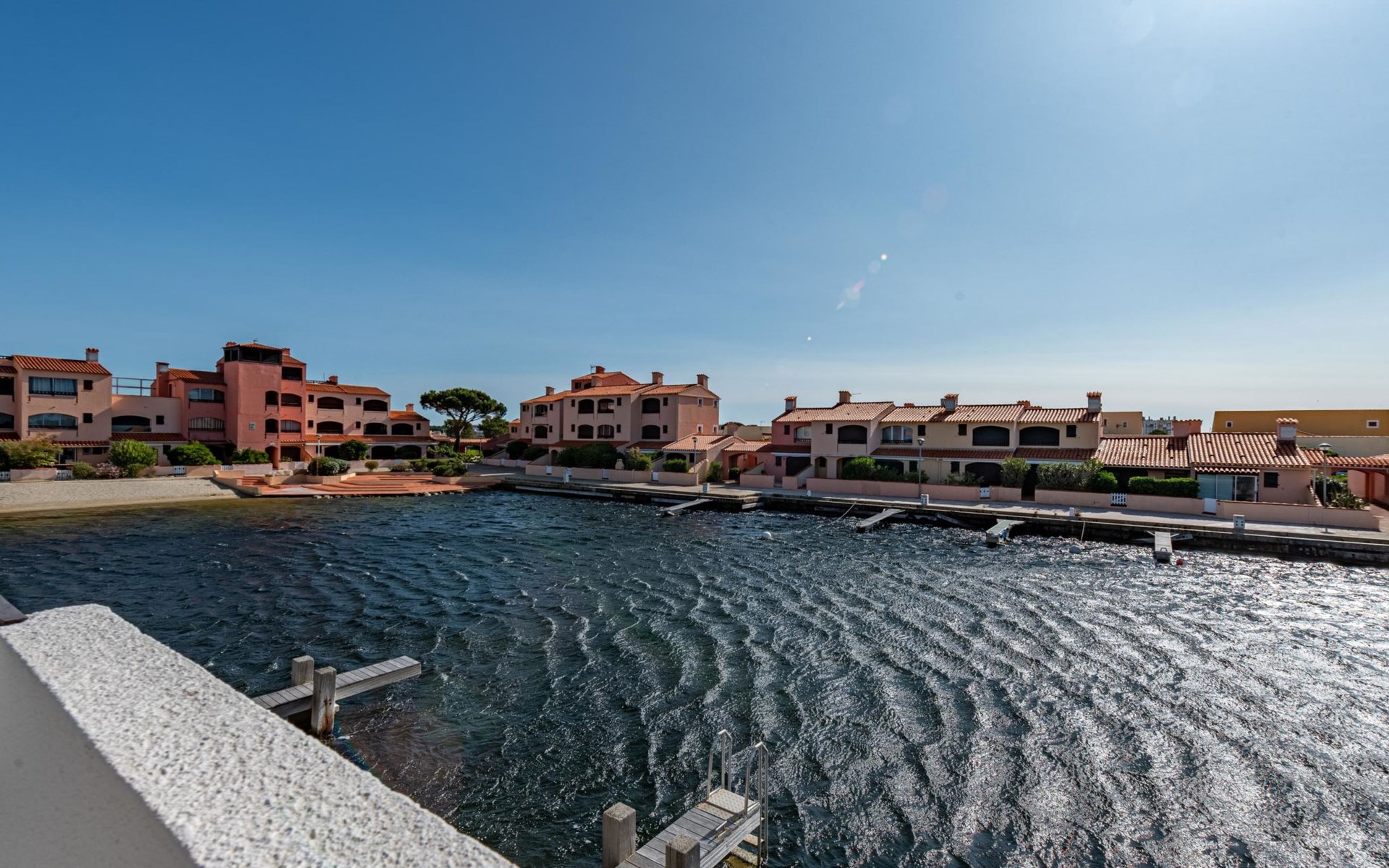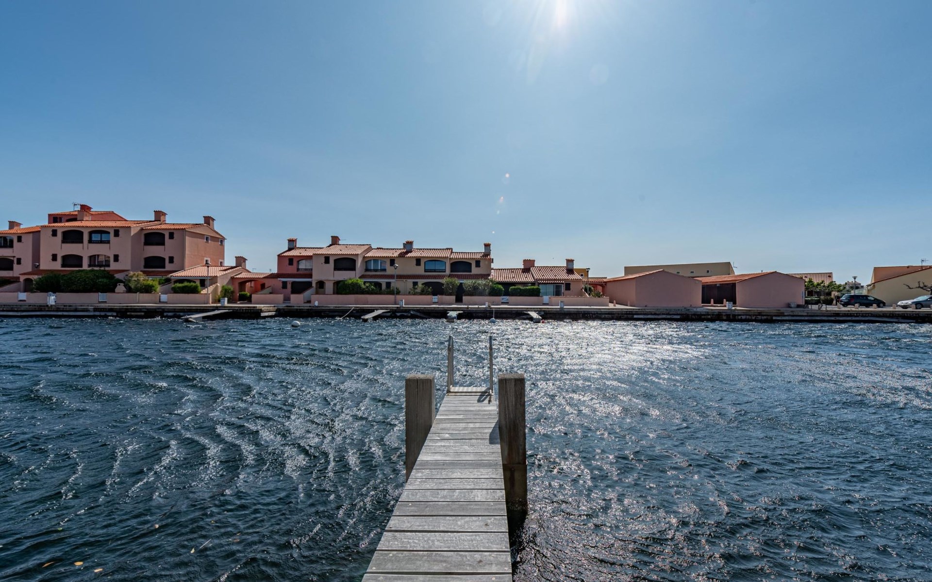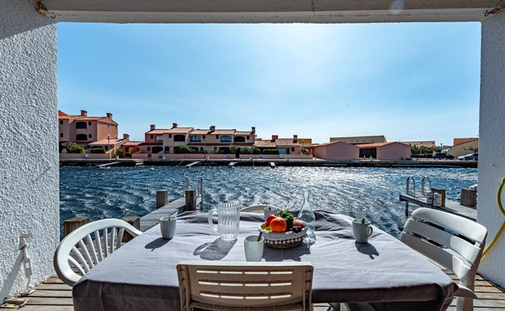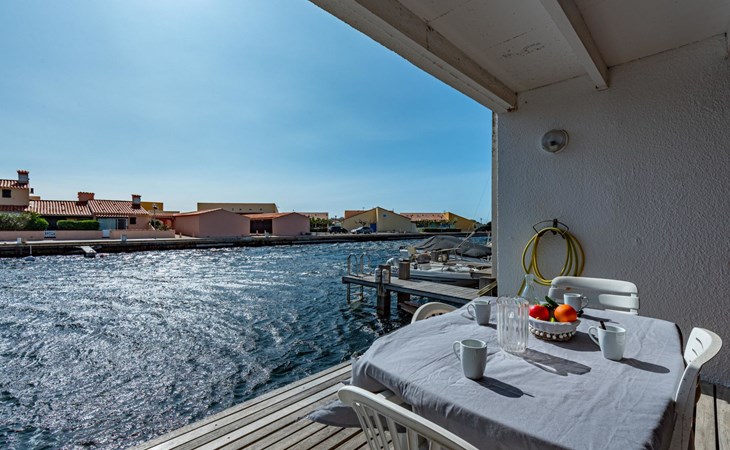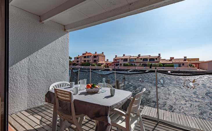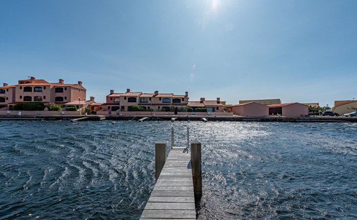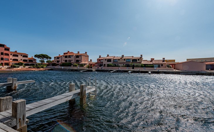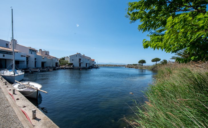 Residence "Les Brigantins". On the outskirts, 3 km from the sea, 50 m from the lake, 3 km from the beach, in a cul-de-sac. For shared use: natural pond, public parking 80 m. Grocery 3 km, supermarket 5 km, shopping centre 4 km, restaurant 2 km, bar 2 km, bakery 3 km, bus stop "Le Barcarès" 600 m, railway station "La Franqui" 16 km, sandy beach 3 km, diving center 6 km, outdoor swimming pool 4 km, nudist beach 5 km. Sports harbour 7 km, surf school 1 km, sailing school 3 km, tennis 3 km, minigolf 5 km, riding stable 9 km. Nearby attractions: Aqualand Port Leucate 7 km, Réserve Africaine de Sigean 41 km, Fort de Salses 20 km, Narbonne 55 km, Perpignan 25 km, Barcelone 215 km. Well-known lakes can easily be reached: Etang de Leucate ou Salses 7 km, Lac de Villeneuve de La Raho 28 km. Hiking paths: Sentier du guetteur 8 km, Station meteorologique de Opoul Perillos 25 km, Sentier du littoral Collioure 40 km. Please note: car recommended. Residence with electric gates. The photograph shows a typical example. Additional accommodations can be booked. Protection barrier on the pontoon.