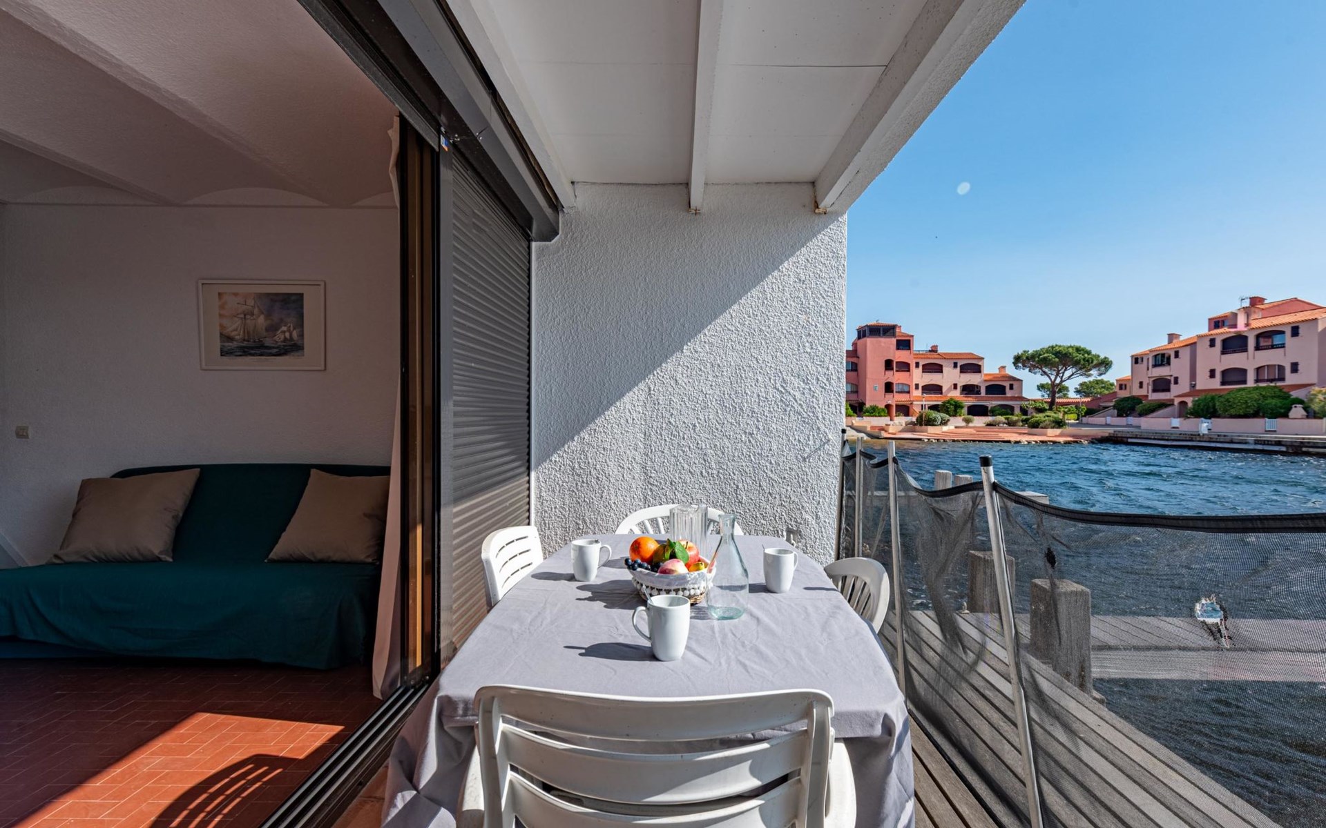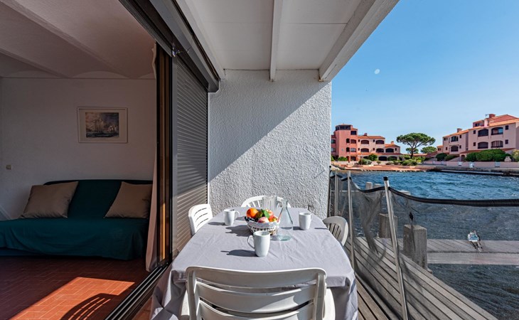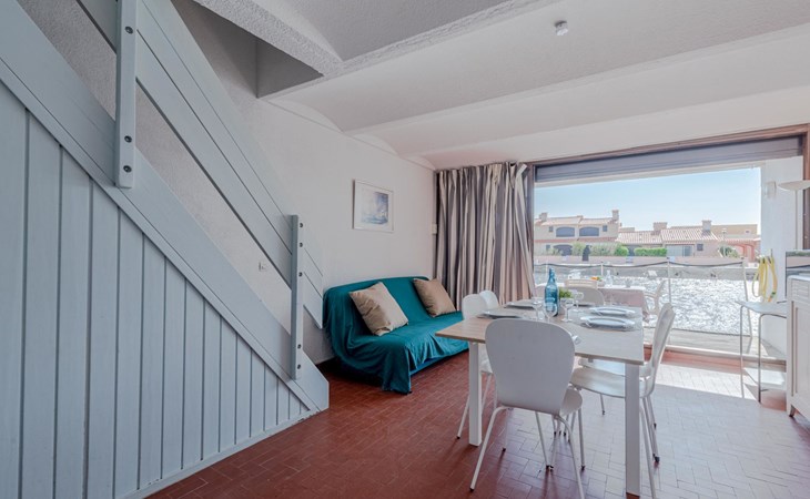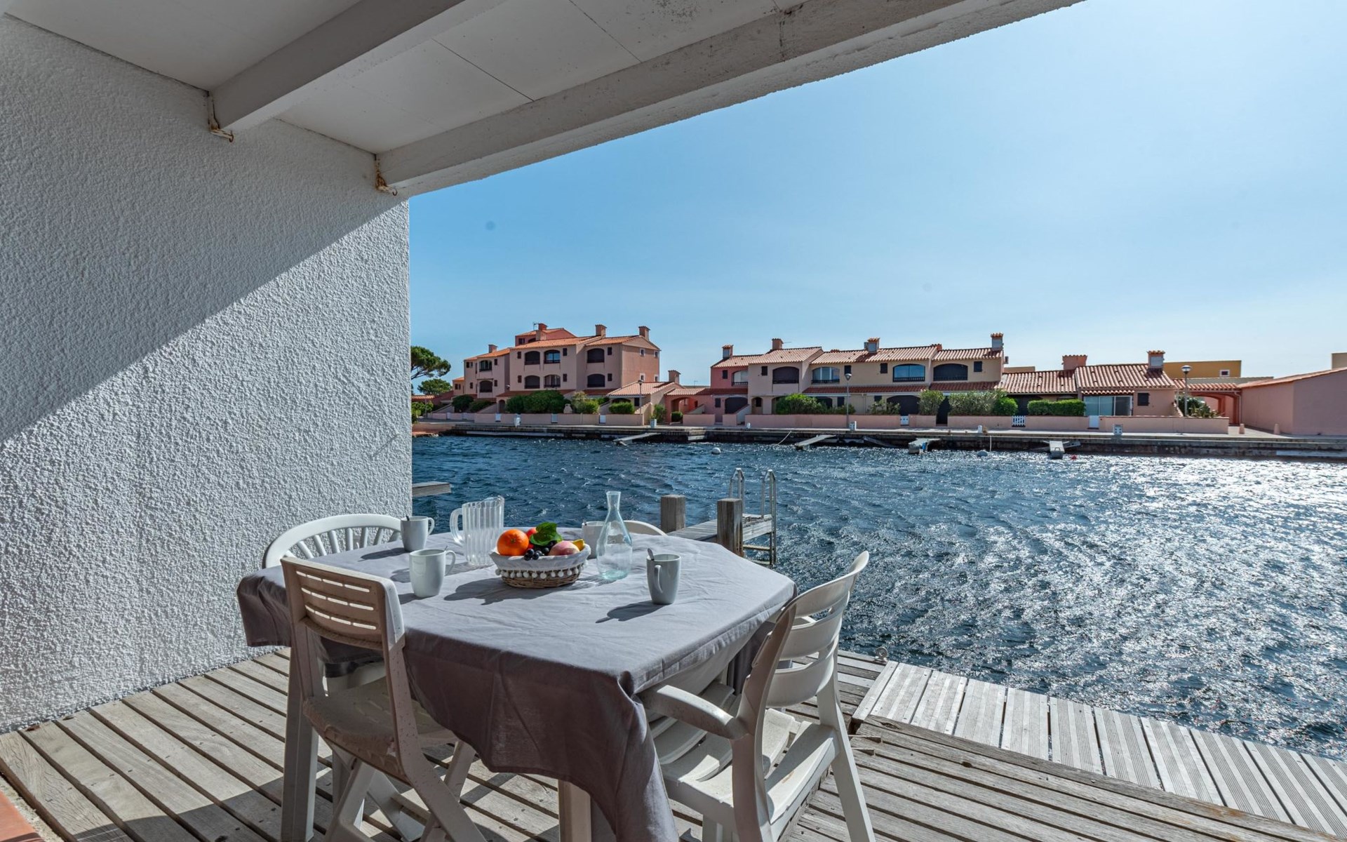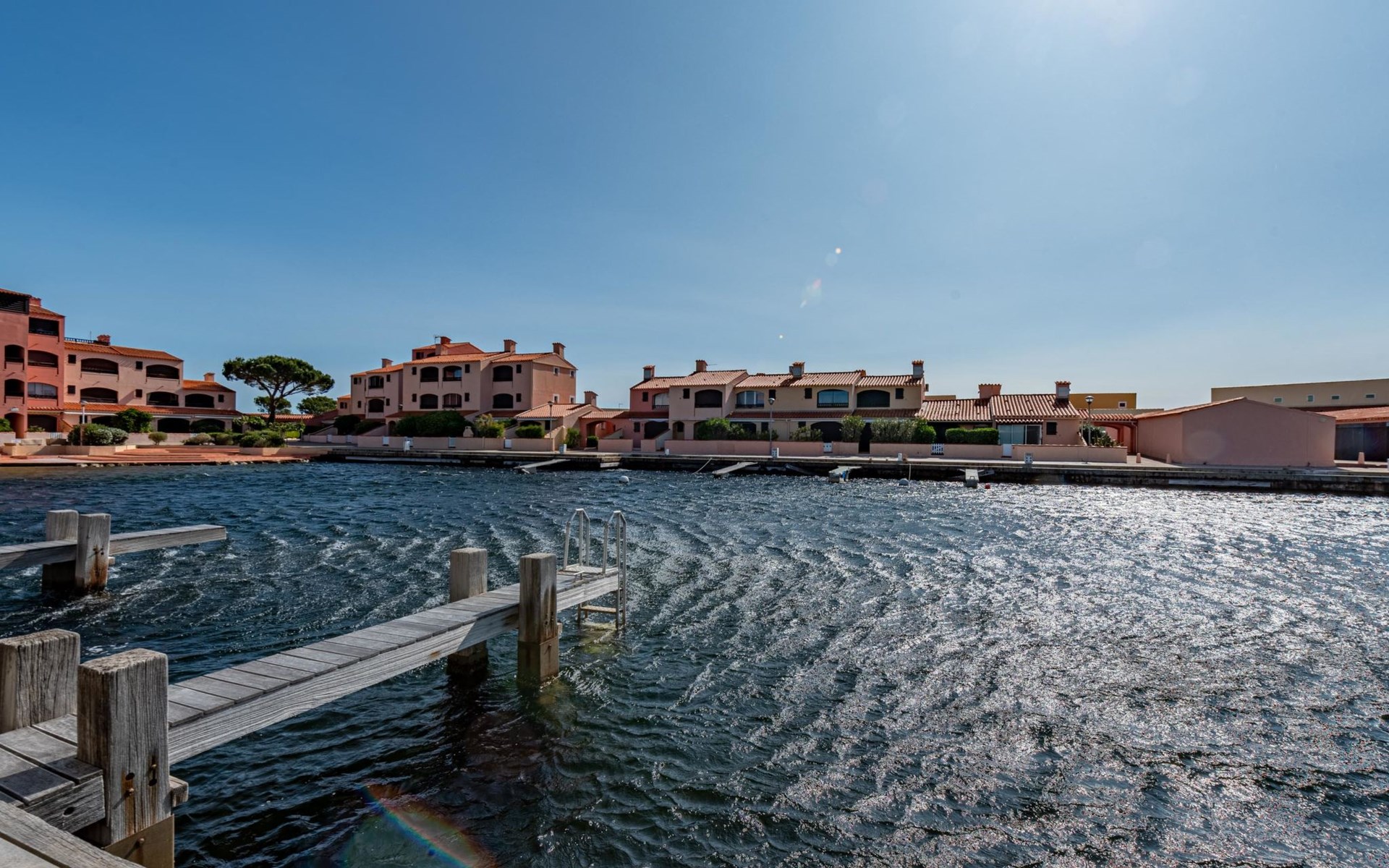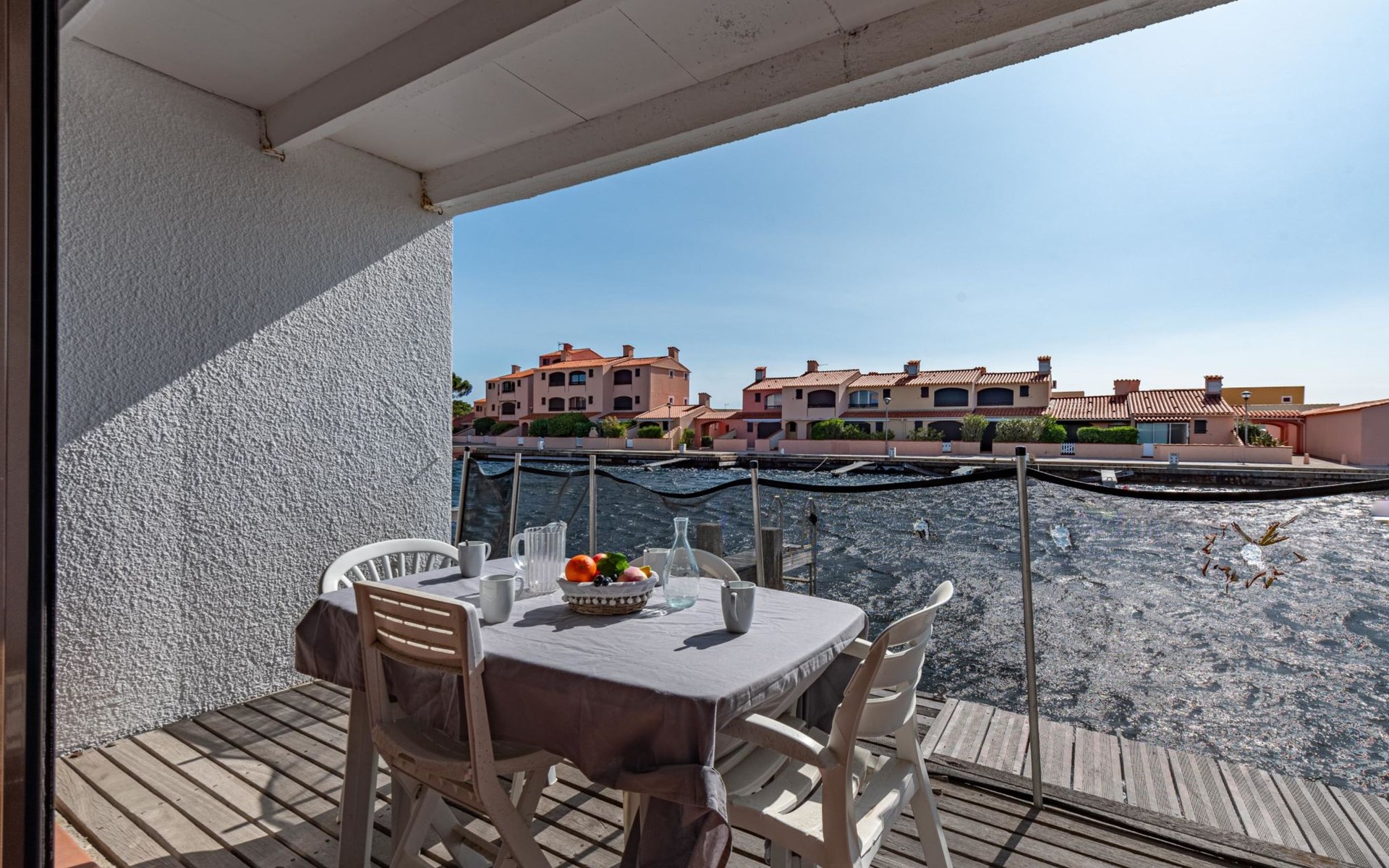 Residence "Les Brigantins". On the outskirts, 3 km from the sea, 50 m from the lake, 3 km from the beach, in a cul-de-sac. For shared use: natural pond, public parking 80 m. Grocery 3 km, supermarket 5 km, shopping centre 4 km, restaurant 2 km, bar 2 km, bakery 3 km, bus stop "Le Barcarès" 600 m, railway station "La Franqui" 16 km, sandy beach 3 km, diving center 6 km, outdoor swimming pool 4 km, nudist beach 5 km. Sports harbour 7 km, surf school 1 km, sailing school 3 km, tennis 3 km, minigolf 5 km, riding stable 9 km. Nearby attractions: Aqualand Port Leucate 7 km, Réserve Africaine de Sigean 41 km, Fort de Salses 20 km, Narbonne 55 km, Perpignan 25 km, Barcelone 215 km. Well-known lakes can easily be reached: Etang de Leucate ou Salses 7 km, Lac de Villeneuve de La Raho 28 km. Hiking paths: Sentier du guetteur 8 km, Station meteorologique de Opoul Perillos 25 km, Sentier du littoral Collioure 40 km. Please note: car recommended. Residence with electric gates. The photograph shows a typical example. Additional accommodations can be booked. Protection barrier on the pontoon.