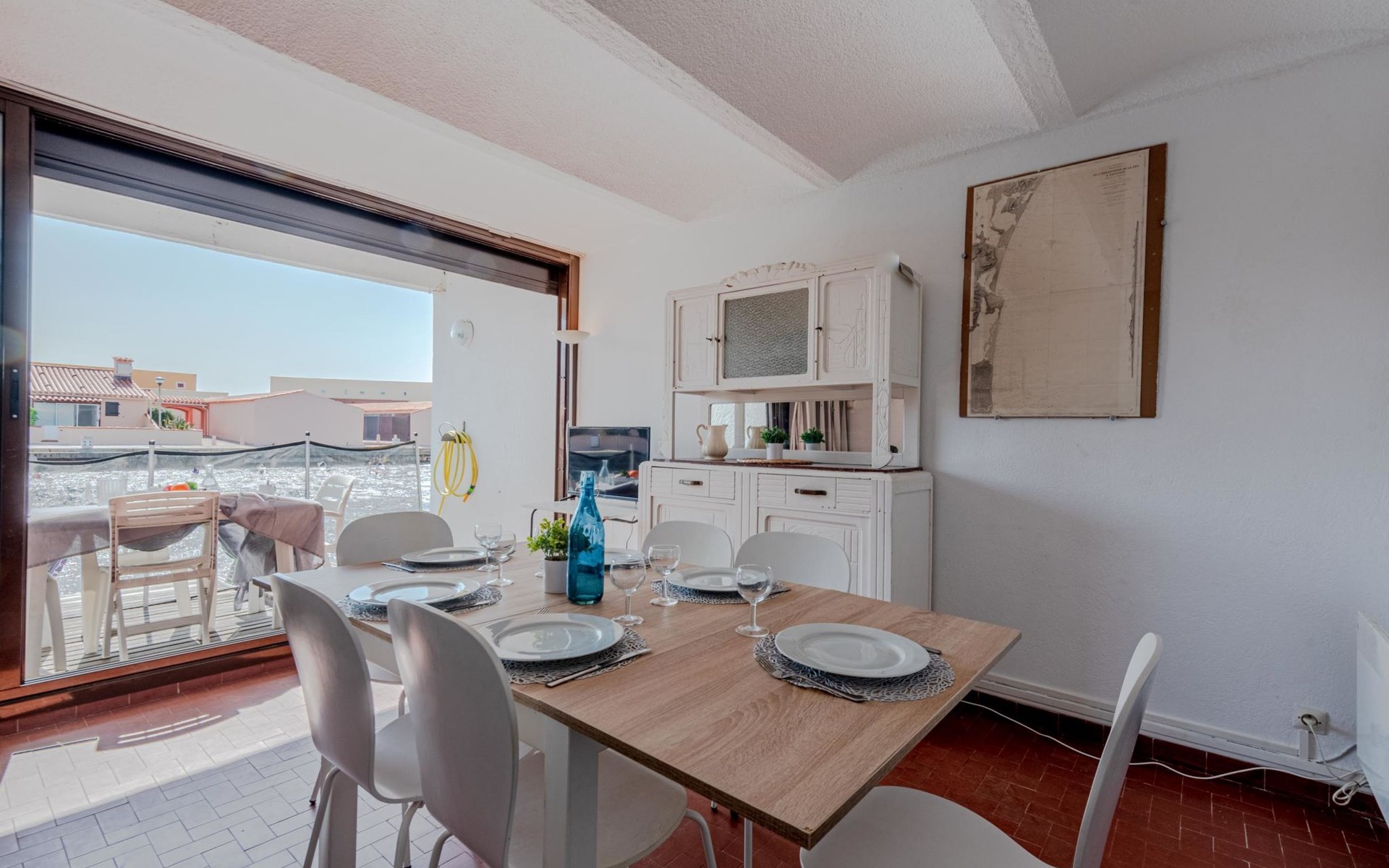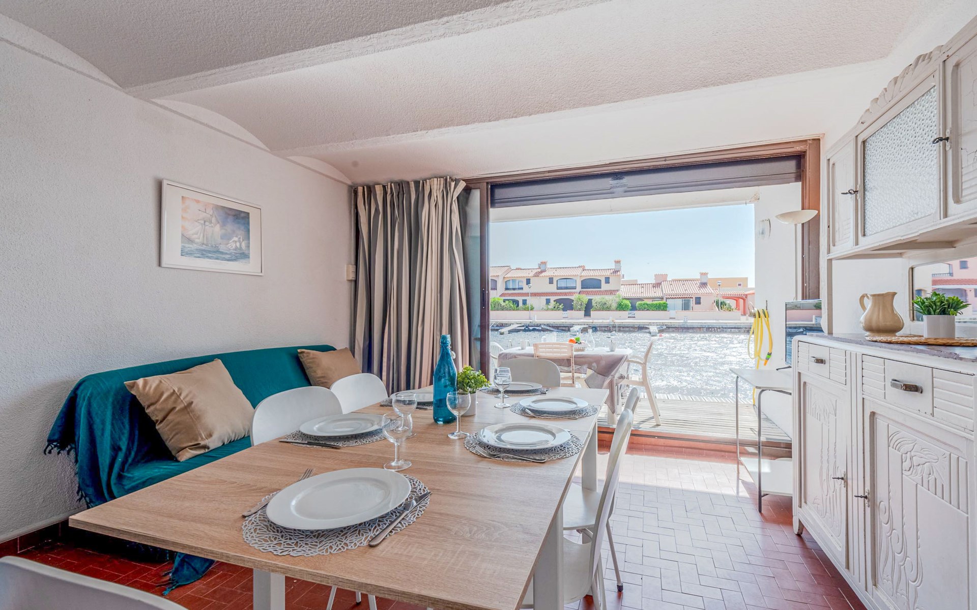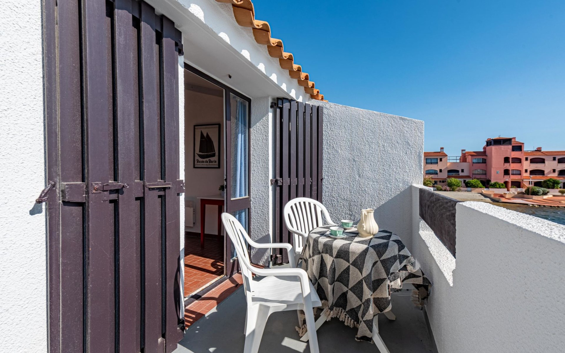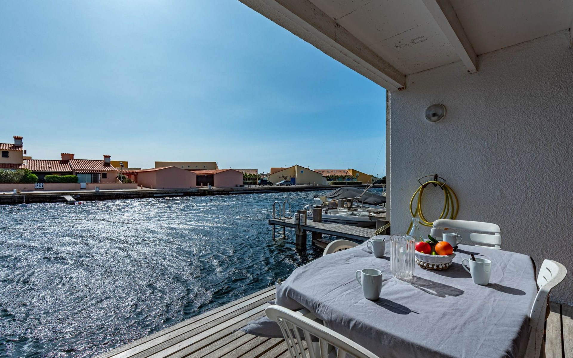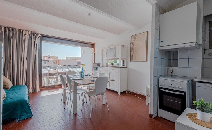Residence "Les Brigantins". On the outskirts, 3 km from the sea, 50 m from the lake, 3 km from the beach, in a cul-de-sac. For shared use: natural pond, public parking 80 m. Grocery 3 km, supermarket 5 km, shopping centre 4 km, restaurant 2 km, bar 2 km, bakery 3 km, bus stop "Le Barcarès" 600 m, railway station "La Franqui" 16 km, sandy beach 3 km, diving center 6 km, outdoor swimming pool 4 km, nudist beach 5 km. Sports harbour 7 km, surf school 1 km, sailing school 3 km, tennis 3 km, minigolf 5 km, riding stable 9 km. Nearby attractions: Aqualand Port Leucate 7 km, Réserve Africaine de Sigean 41 km, Fort de Salses 20 km, Narbonne 55 km, Perpignan 25 km, Barcelone 215 km. Well-known lakes can easily be reached: Etang de Leucate ou Salses 7 km, Lac de Villeneuve de La Raho 28 km. Hiking paths: Sentier du guetteur 8 km, Station meteorologique de Opoul Perillos 25 km, Sentier du littoral Collioure 40 km. Please note: car recommended. Residence with electric gates. The photograph shows a typical example. Additional accommodations can be booked. Protection barrier on the pontoon.