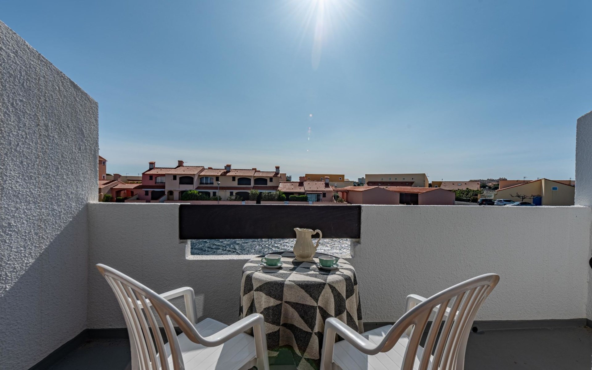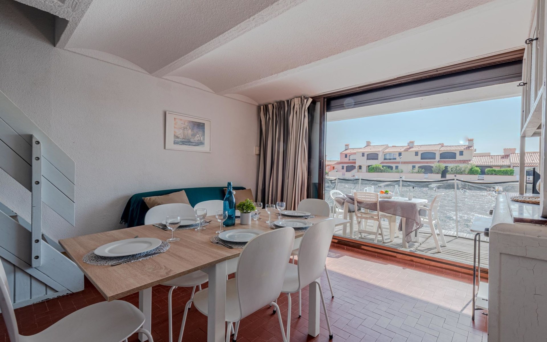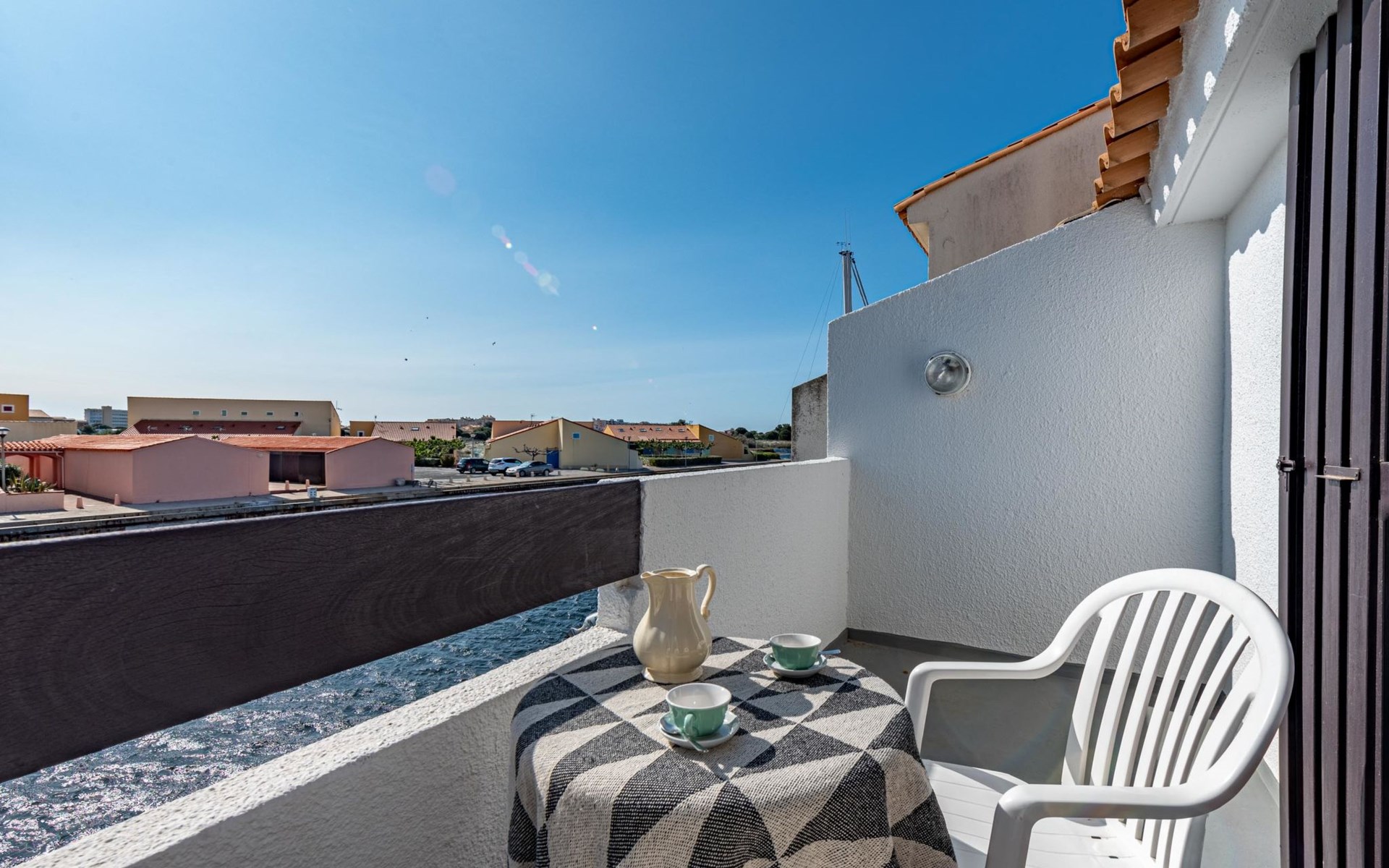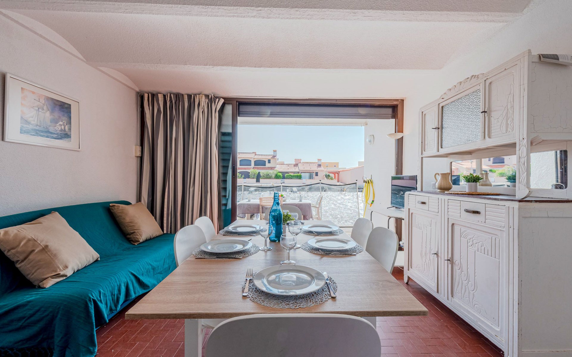 Residence "Les Brigantins". On the outskirts, 3 km from the sea, 50 m from the lake, 3 km from the beach, in a cul-de-sac. For shared use: natural pond, public parking 80 m. Grocery 3 km, supermarket 5 km, shopping centre 4 km, restaurant 2 km, bar 2 km, bakery 3 km, bus stop "Le Barcarès" 600 m, railway station "La Franqui" 16 km, sandy beach 3 km, diving center 6 km, outdoor swimming pool 4 km, nudist beach 5 km. Sports harbour 7 km, surf school 1 km, sailing school 3 km, tennis 3 km, minigolf 5 km, riding stable 9 km. Nearby attractions: Aqualand Port Leucate 7 km, Réserve Africaine de Sigean 41 km, Fort de Salses 20 km, Narbonne 55 km, Perpignan 25 km, Barcelone 215 km. Well-known lakes can easily be reached: Etang de Leucate ou Salses 7 km, Lac de Villeneuve de La Raho 28 km. Hiking paths: Sentier du guetteur 8 km, Station meteorologique de Opoul Perillos 25 km, Sentier du littoral Collioure 40 km. Please note: car recommended. Residence with electric gates. The photograph shows a typical example. Additional accommodations can be booked. Protection barrier on the pontoon.