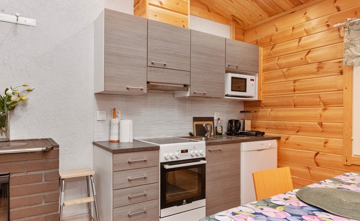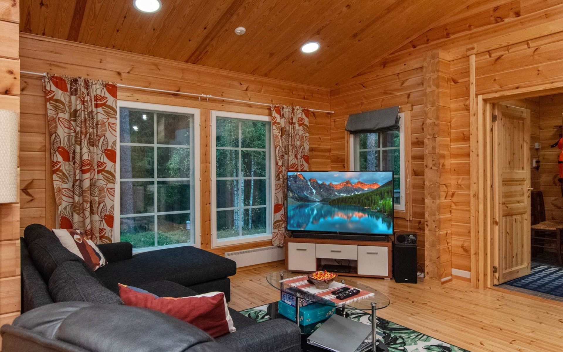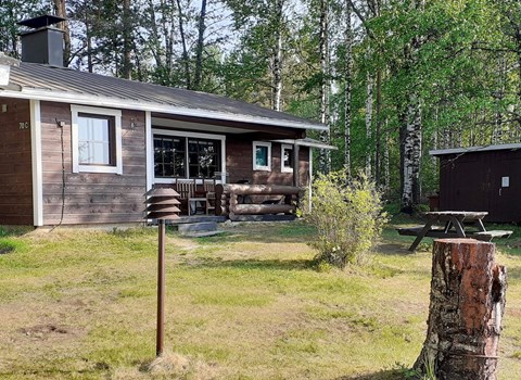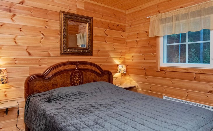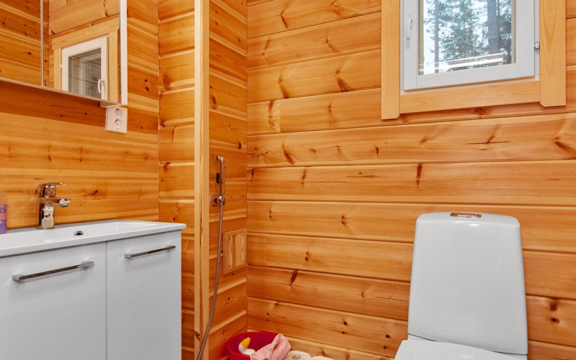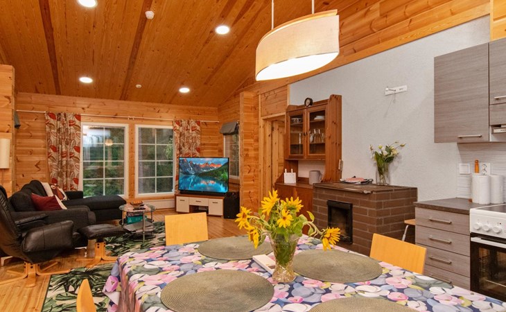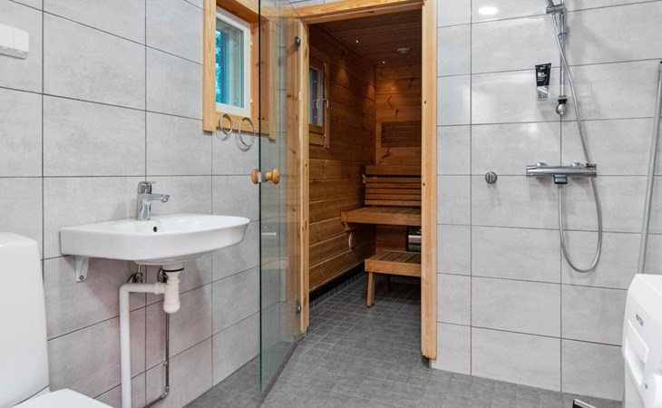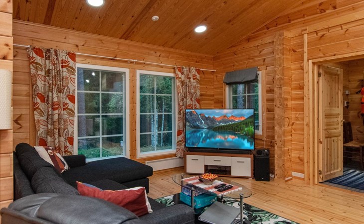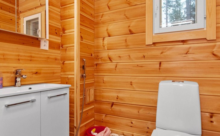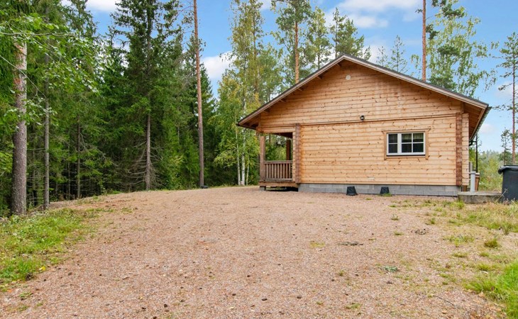 Laminated log cabin 2021, living room/kitchen, bedroom with double bed, another bedroom with two beds, sauna, washroom, dressing room, separate WC, terrace. Air source heat pump with cooling function.