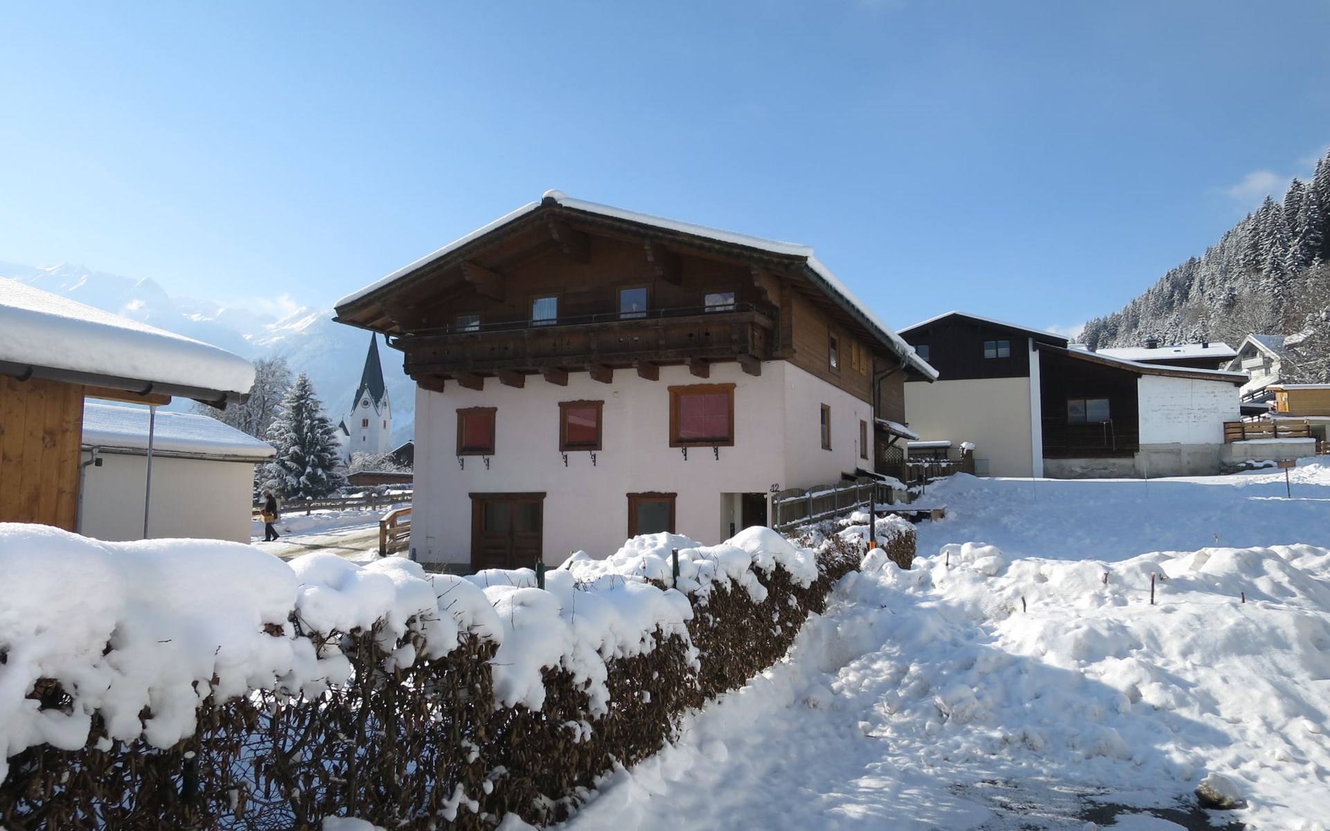 2-family house "Steger". In the centre of Neukirchen, 6 km from the centre of Bramberg, 45 km from the centre of Kitzbühel, 17 km from the lake, 150 m from the skiing area. In the house: storage room for skis, ski boot dryer. Parking on the premises. Shop 50 m, bus stop "Ortsmitte" 500 m, railway station "Rosenthal" 3.7 km. Ski lift, gondola lift, slopes 150 m. Please note: the owner lives in the same residence.
