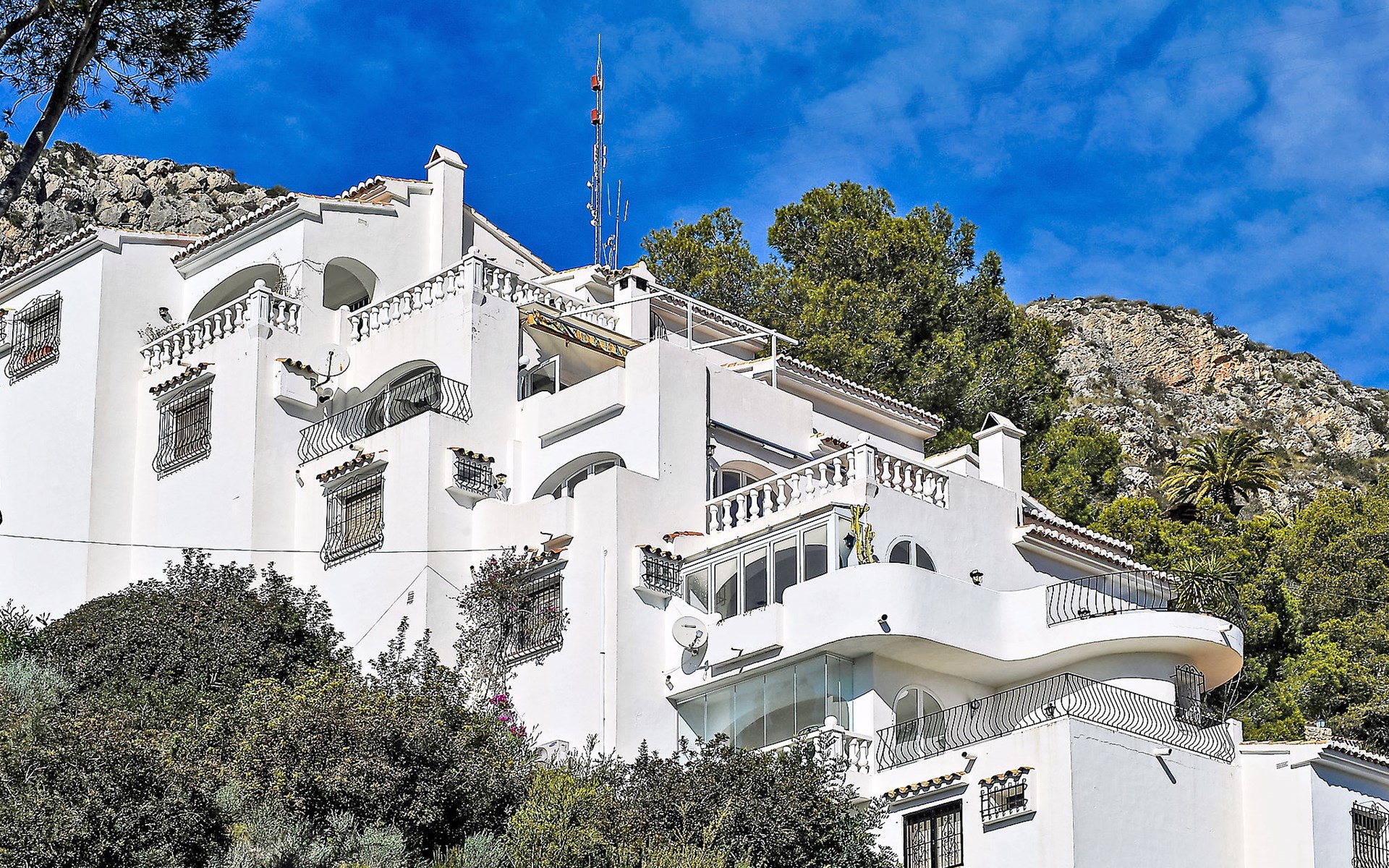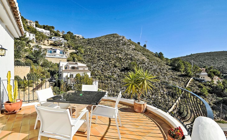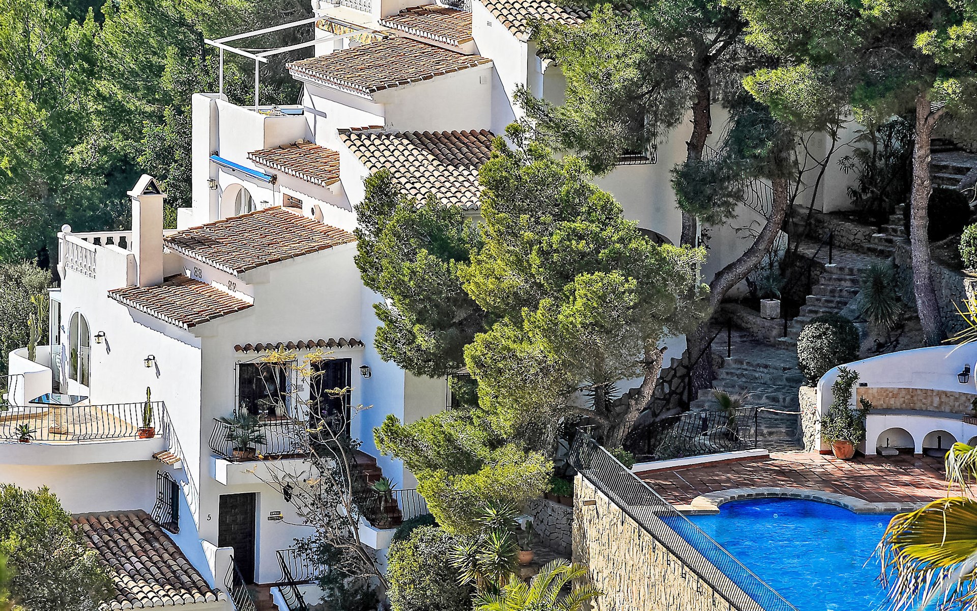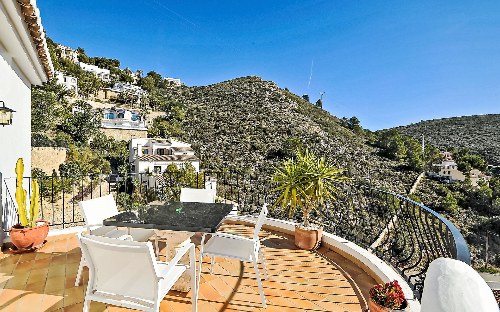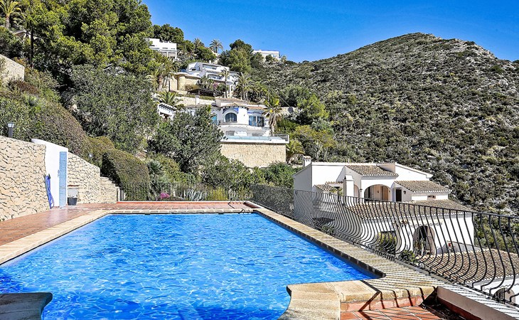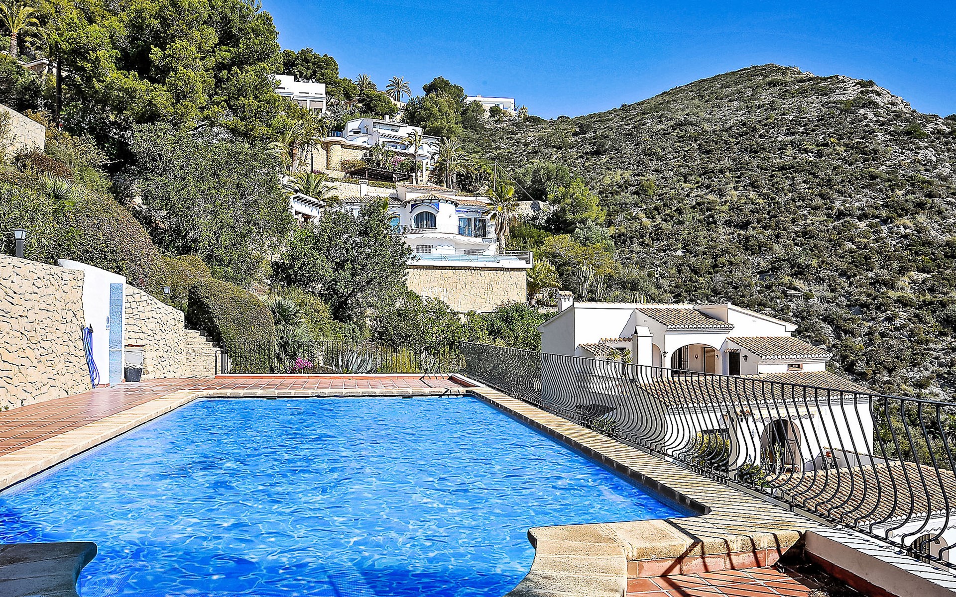 El Portet: Beautiful, comfortable hillside complex "La Colina", semi-detached. 1.7 km from the centre of Moraira, in a quiet, elevated position on a slope, 700 m from the sea, 700 m from the beach. For shared use: swimming pool (11 x 6 m, seasonal availability: 01.May. - 30.Sep.) with internal staircase. Outdoor shower, terrace, garden furniture. Private: terrace, garden furniture. Stepped path (54 steps) to the house. Supermarket, restaurant, bar 950 m, bus stop 2.7 km, sandy beach 700 m. Please note: car recommended. The owner does not accept any youth groups.