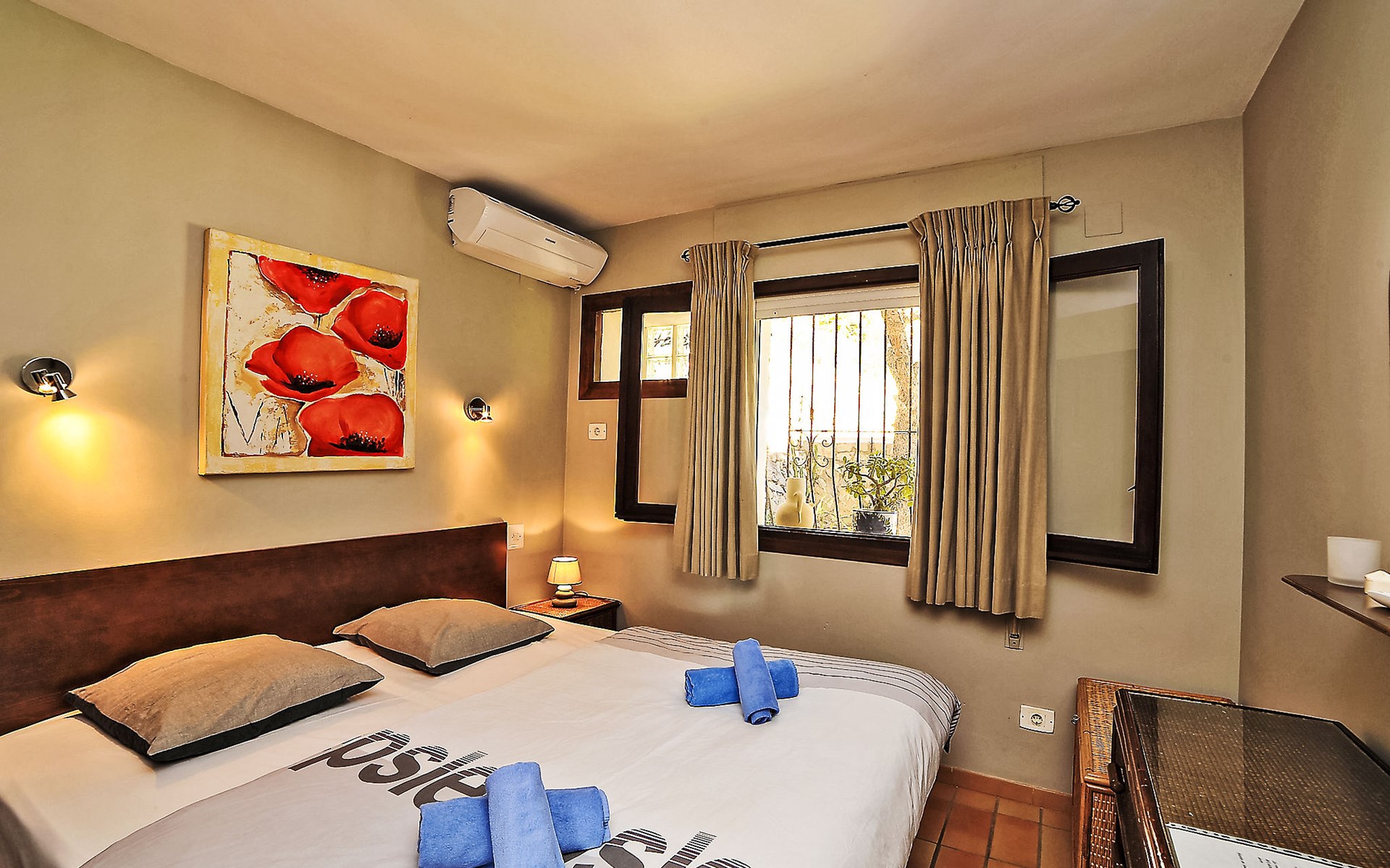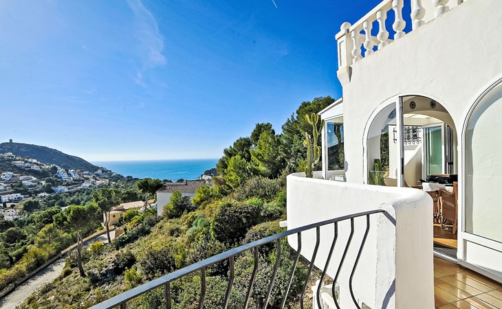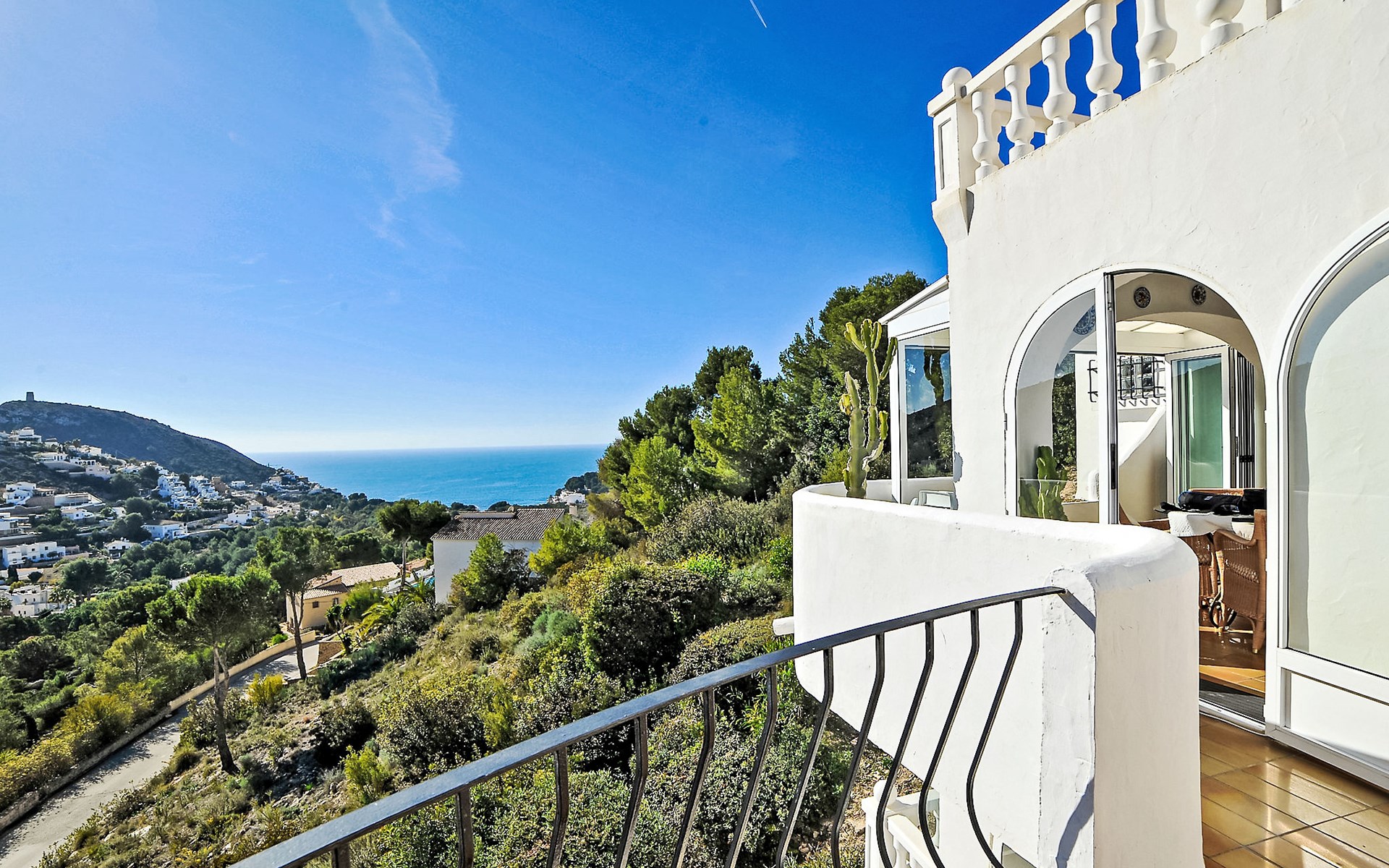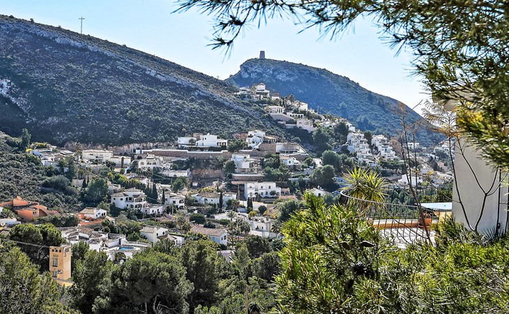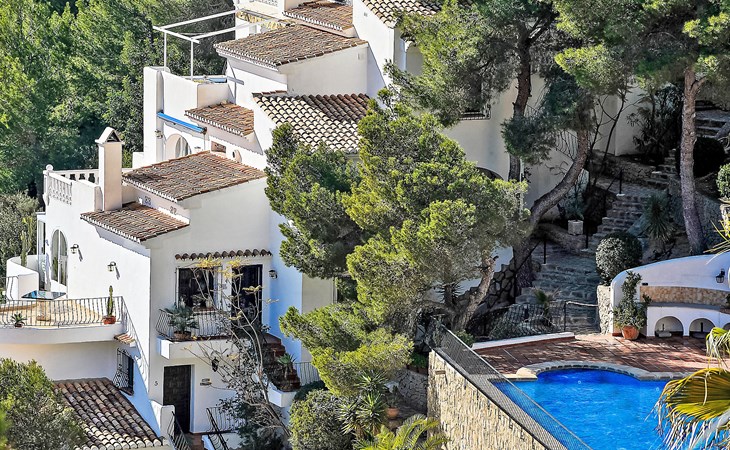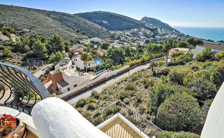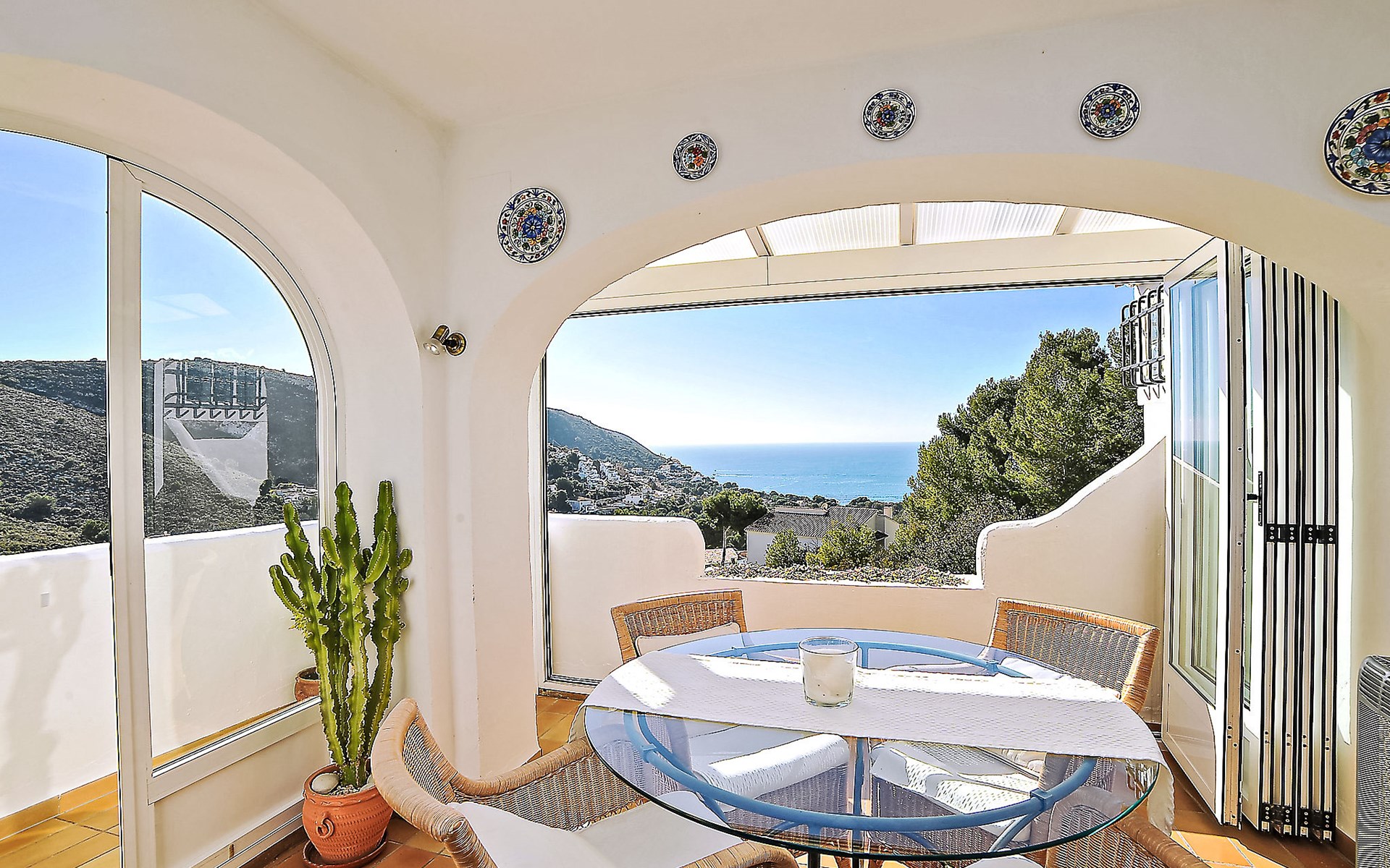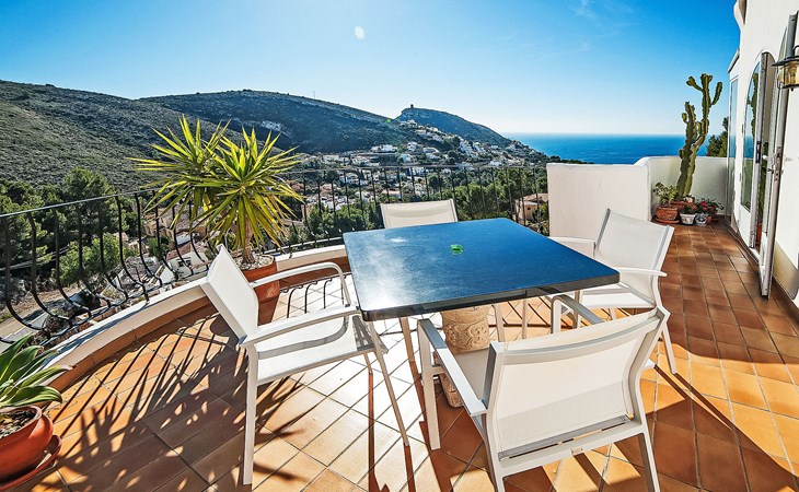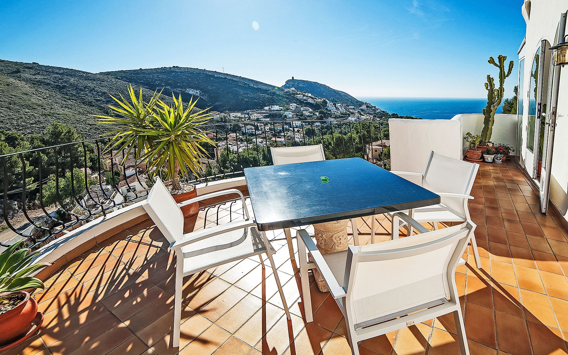 El Portet: Beautiful, comfortable hillside complex "La Colina", semi-detached. 1.7 km from the centre of Moraira, in a quiet, elevated position on a slope, 700 m from the sea, 700 m from the beach. For shared use: swimming pool (11 x 6 m, seasonal availability: 01.May. - 30.Sep.) with internal staircase. Outdoor shower, terrace, garden furniture. Private: terrace, garden furniture. Stepped path (54 steps) to the house. Supermarket, restaurant, bar 950 m, bus stop 2.7 km, sandy beach 700 m. Please note: car recommended. The owner does not accept any youth groups.