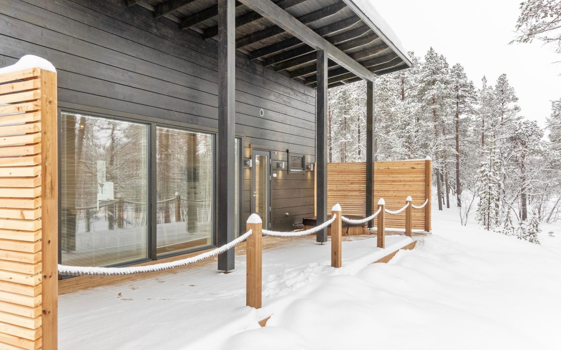 The log house was completed in 2024 and features a living room/kitchen with a sofa bed, two bedrooms each with two beds, a sauna, a bathroom, dressing room, separate WC, and a large covered terrace.