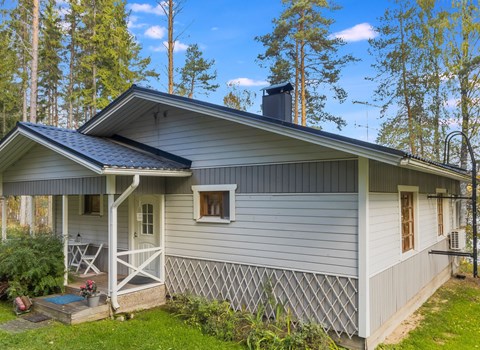 Wood-built villa, completely renovated in 2014, living room/kitchen with spreadable bed for two, double bed and cot in the bedroom (12 m²), double bed in the another bedroom (9 m²), separate WC, dressing room, washroom and wood-burning sauna stove in the sauna.