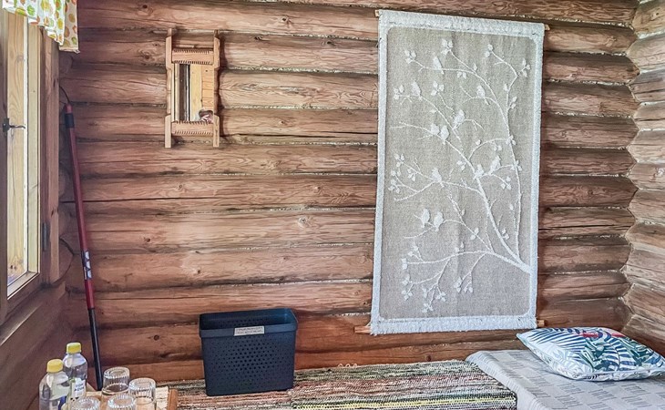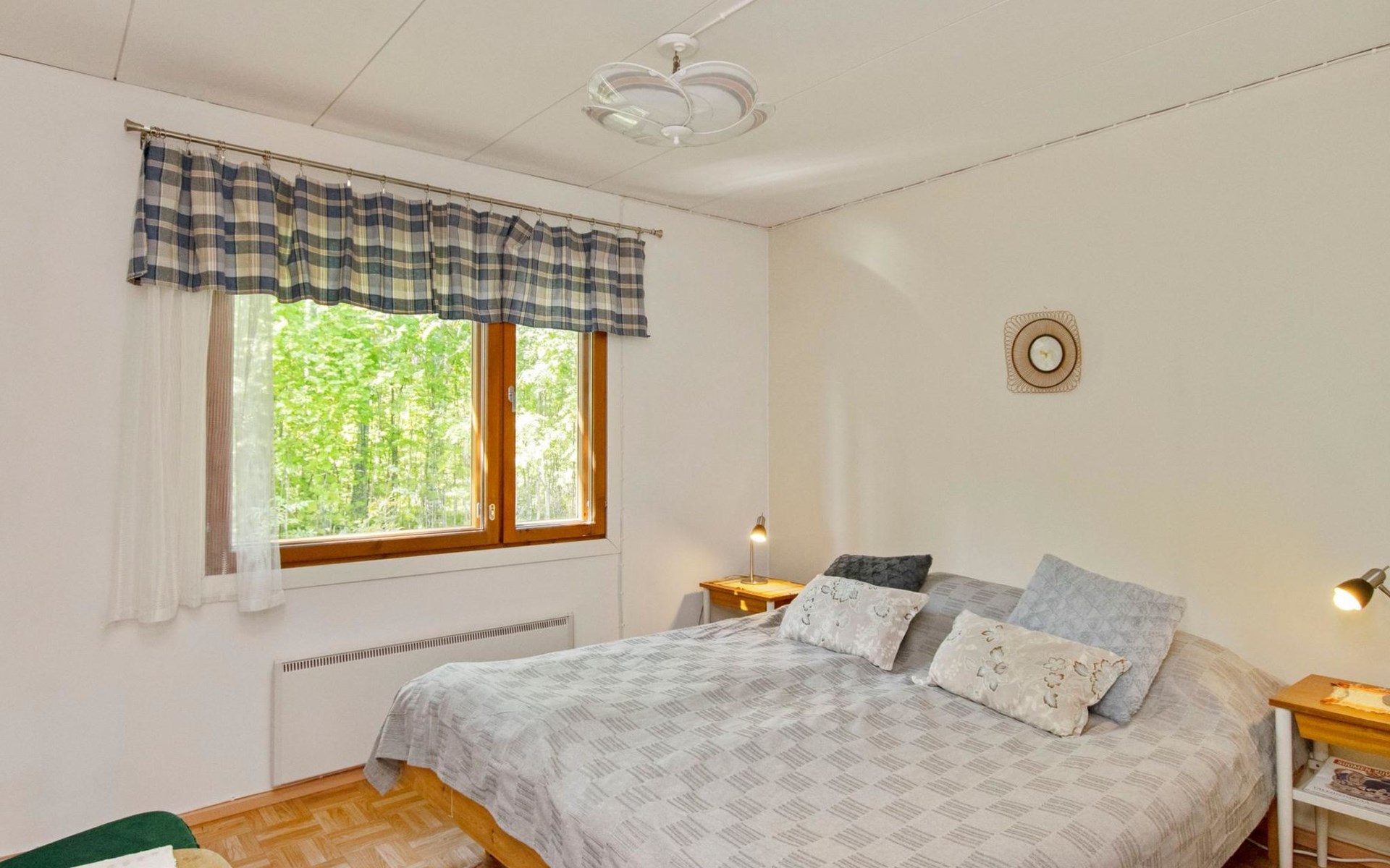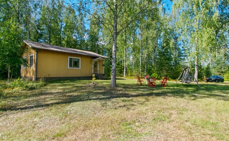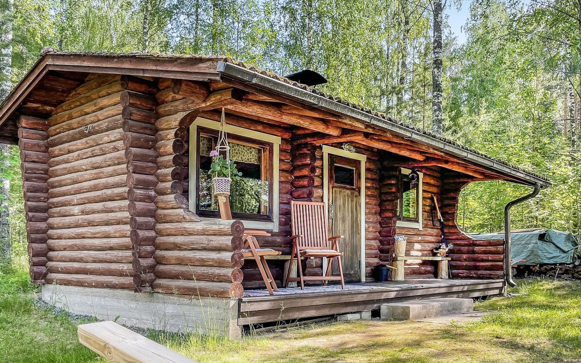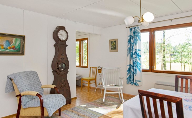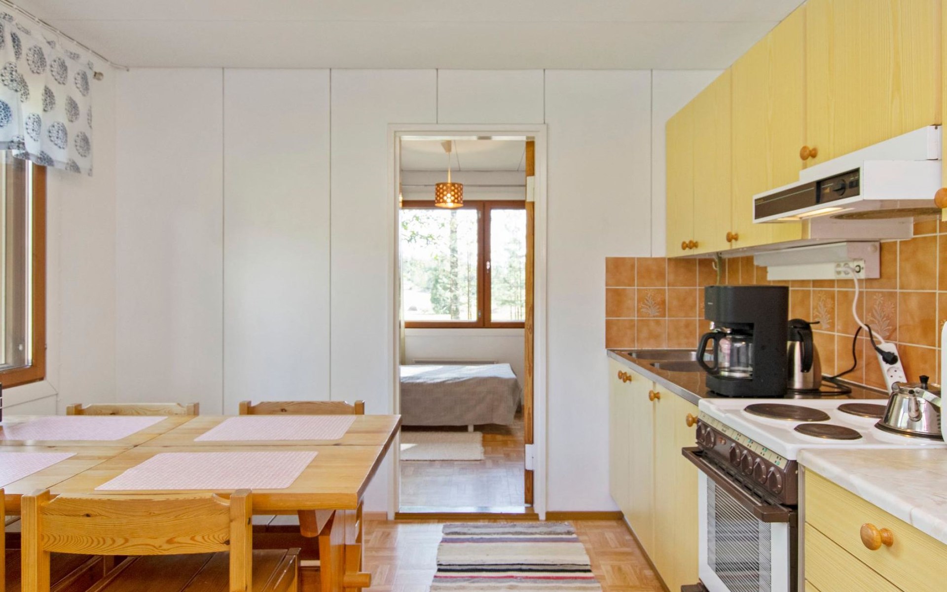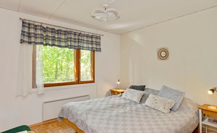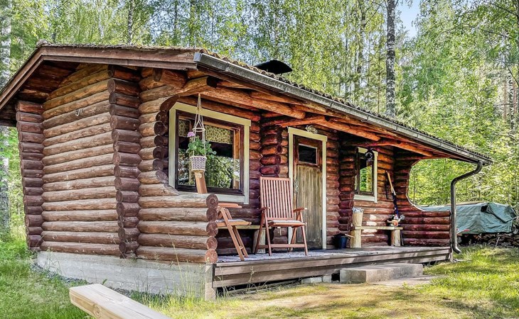 Wooden cabin 1966, renovated in 1984, interior surfaces are renovated in 2021, living room, kitchen. Two beds in bedroom, one bed in another bedroom (bedrooms windows have blackout curtains). WC and shower in washroom, electric sauna stove in sauna.