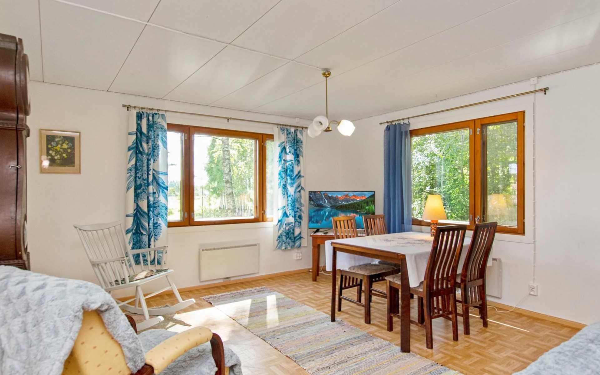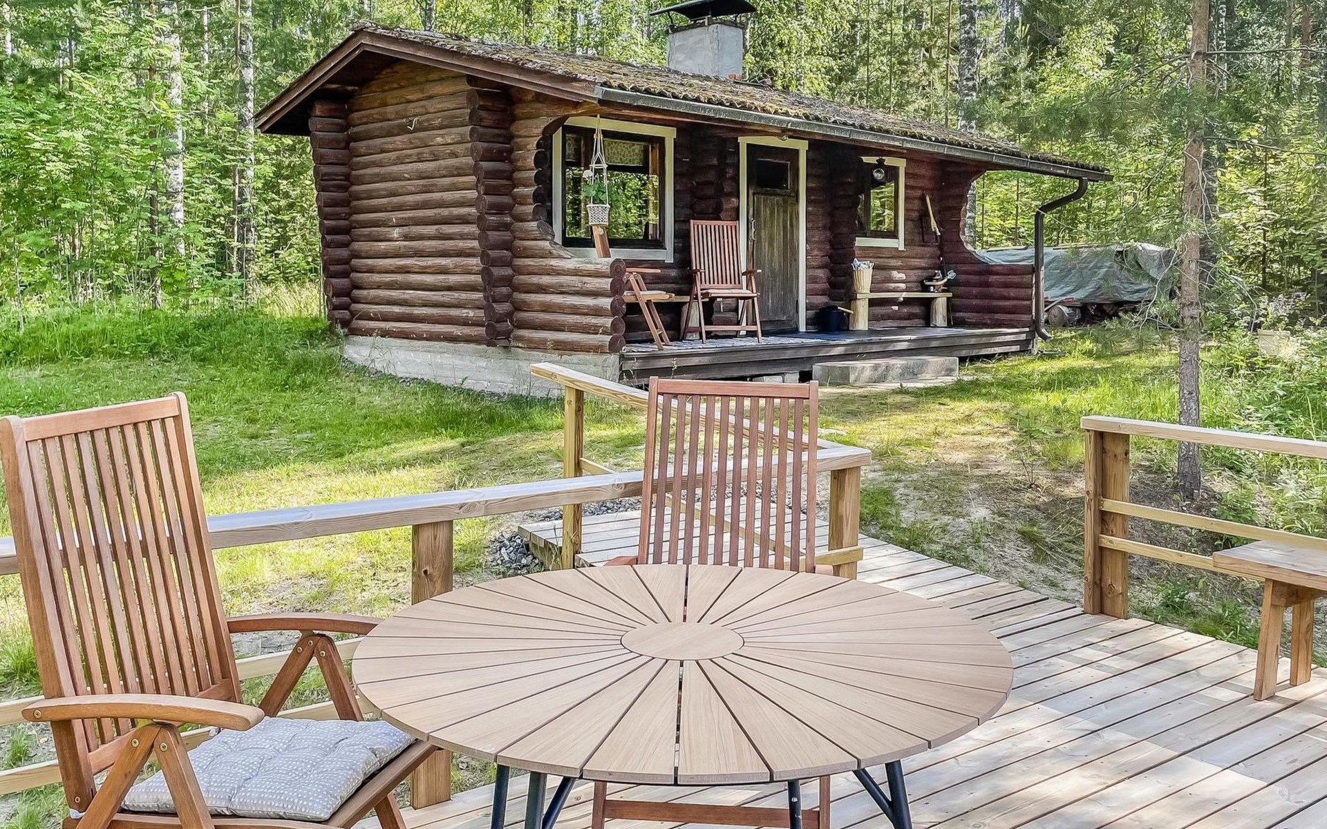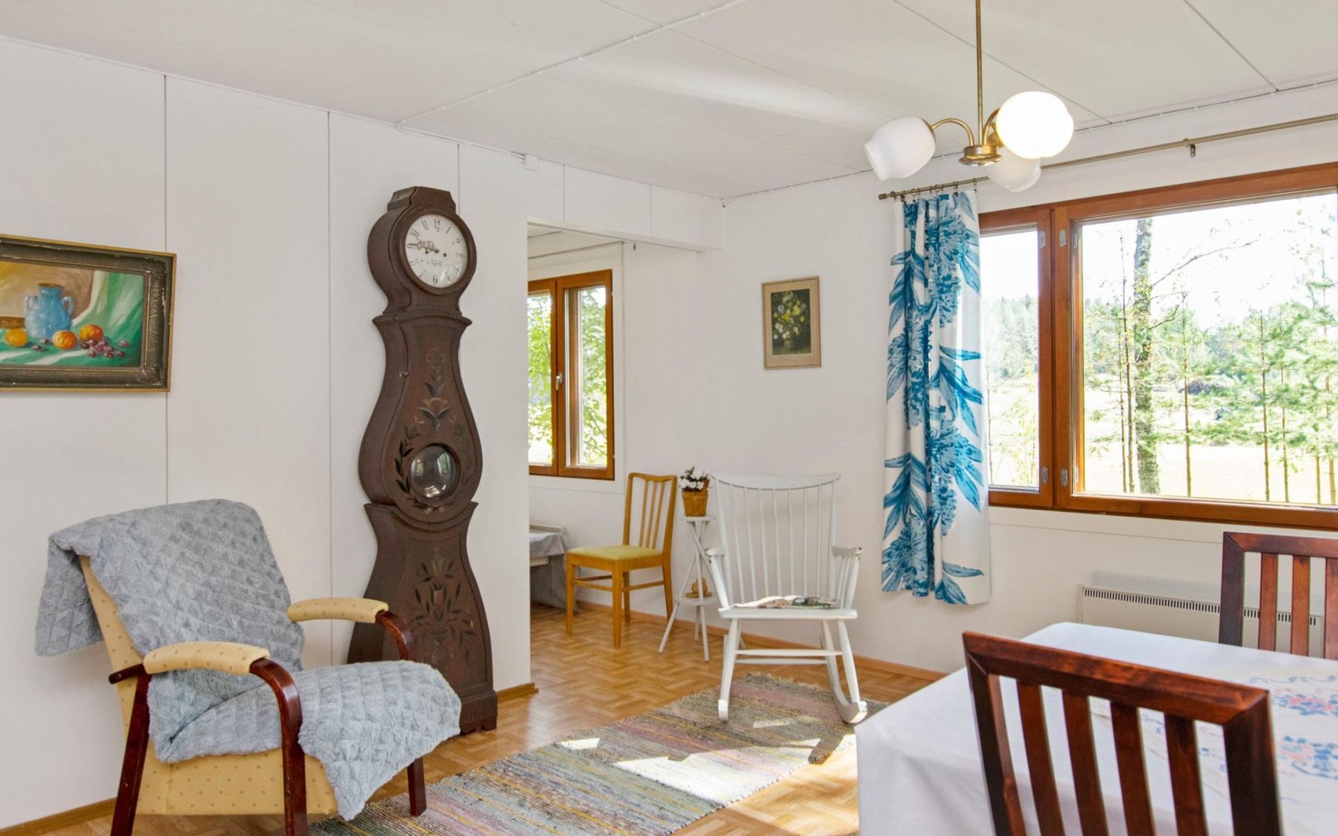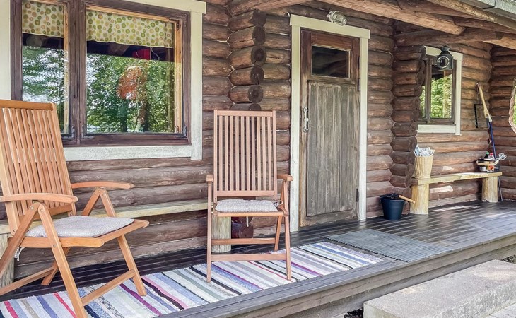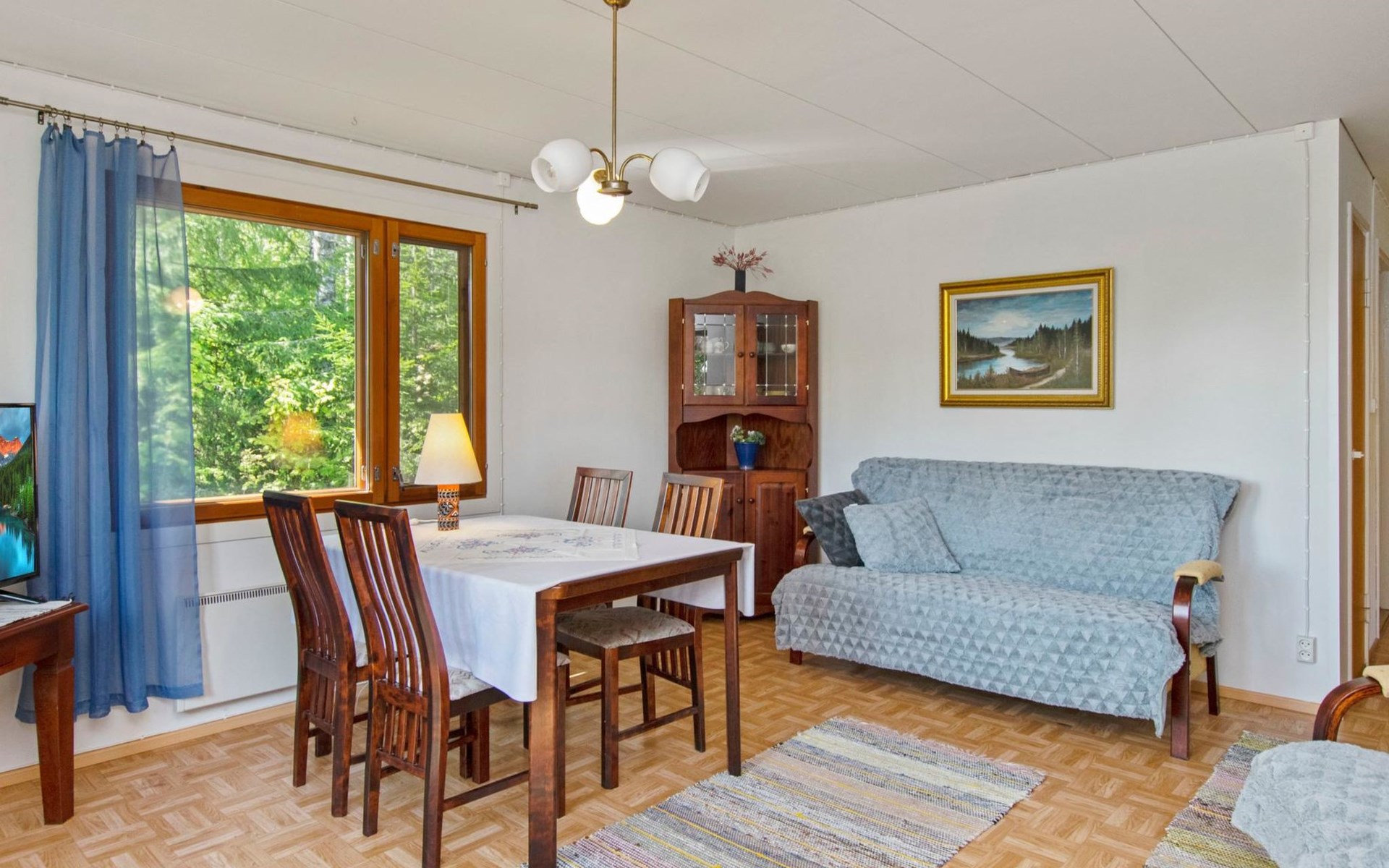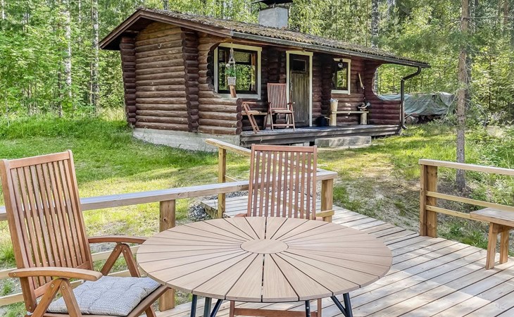 Wooden cabin 1966, renovated in 1984, interior surfaces are renovated in 2021, living room, kitchen. Two beds in bedroom, one bed in another bedroom (bedrooms windows have blackout curtains). WC and shower in washroom, electric sauna stove in sauna.