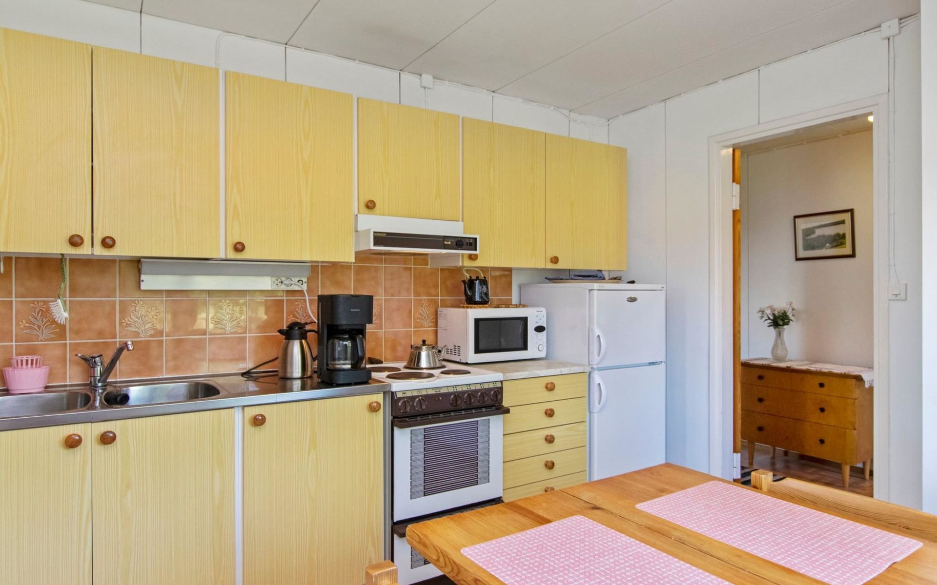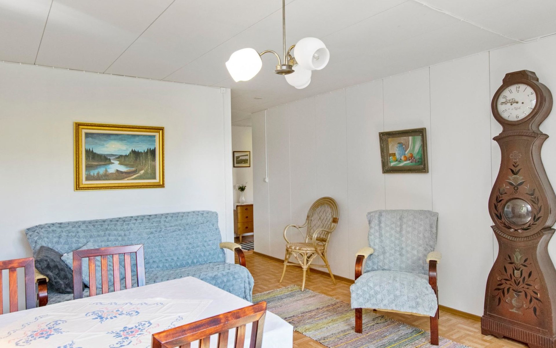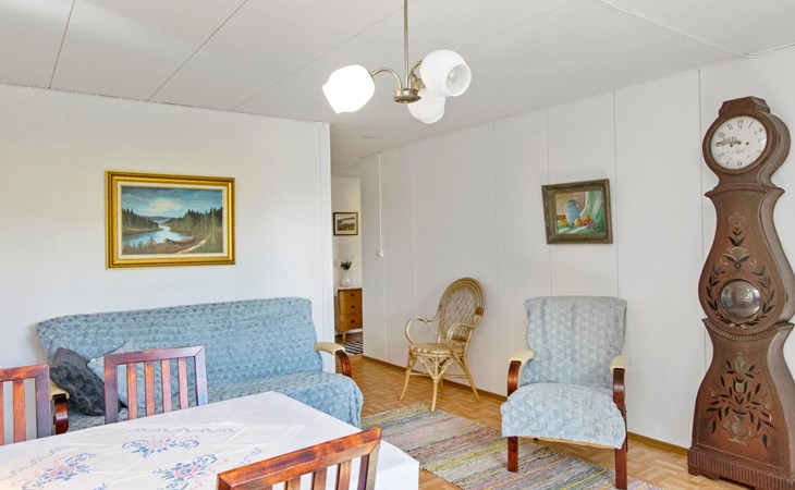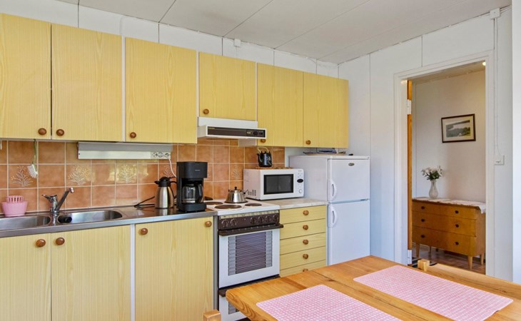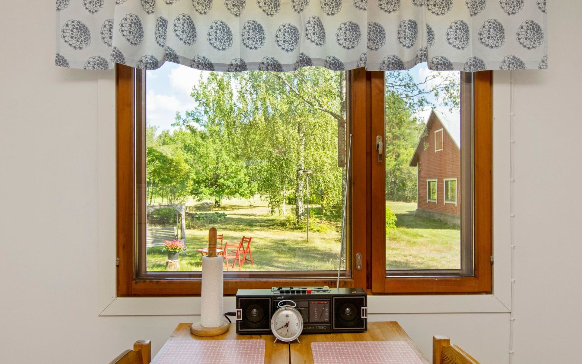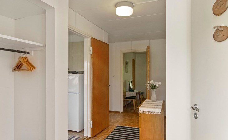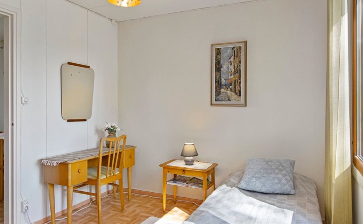 Wooden cabin 1966, renovated in 1984, interior surfaces are renovated in 2021, living room, kitchen. Two beds in bedroom, one bed in another bedroom (bedrooms windows have blackout curtains). WC and shower in washroom, electric sauna stove in sauna.