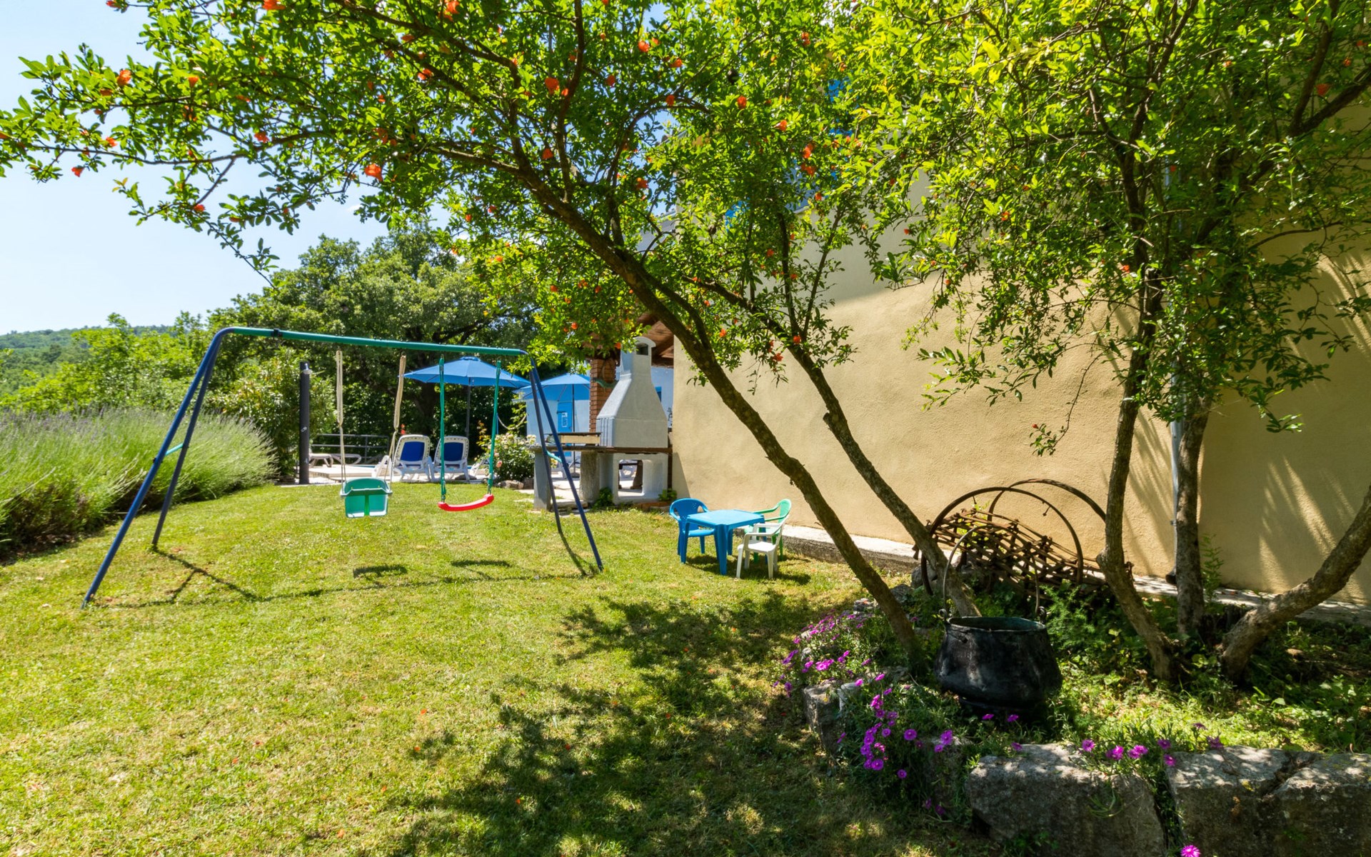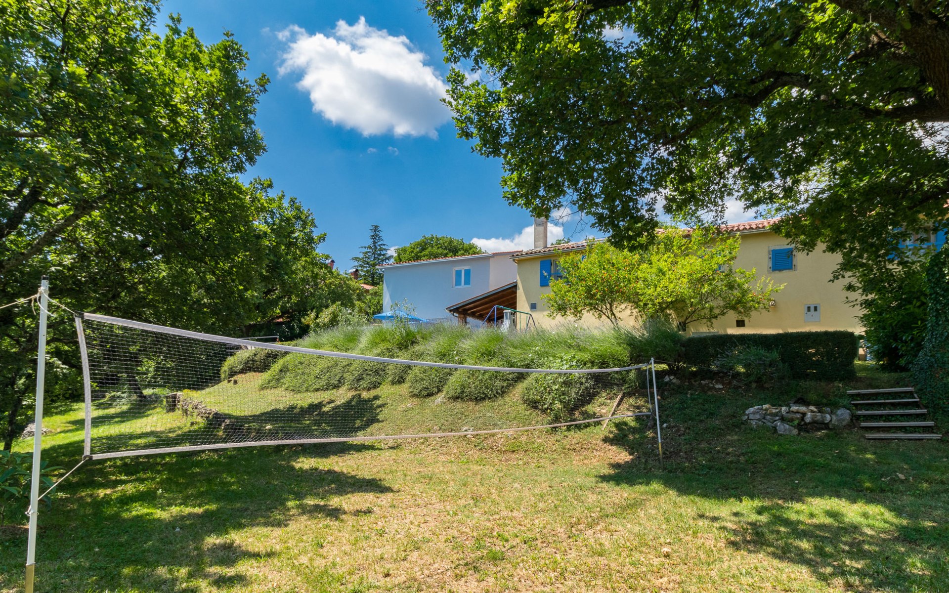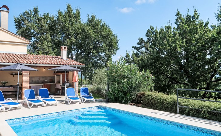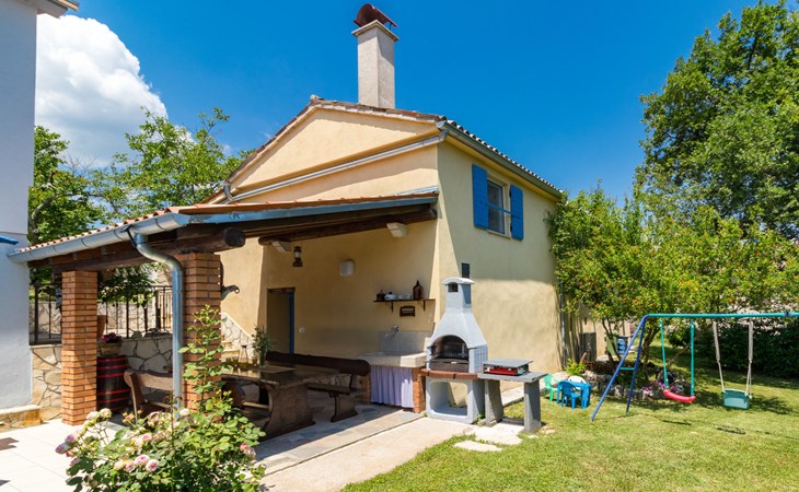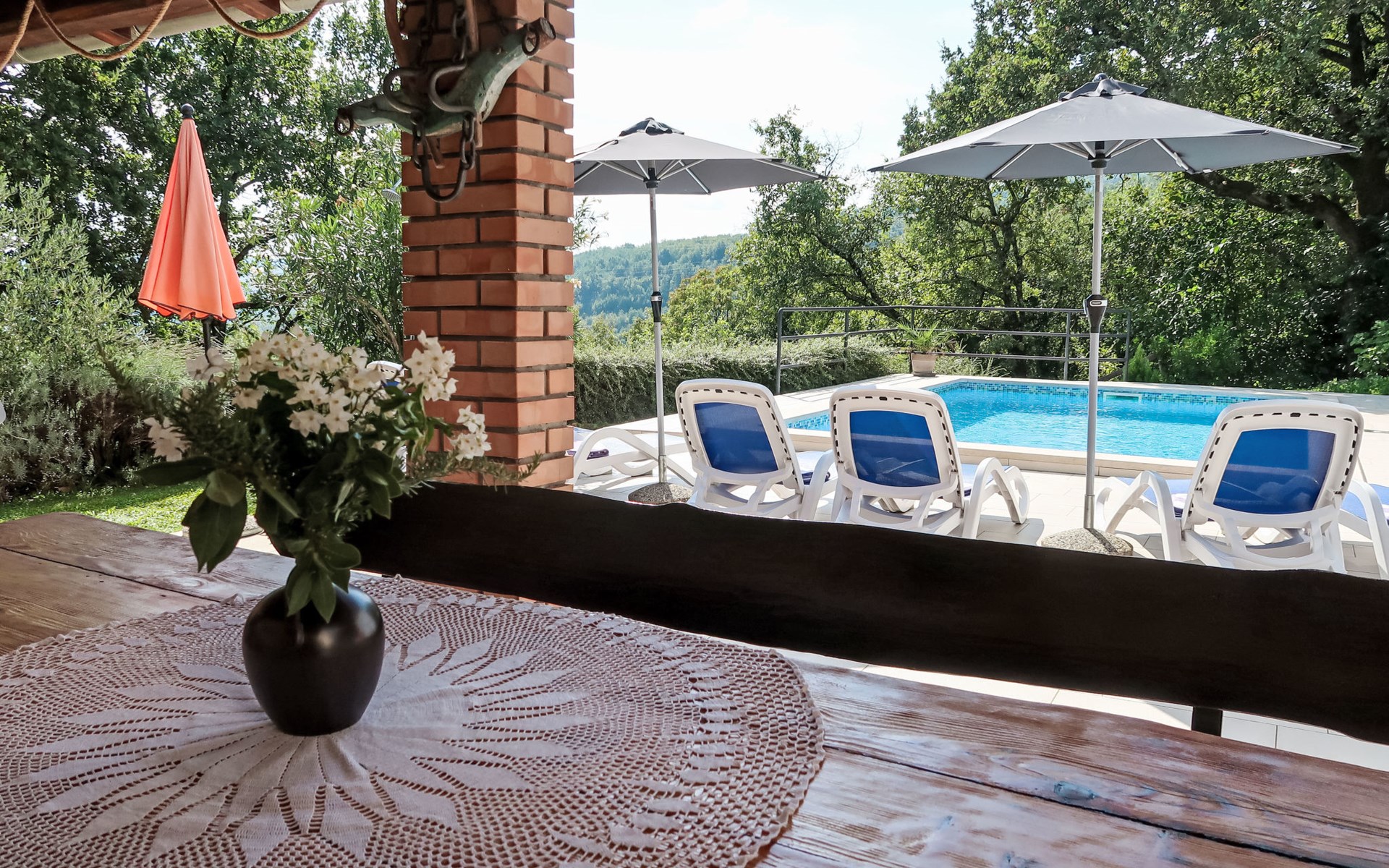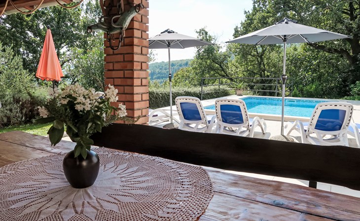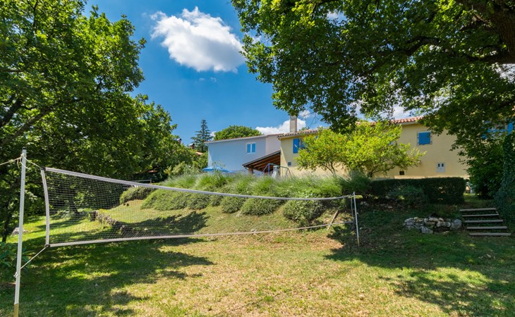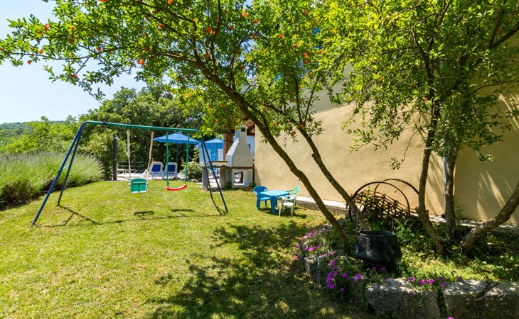 Single-family house "Mariva". In the hamlet Hajnožići 2.5 km from the centre of Pićan, 5 km from the centre of Potpićan, 15 km from the sea. Private: property 2'000 m2 with lawn and trees, swimming pool (6 x 4 m, depth 135 cm, seasonal availability: 01.May. - 04.Oct.) with internal staircase. WC in the pool area, outdoor shower, table tennis, badminton, terrace (16 m2), garden furniture, barbecue, children's playground (swing), pool maintenance by the owner/gardener. In the house: internet access, washing machine. Parking (for 3 cars) on the premises. Supermarket 5 km, bus stop 12.1 km, pebble beach 21 km. Marina 21 km.