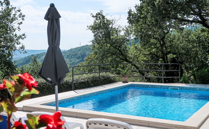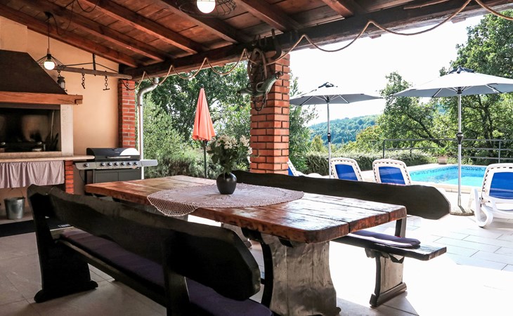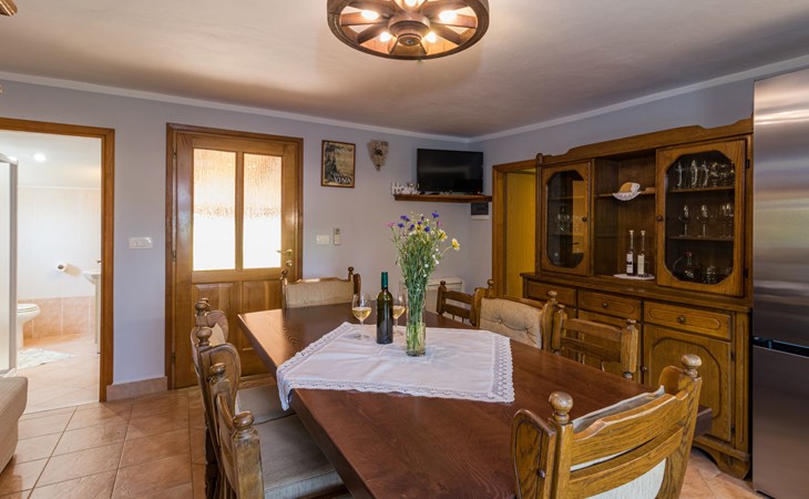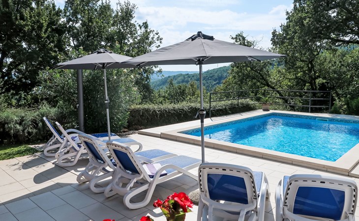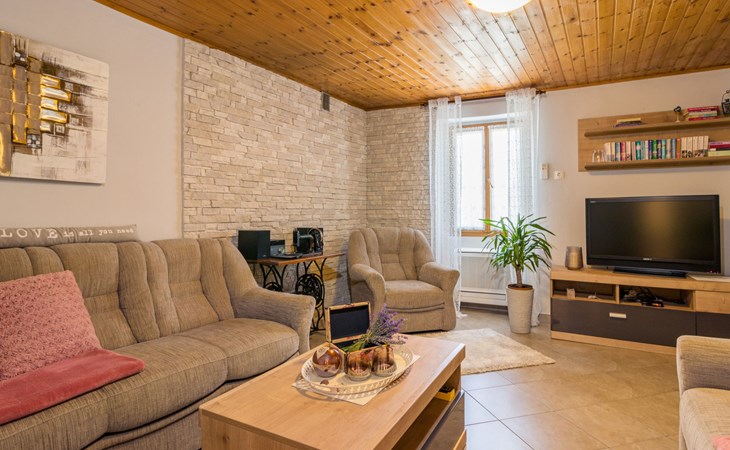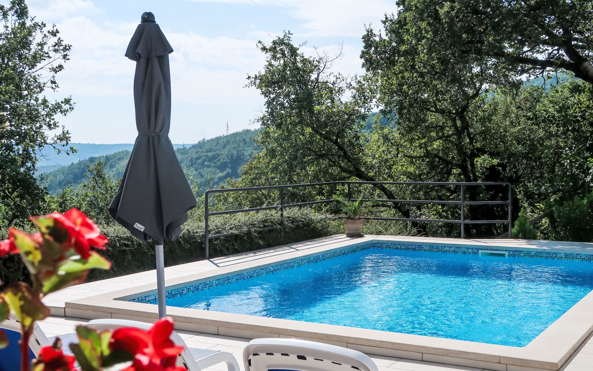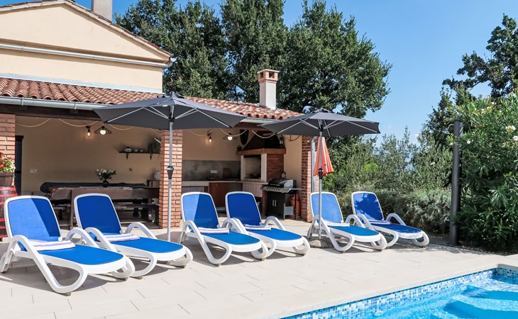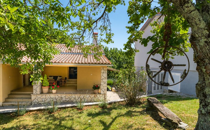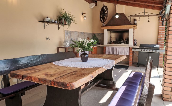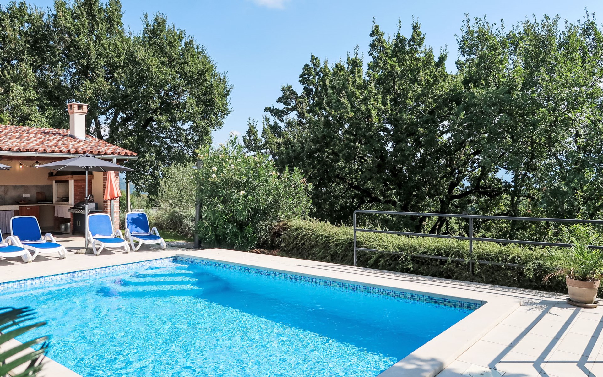 Single-family house "Mariva". In the hamlet Hajnožići 2.5 km from the centre of Pićan, 5 km from the centre of Potpićan, 15 km from the sea. Private: property 2'000 m2 with lawn and trees, swimming pool (6 x 4 m, depth 135 cm, seasonal availability: 01.May. - 04.Oct.) with internal staircase. WC in the pool area, outdoor shower, table tennis, badminton, terrace (16 m2), garden furniture, barbecue, children's playground (swing), pool maintenance by the owner/gardener. In the house: internet access, washing machine. Parking (for 3 cars) on the premises. Supermarket 5 km, bus stop 12.1 km, pebble beach 21 km. Marina 21 km.
