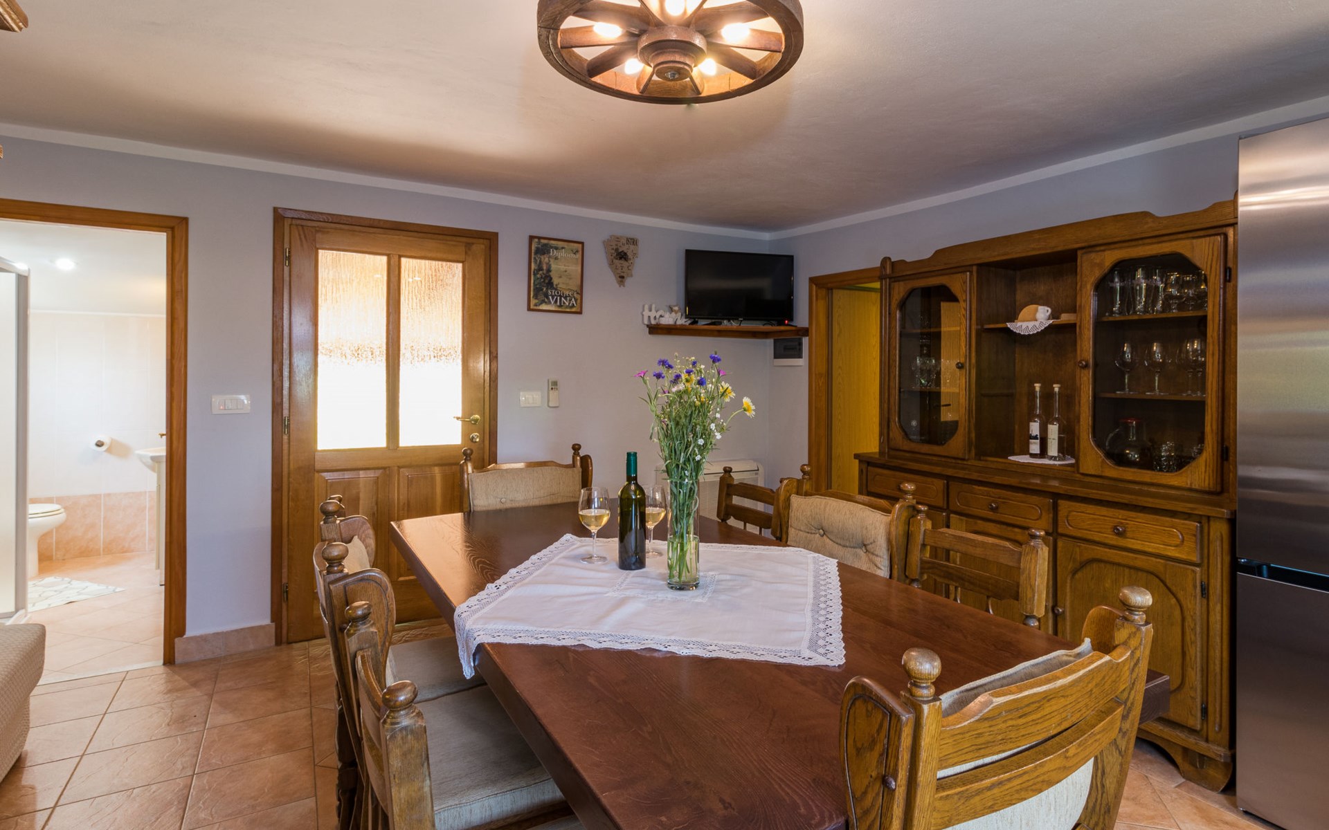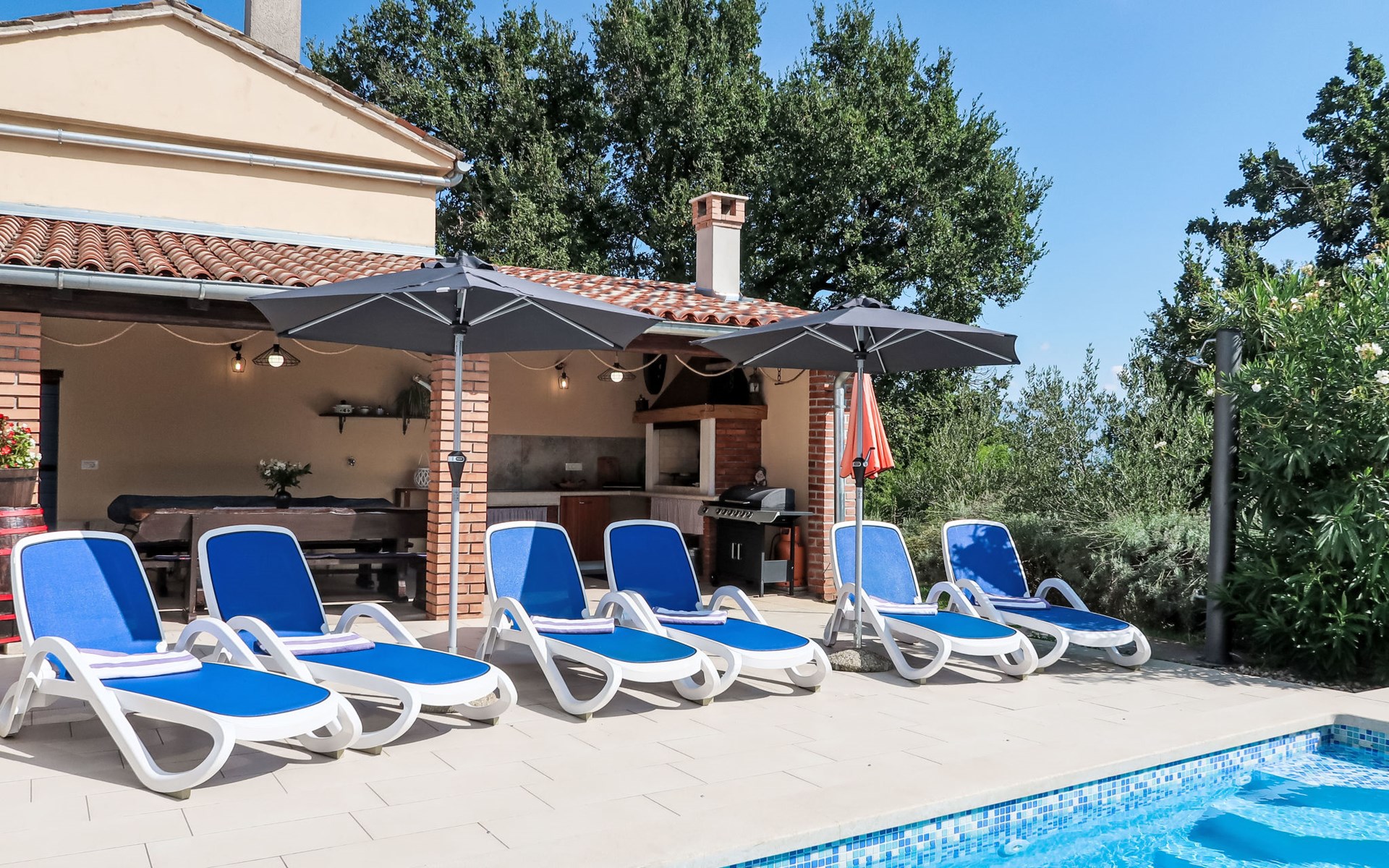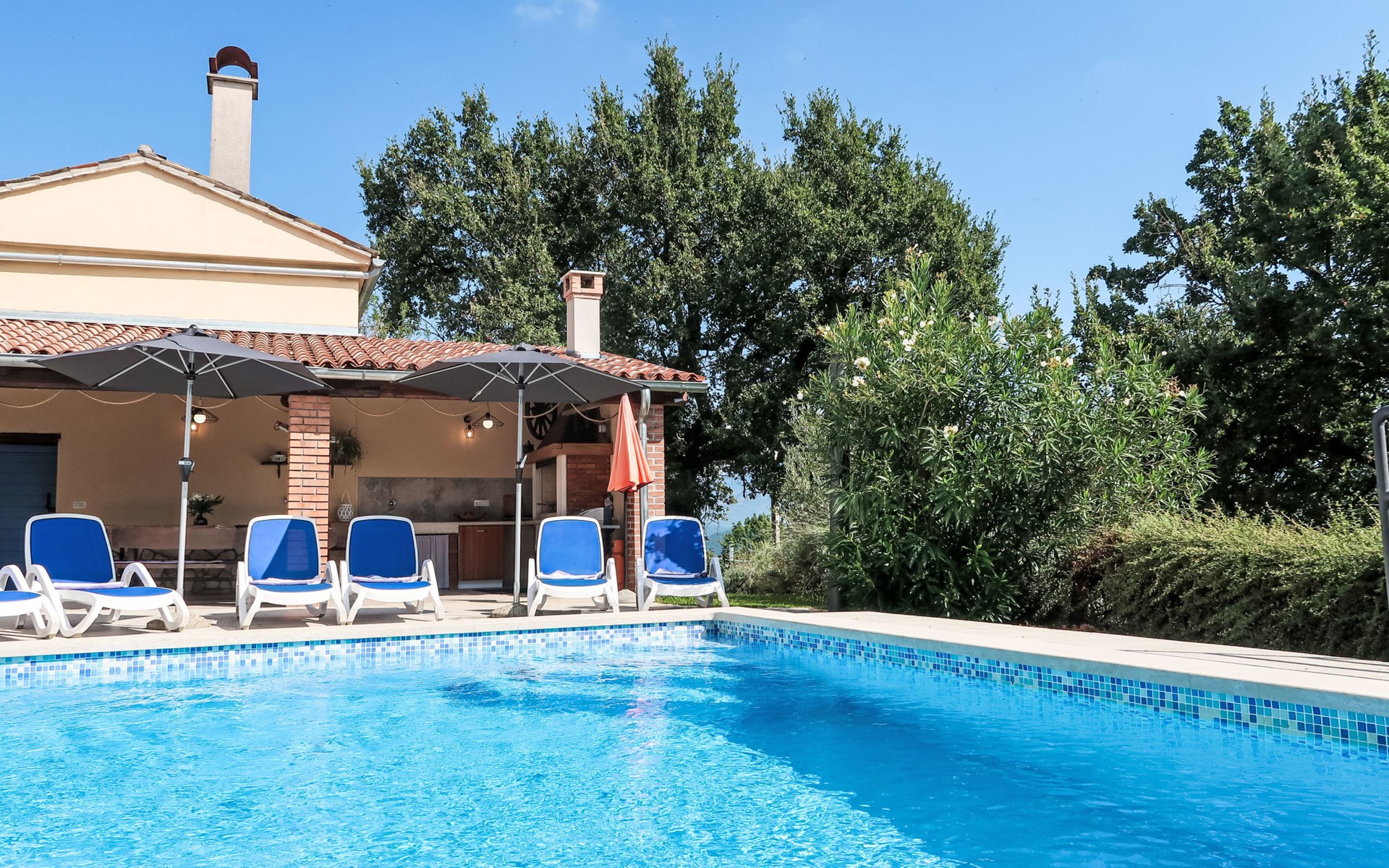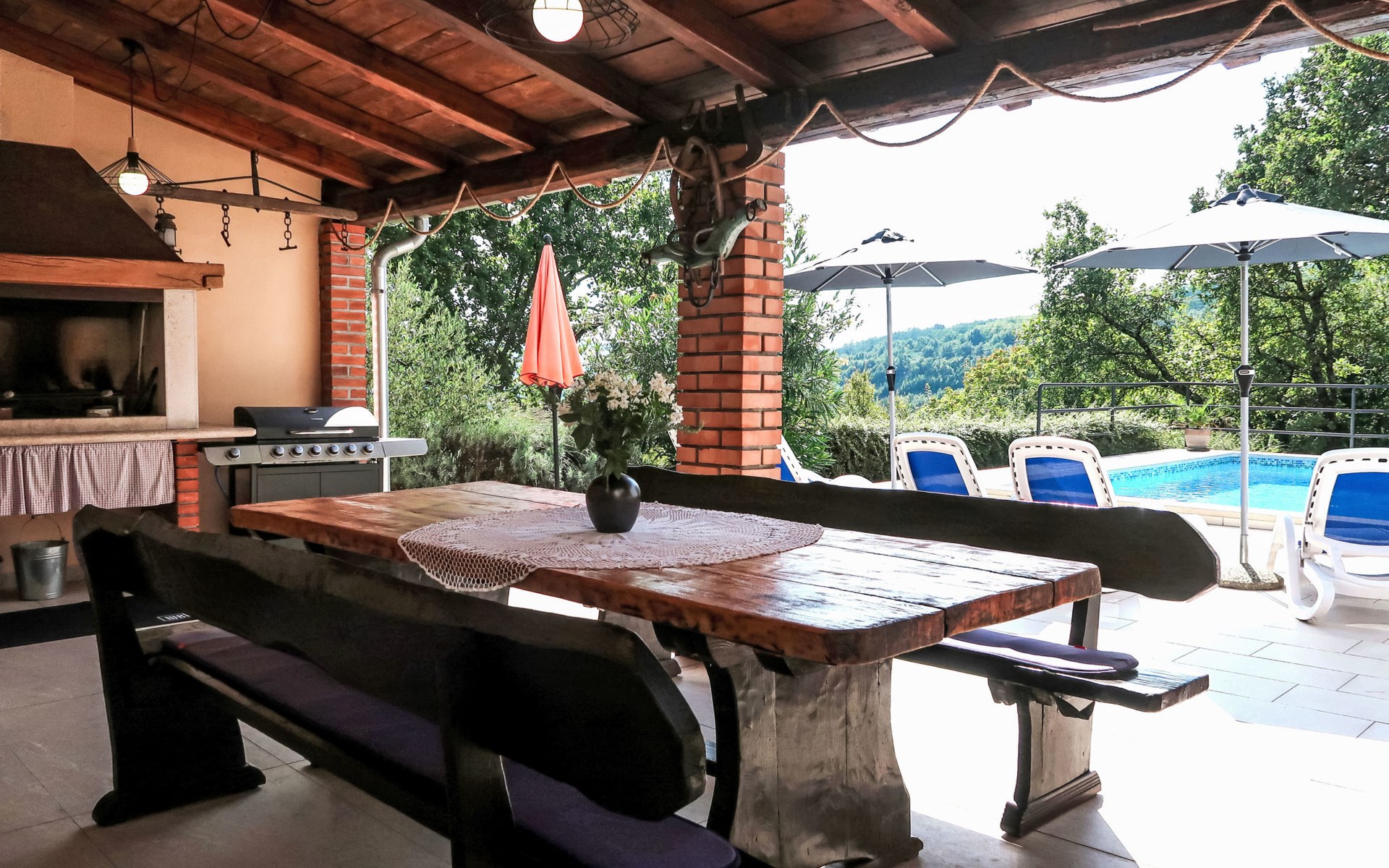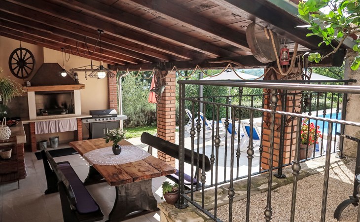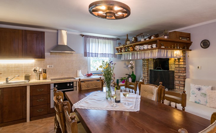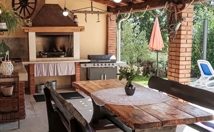 Single-family house "Mariva". In the hamlet Hajnožići 2.5 km from the centre of Pićan, 5 km from the centre of Potpićan, 15 km from the sea. Private: property 2'000 m2 with lawn and trees, swimming pool (6 x 4 m, depth 135 cm, seasonal availability: 01.May. - 04.Oct.) with internal staircase. WC in the pool area, outdoor shower, table tennis, badminton, terrace (16 m2), garden furniture, barbecue, children's playground (swing), pool maintenance by the owner/gardener. In the house: internet access, washing machine. Parking (for 3 cars) on the premises. Supermarket 5 km, bus stop 12.1 km, pebble beach 21 km. Marina 21 km.
