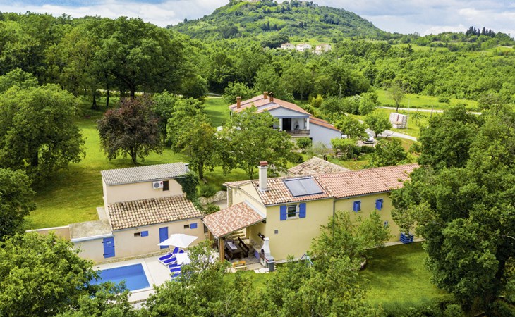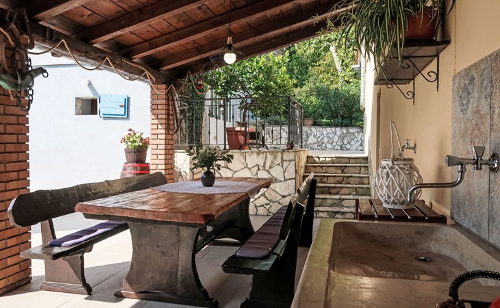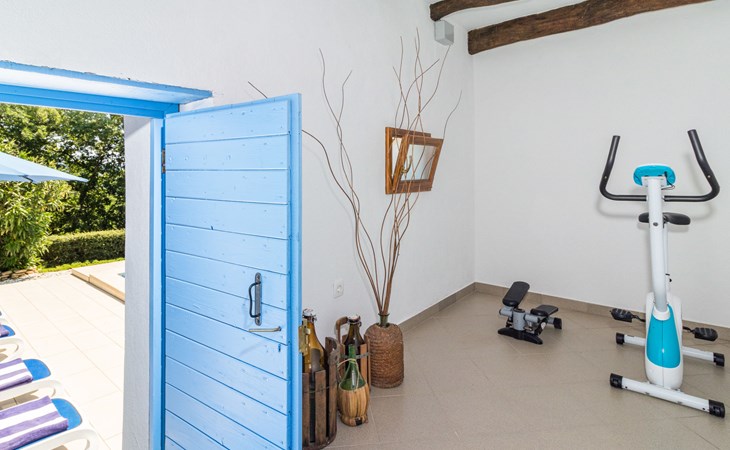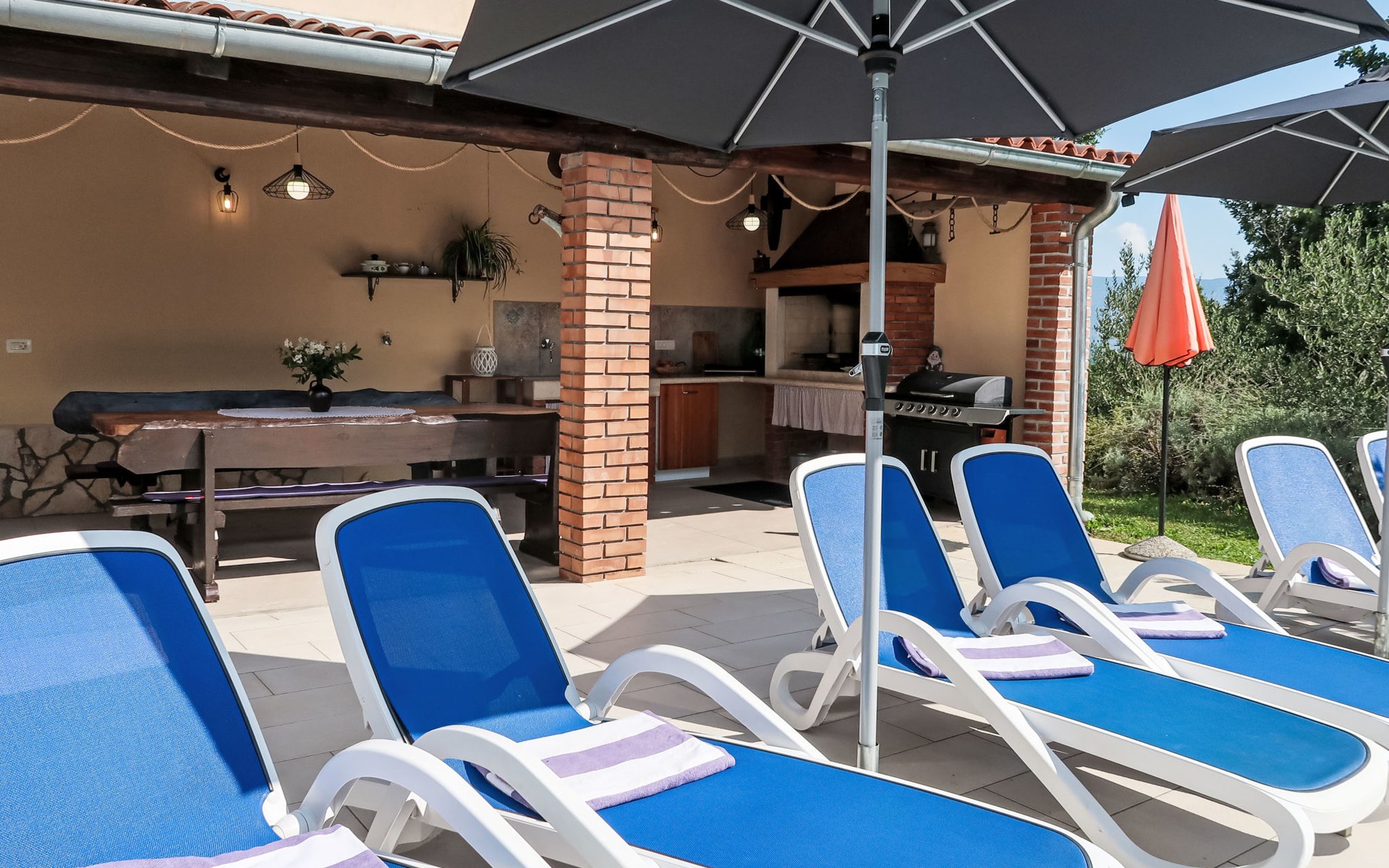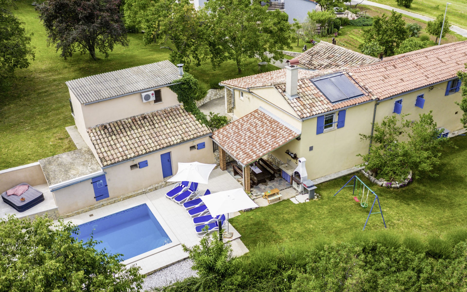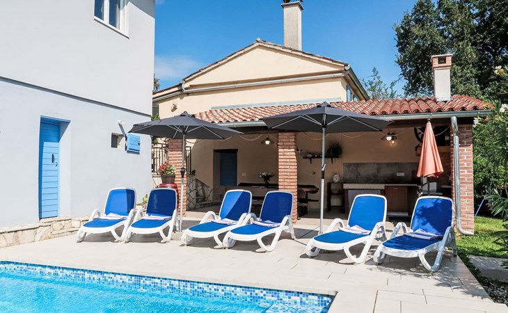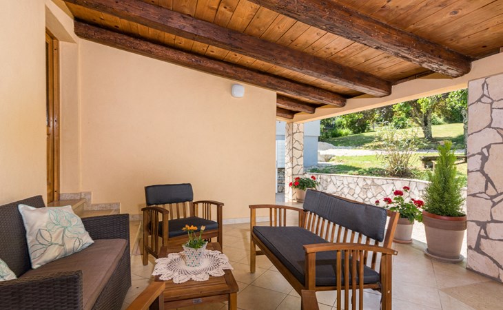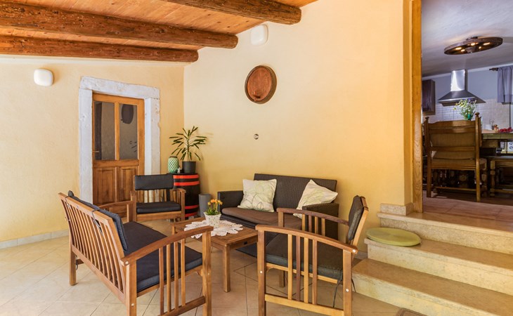 Single-family house "Mariva". In the hamlet Hajnožići 2.5 km from the centre of Pićan, 5 km from the centre of Potpićan, 15 km from the sea. Private: property 2'000 m2 with lawn and trees, swimming pool (6 x 4 m, depth 135 cm, seasonal availability: 01.May. - 04.Oct.) with internal staircase. WC in the pool area, outdoor shower, table tennis, badminton, terrace (16 m2), garden furniture, barbecue, children's playground (swing), pool maintenance by the owner/gardener. In the house: internet access, washing machine. Parking (for 3 cars) on the premises. Supermarket 5 km, bus stop 12.1 km, pebble beach 21 km. Marina 21 km.