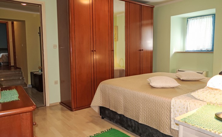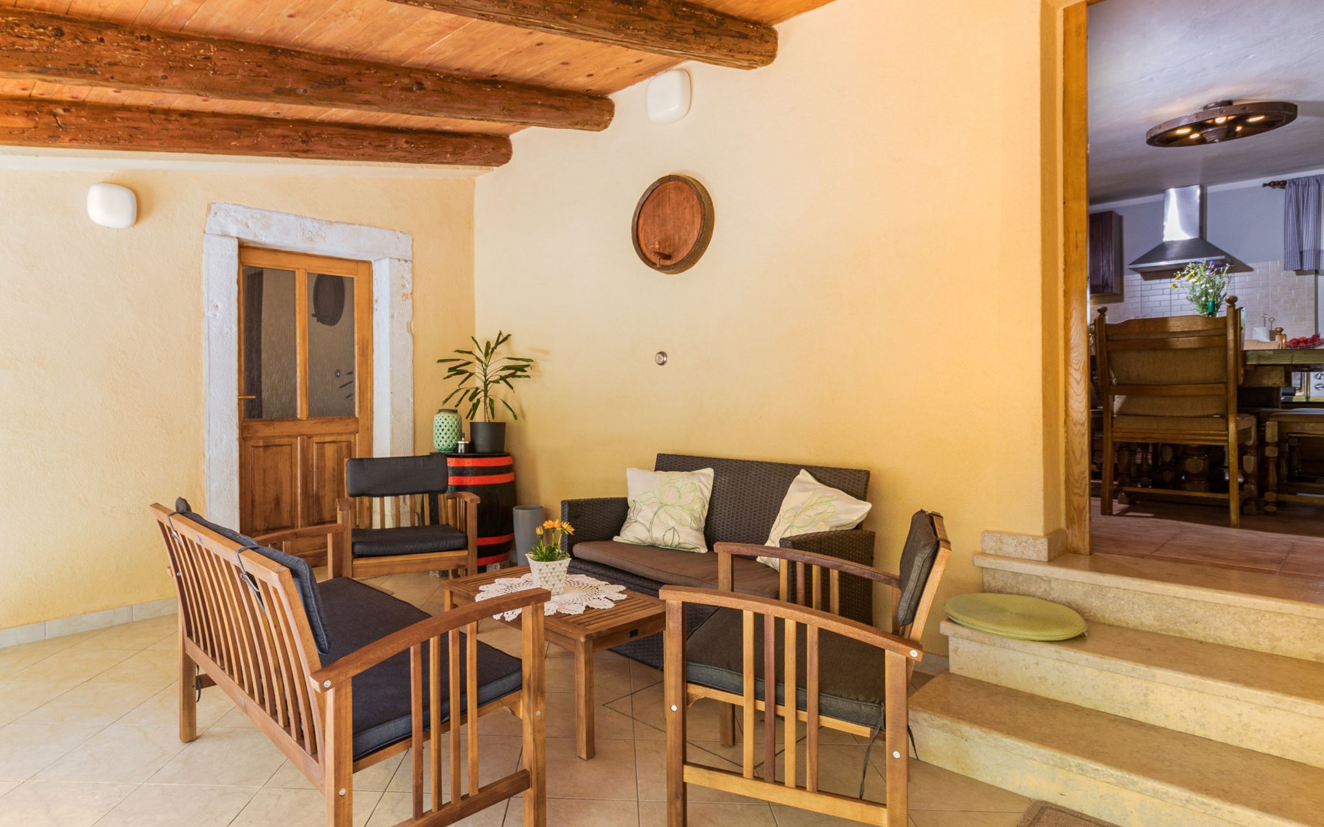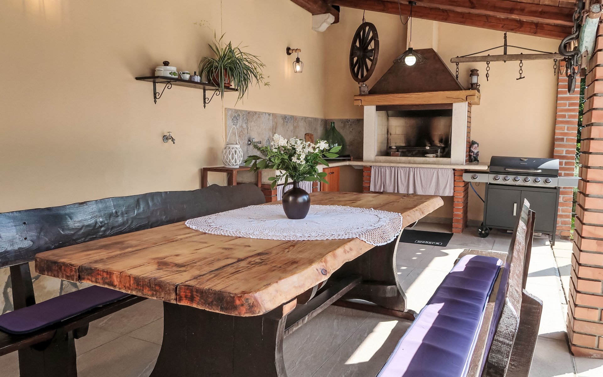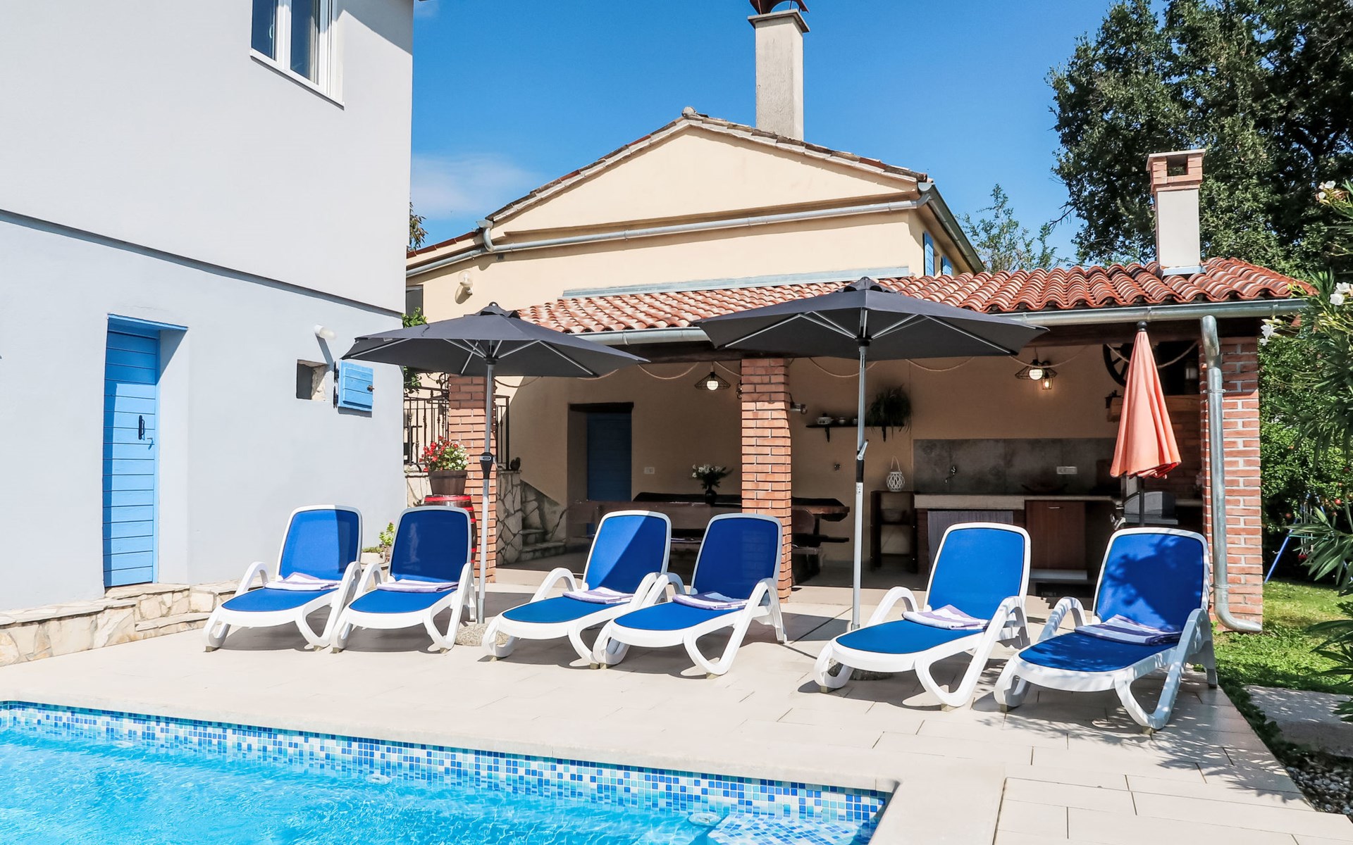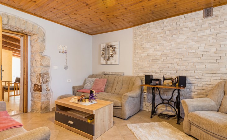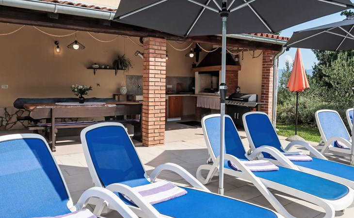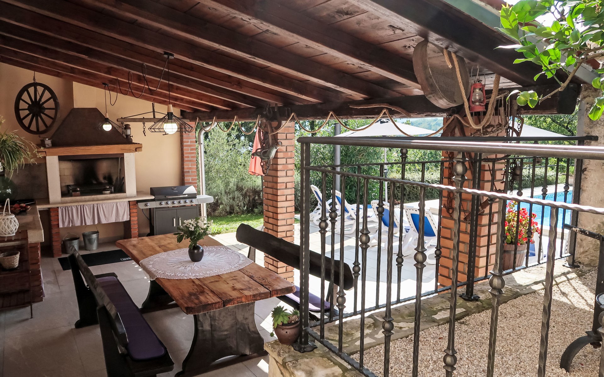 Single-family house "Mariva". In the hamlet Hajnožići 2.5 km from the centre of Pićan, 5 km from the centre of Potpićan, 15 km from the sea. Private: property 2'000 m2 with lawn and trees, swimming pool (6 x 4 m, depth 135 cm, seasonal availability: 01.May. - 04.Oct.) with internal staircase. WC in the pool area, outdoor shower, table tennis, badminton, terrace (16 m2), garden furniture, barbecue, children's playground (swing), pool maintenance by the owner/gardener. In the house: internet access, washing machine. Parking (for 3 cars) on the premises. Supermarket 5 km, bus stop 12.1 km, pebble beach 21 km. Marina 21 km.