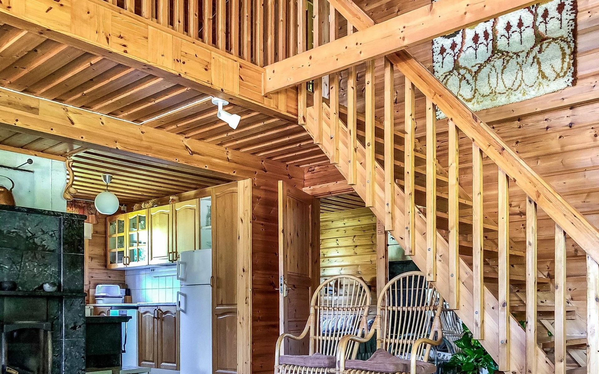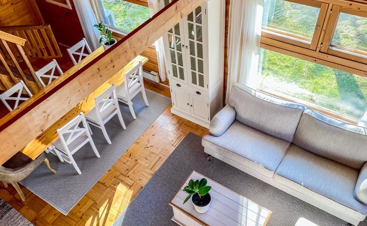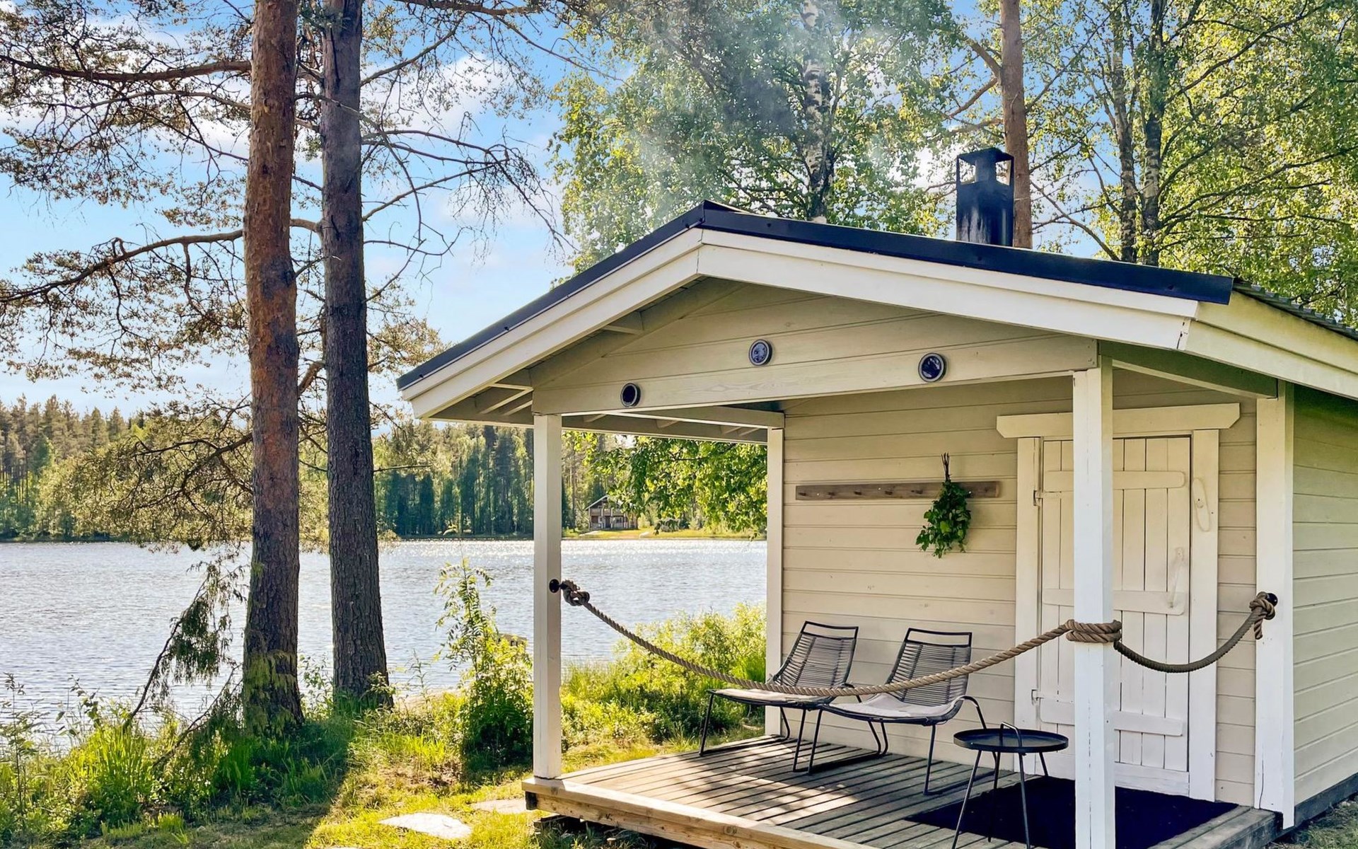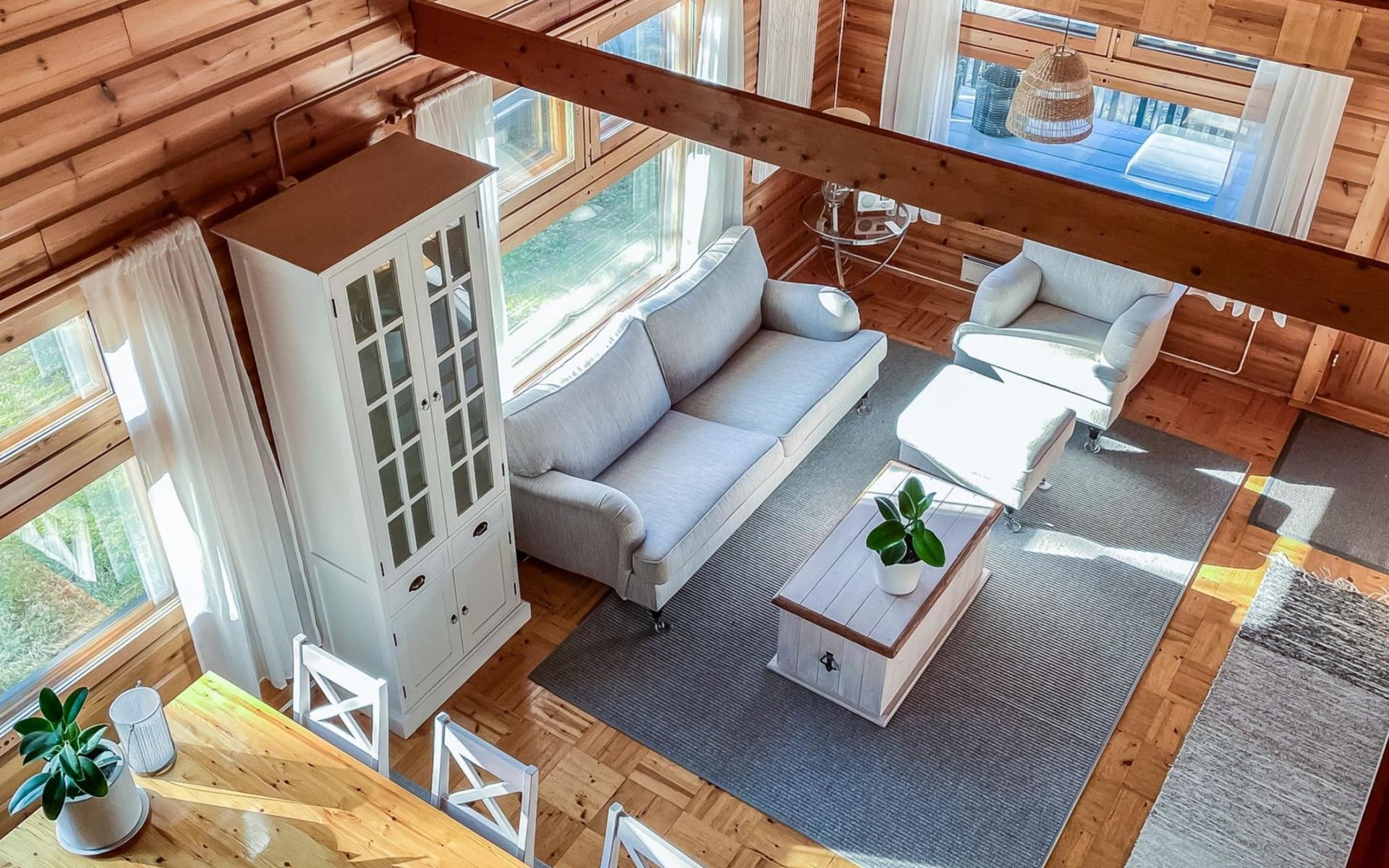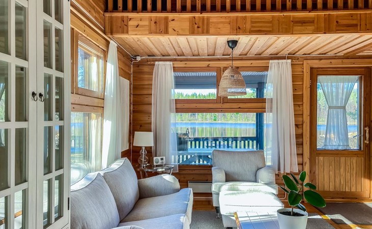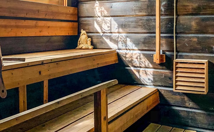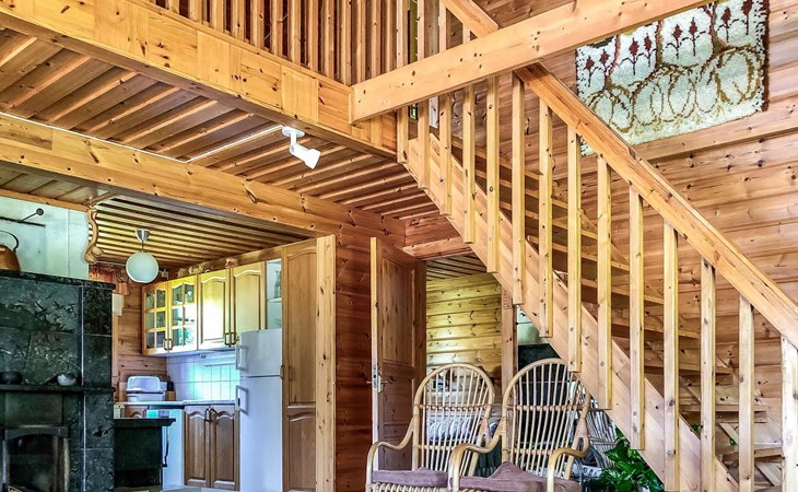 Downstairs: living room, kitchen, two bedrooms (double bed in both), bathroom, wood-heated sauna and open porch.