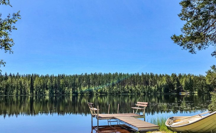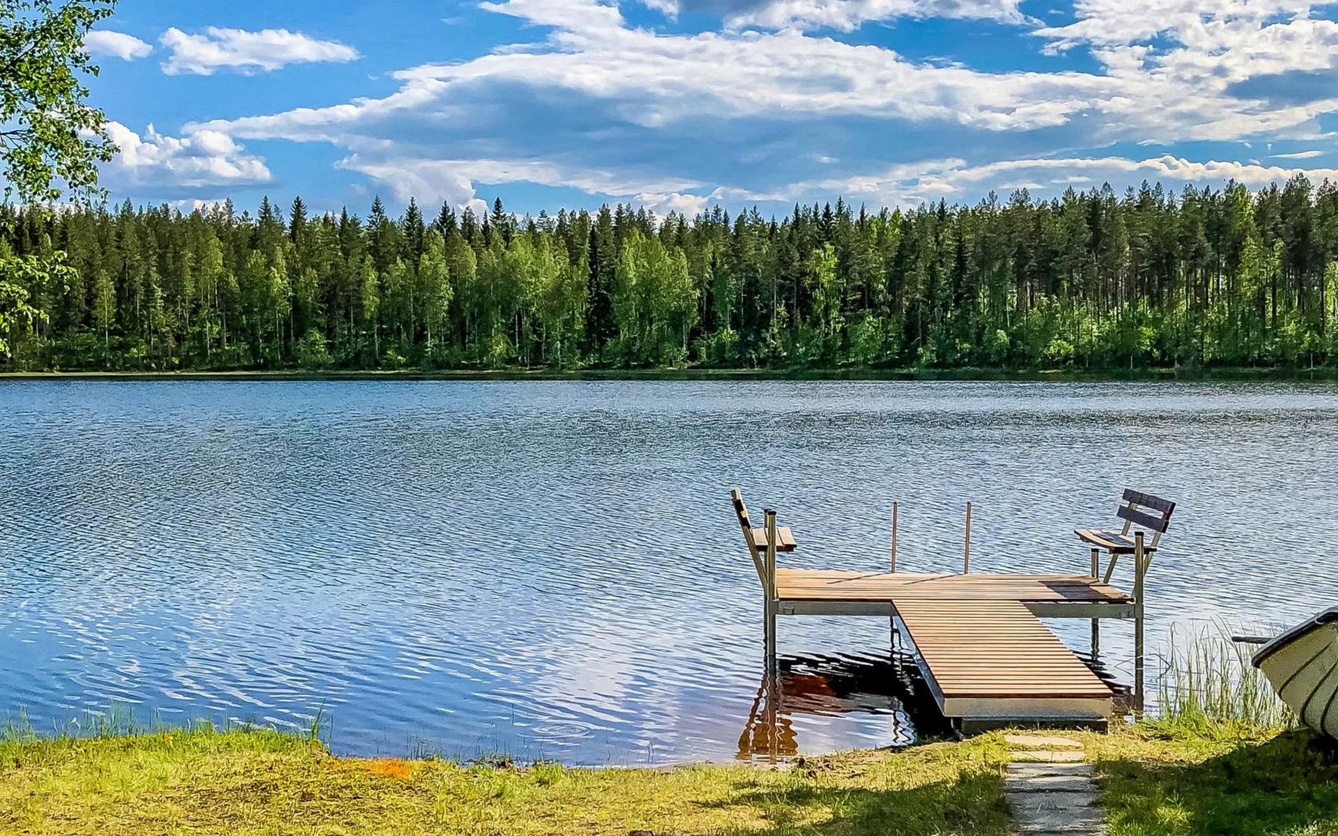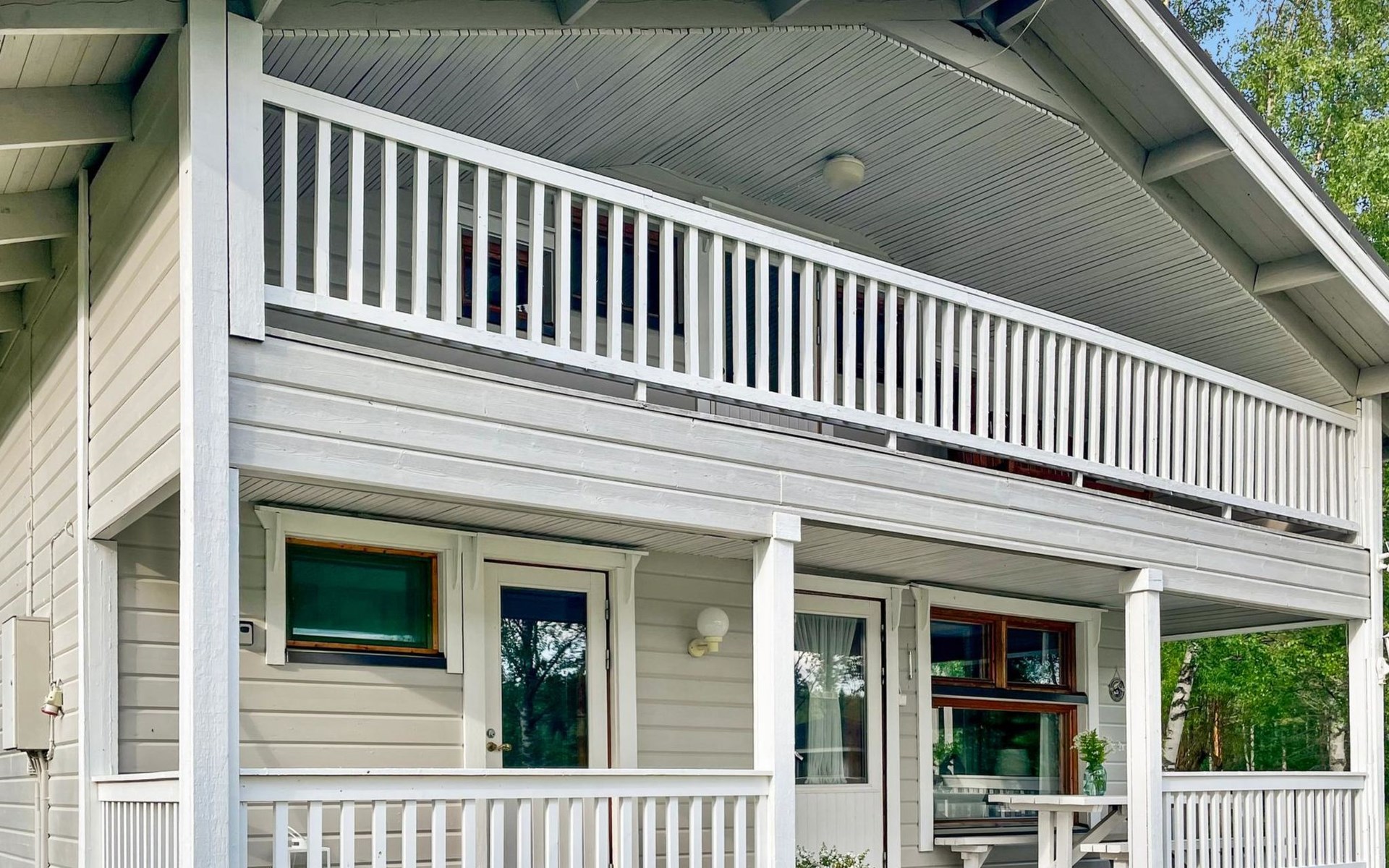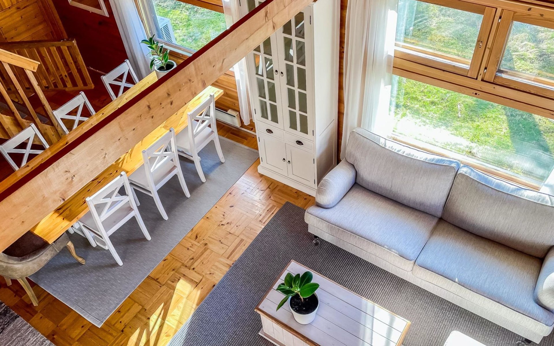 Downstairs: living room, kitchen, two bedrooms (double bed in both), bathroom, wood-heated sauna and open porch.