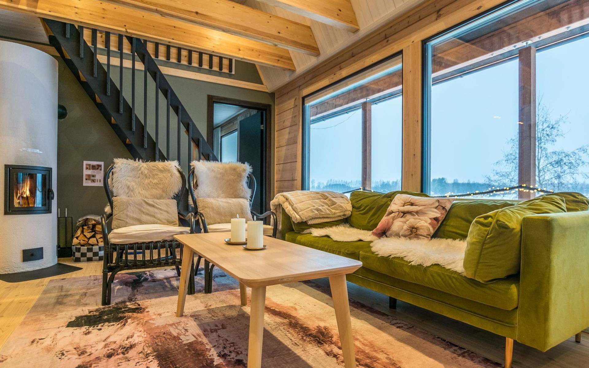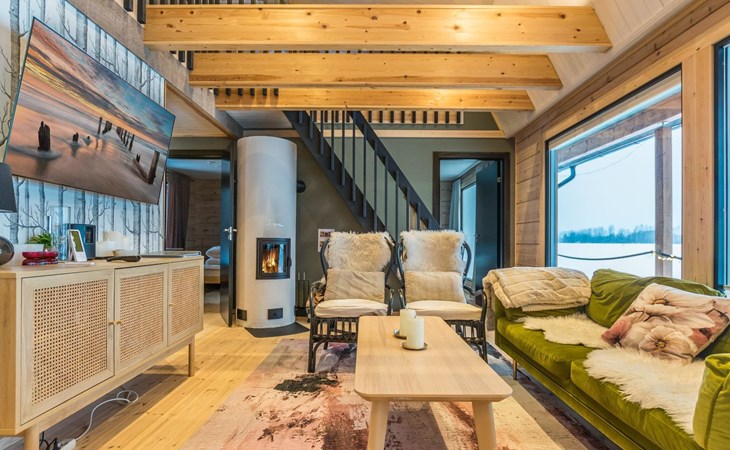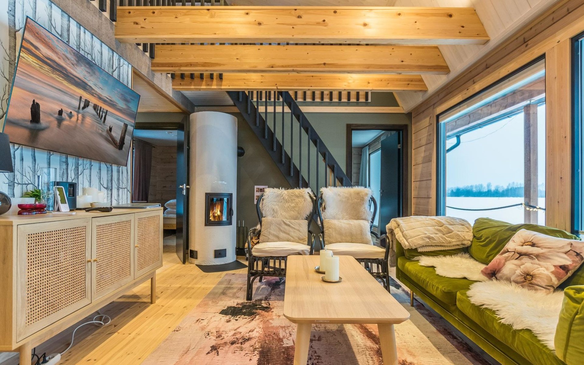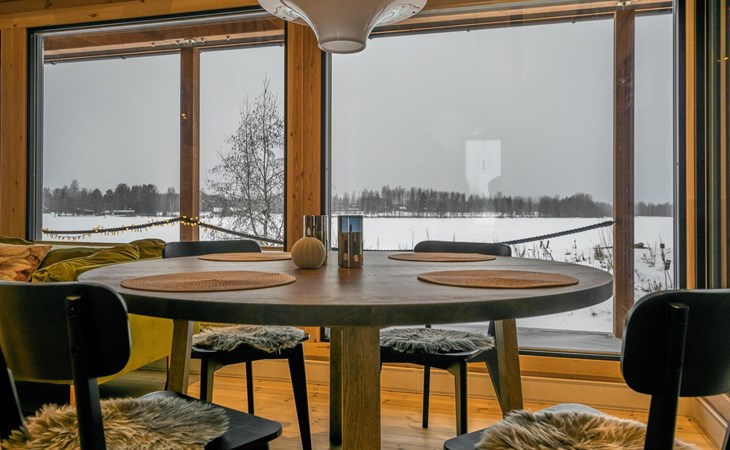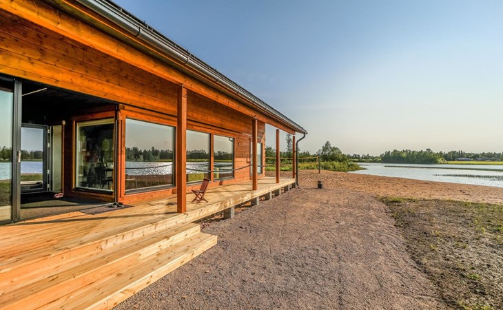 This log-constructed villa (2023) is equipped with modern comforts. The property features a shallow, soft sandy-bottomed shoreline, a private dock, and a rowing boat. In winter, guests can enjoy ice swimming right by the villa, with an ice hole pump keeping the opening clear throughout the season.