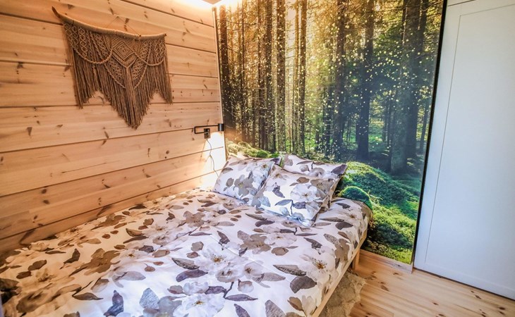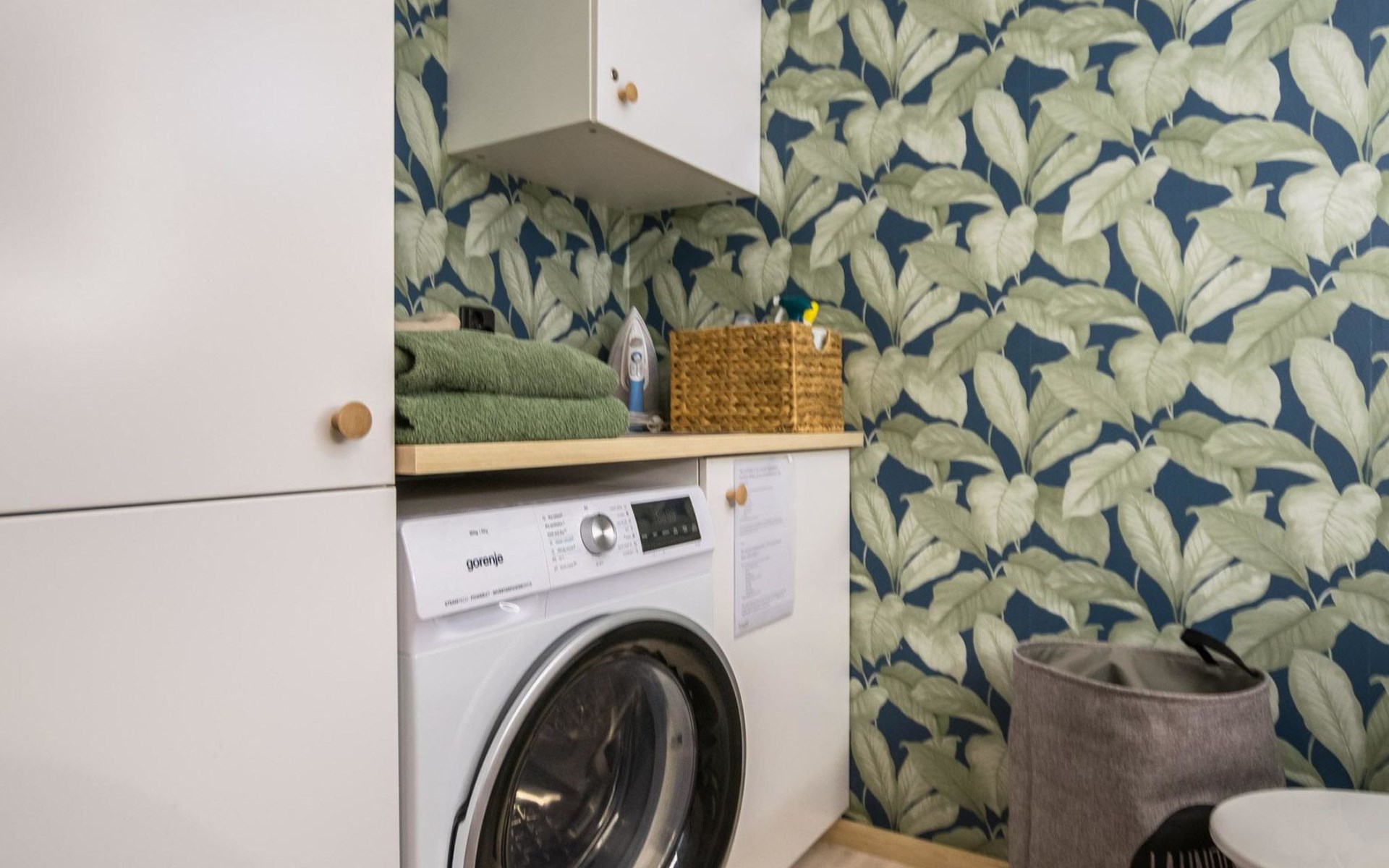 The villa has two bedrooms: one with a double bed and another with a pull-out bed that extends to 160 x 200 cm. Additionally, there is a spacious loft with two mattresses on the floor, comfortably accommodating up to six guests. The spacious living room is furnished with a sofa set, a dining table and chairs, a fireplace, and a smart TV. The well-equipped kitchenette includes a breakfast cabinet with a microwave, coffee maker, toaster, and kettle. The villa also features a separate WC with a washing machine.