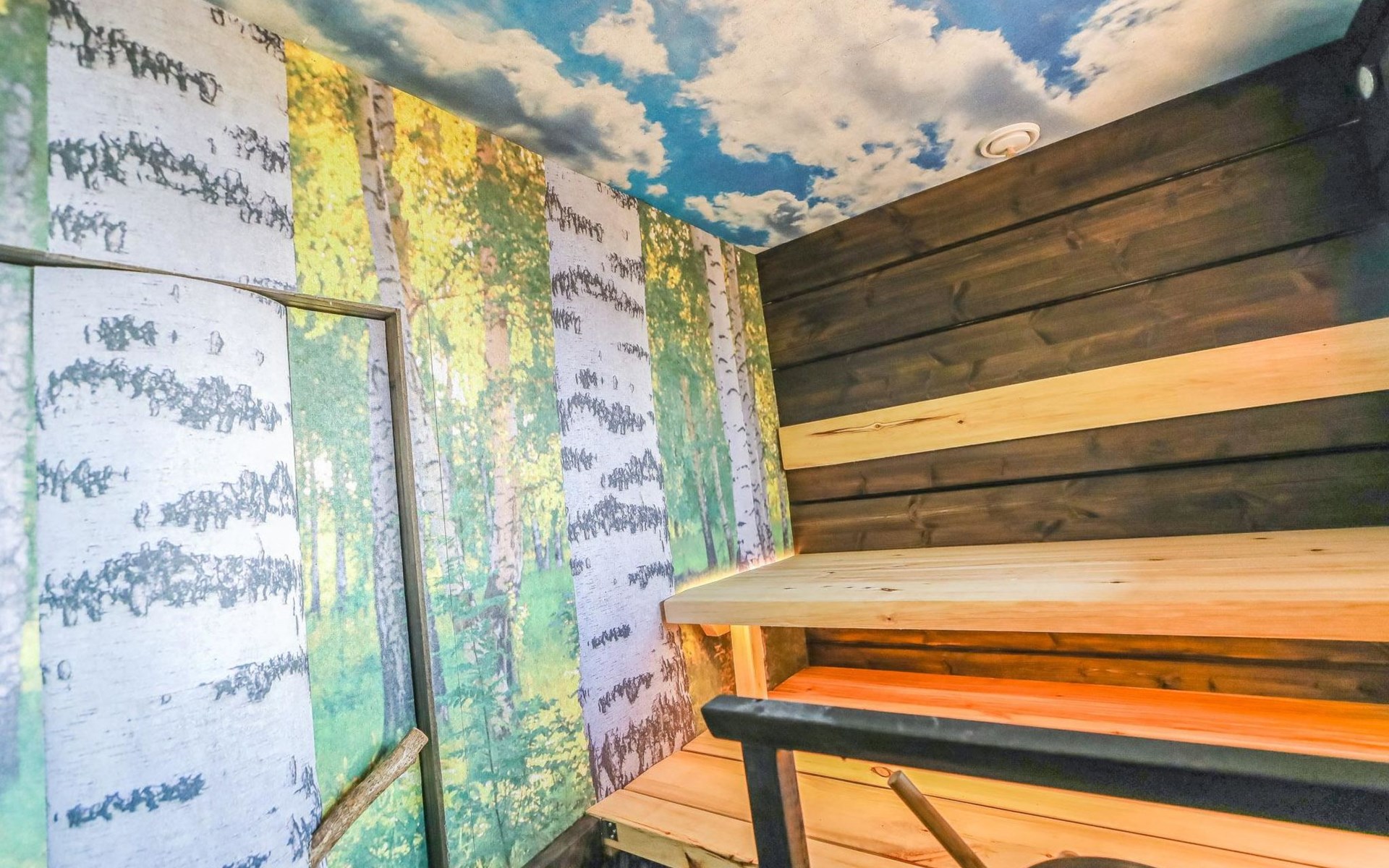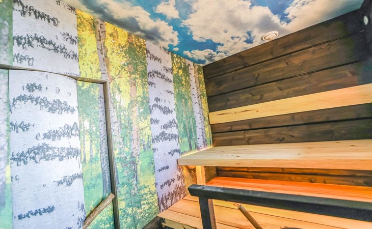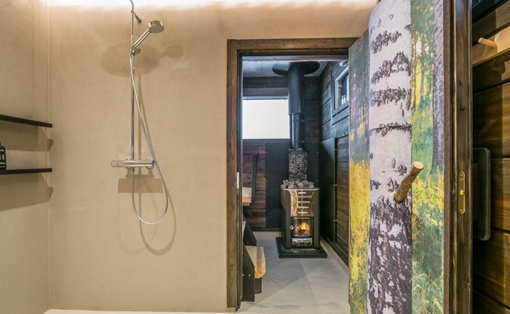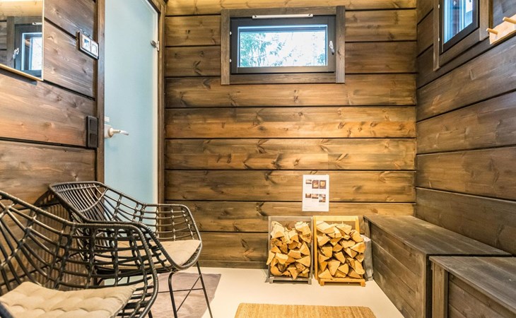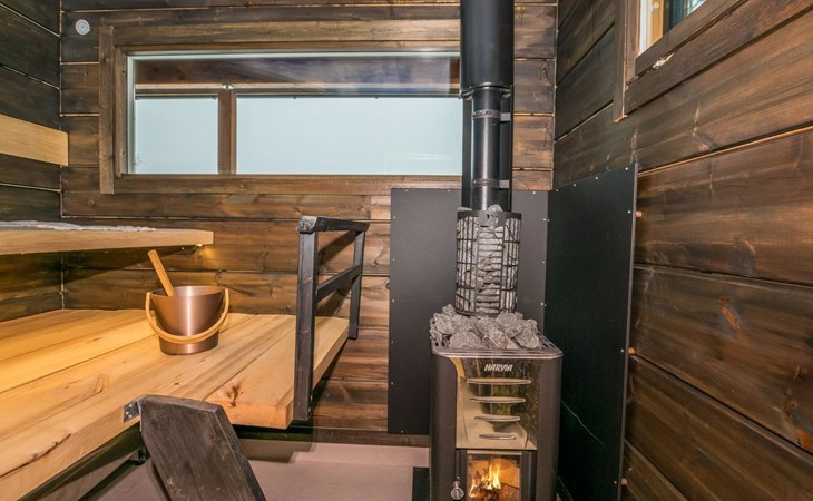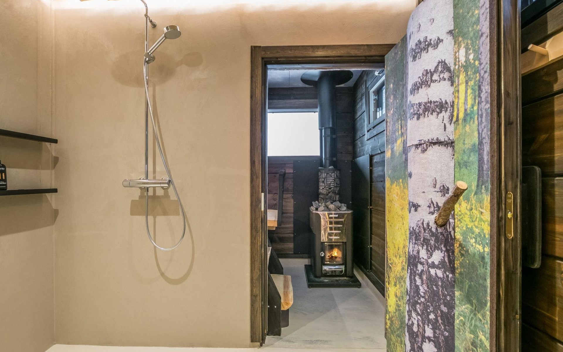 The sauna offers a unique experience with surfaces made from natural peat, creating a distinctive ambiance. The sauna area is separate from the main living space, allowing for late-night relaxation without disturbing those already asleep. It features a wood-heated sauna stove and a washroom with two showers. Between the sauna area and the main building, there is a cooling-off space with a glass-enclosed terrace, providing shelter from autumn winds and winter snow.