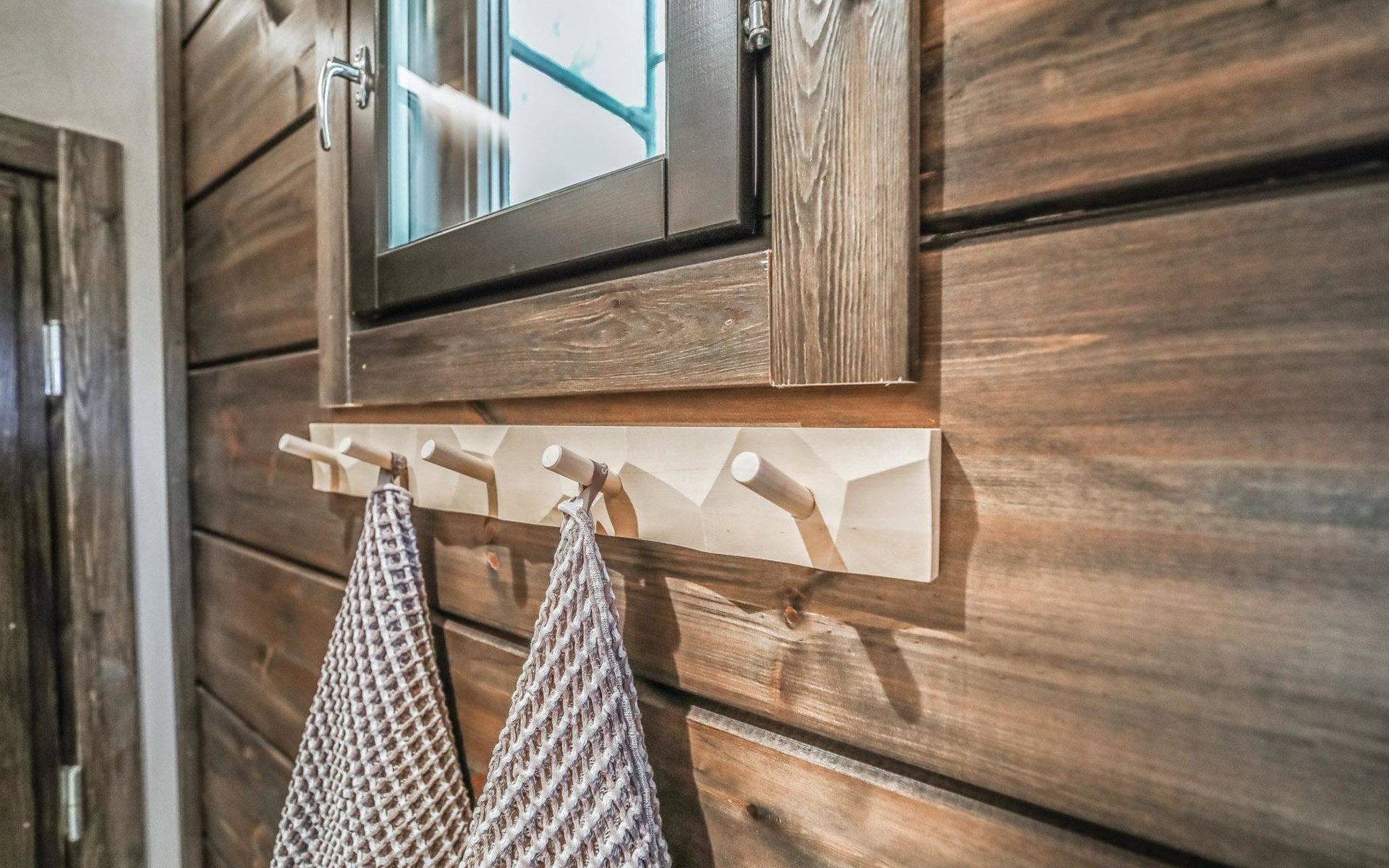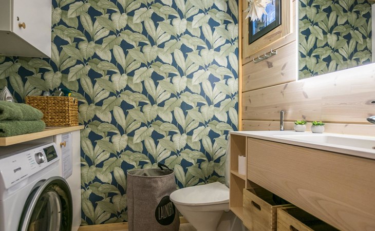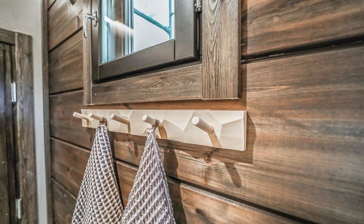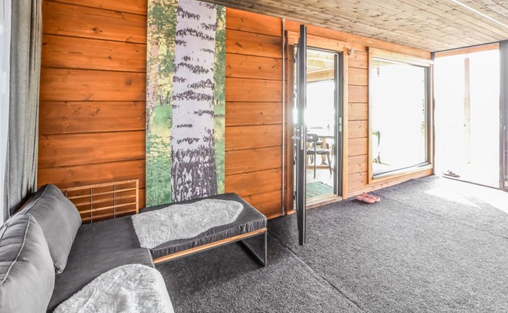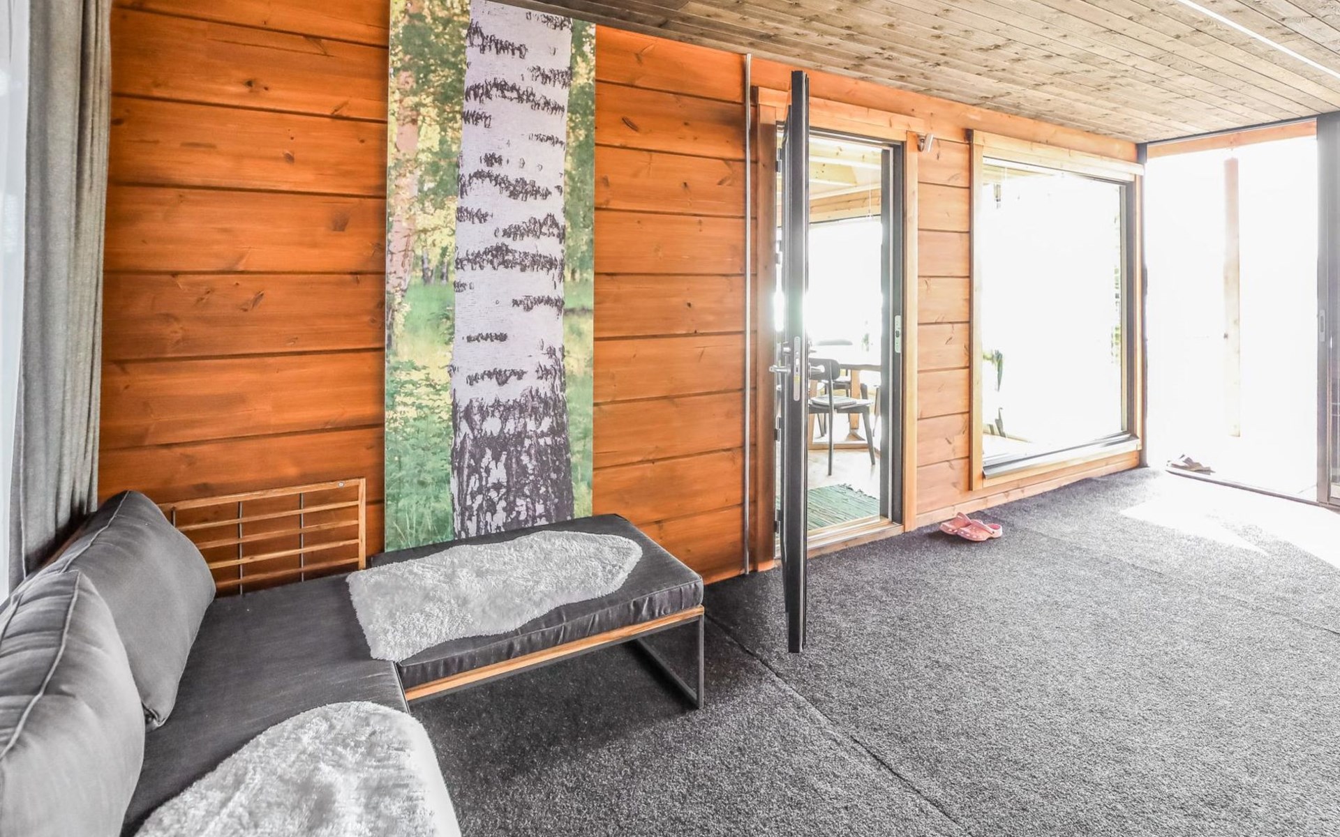 The sauna offers a unique experience with surfaces made from natural peat, creating a distinctive ambiance. The sauna area is separate from the main living space, allowing for late-night relaxation without disturbing those already asleep. It features a wood-heated sauna stove and a washroom with two showers. Between the sauna area and the main building, there is a cooling-off space with a glass-enclosed terrace, providing shelter from autumn winds and winter snow.