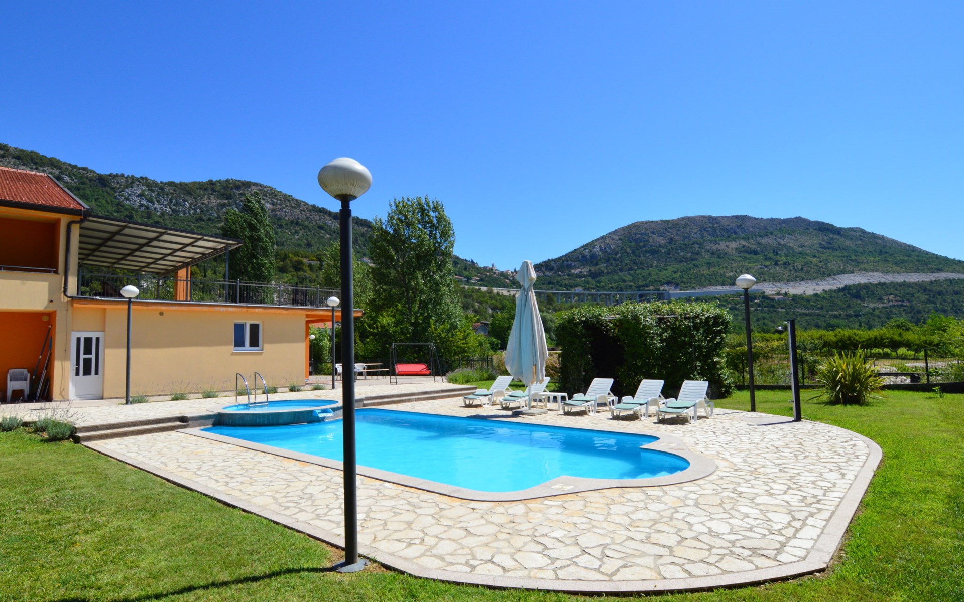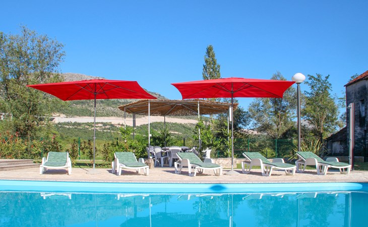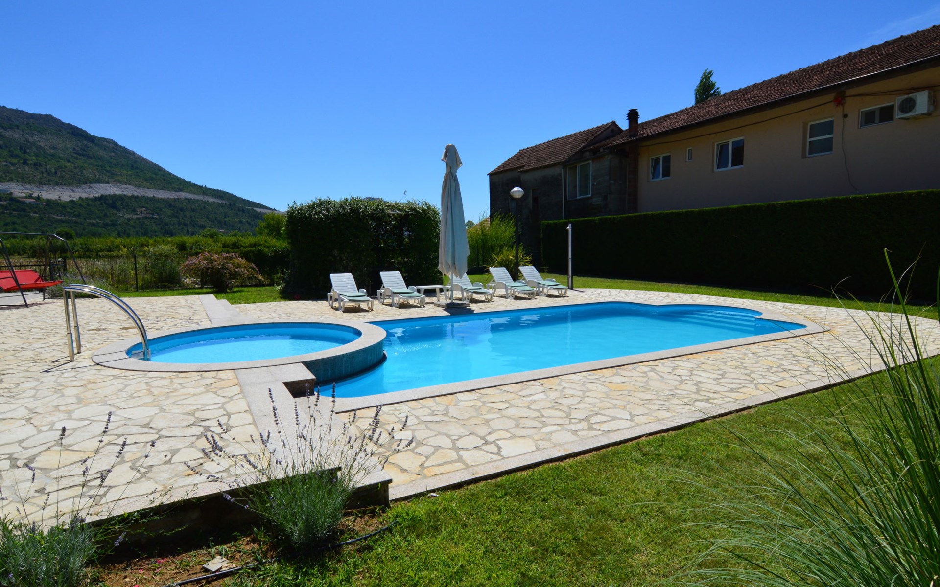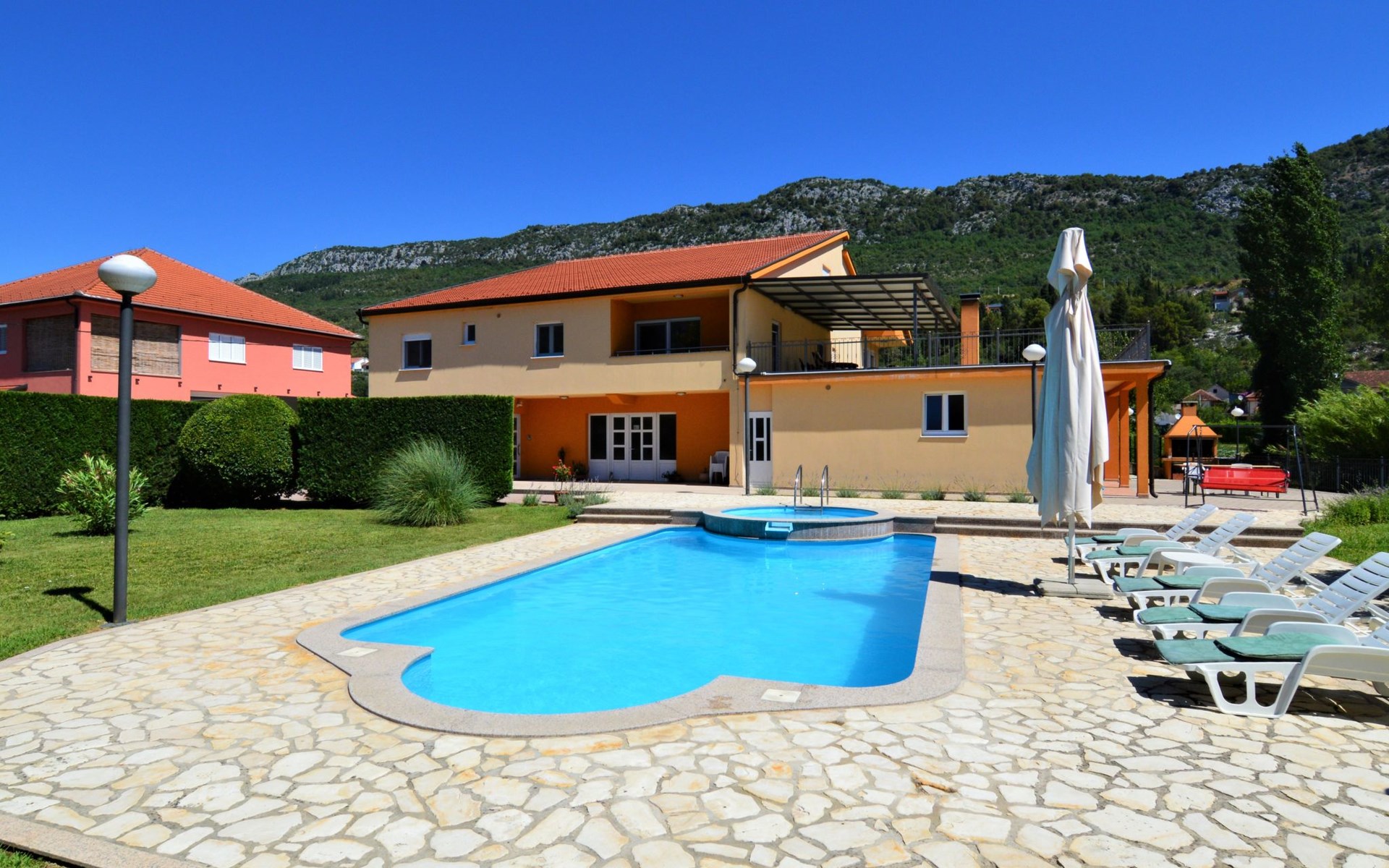 Single-family house "Villa Kikiza", 2 storeys. 400 m from the centre of Dušina, 5 km from the centre of Vrgorac, 18 km from the centre of Ploče, 18 km from the sea. Private: property 3'500 m2 with lawn and wildlife garden, swimming pool (9 x 5 m, depth 150 cm, seasonal availability: 01.May. - 01.Oct.) with internal staircase. Paddling pool, outdoor shower, hot tub, terrace (100 m2), garden furniture, barbecue, pool maintenance by the owner/gardener. In the house: internet access, sauna (extra). Hot tub (extra). Washing machine, tumble dryer, bicycle rental. Parking (for 4 cars) on the premises. Shop 400 m, supermarket 18 km, bus stop 3.3 km, pebble beach 28 km.