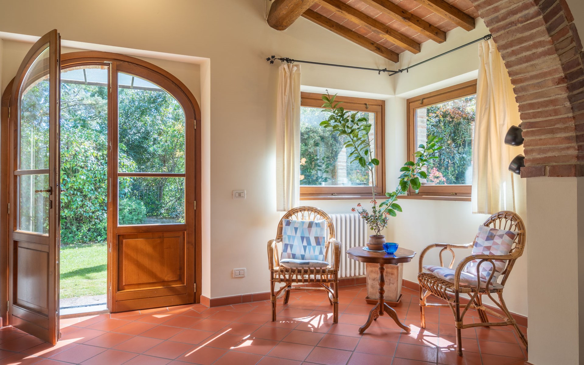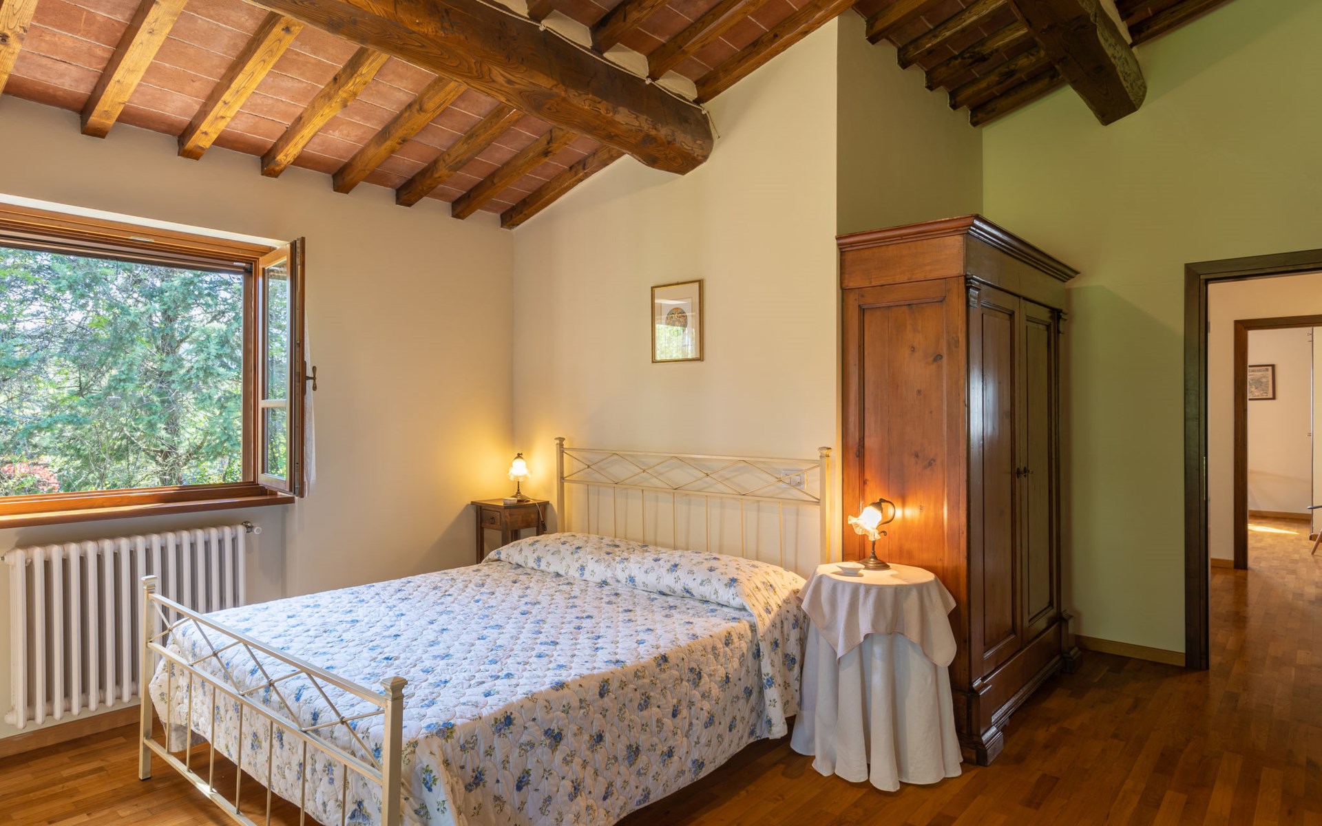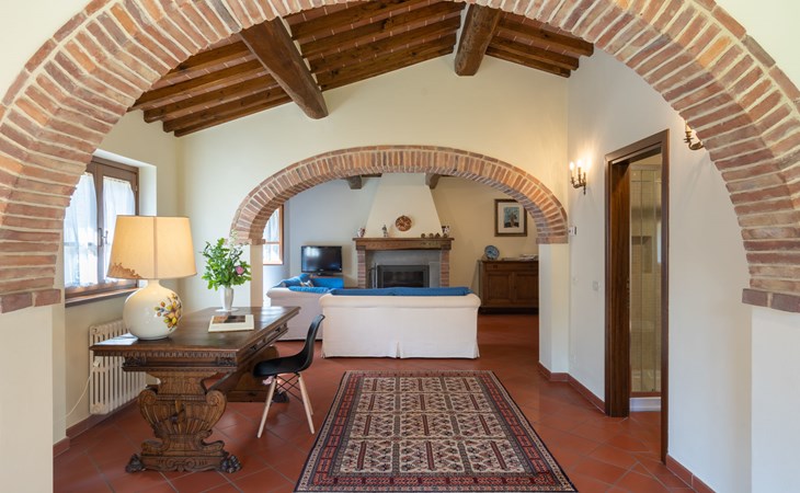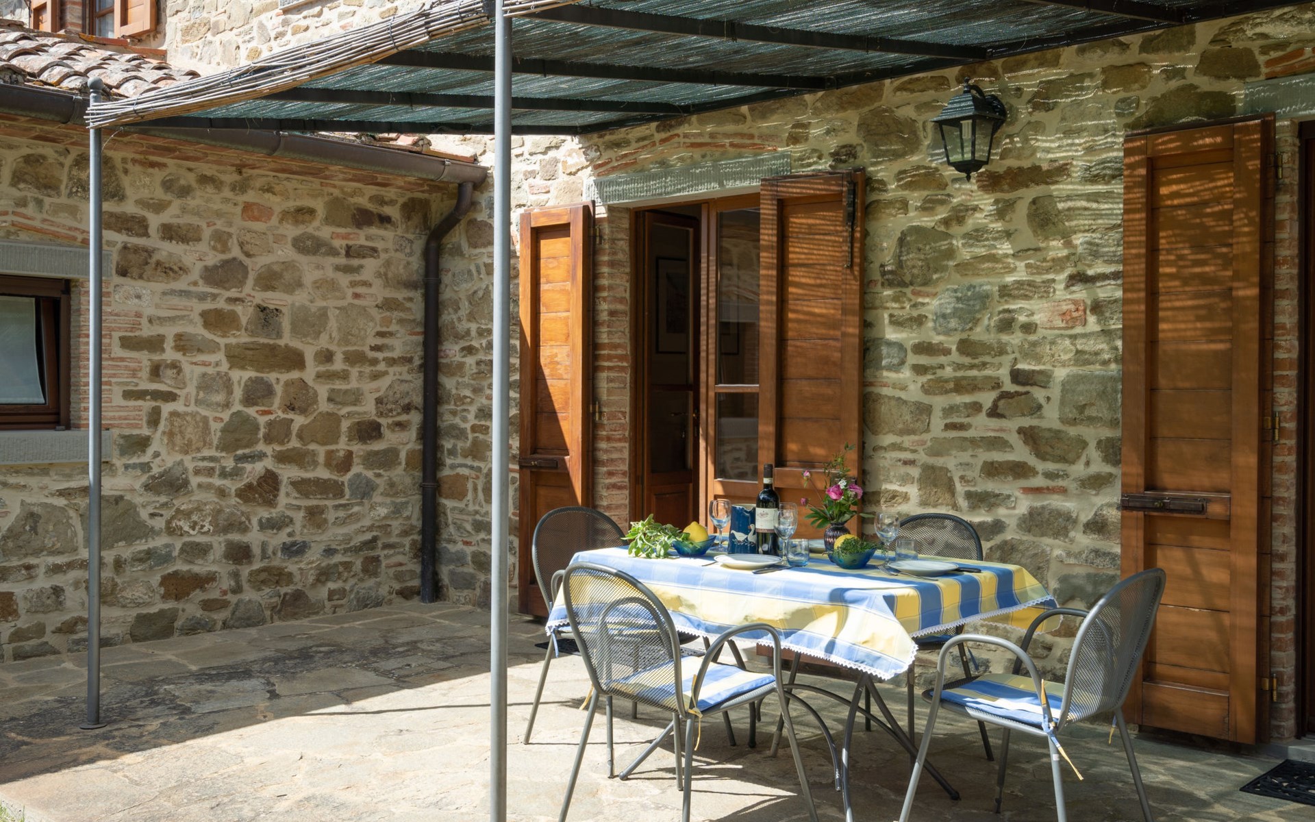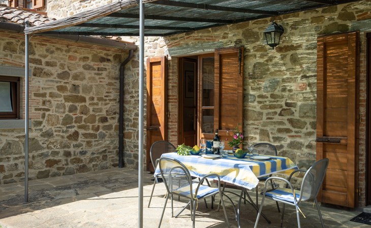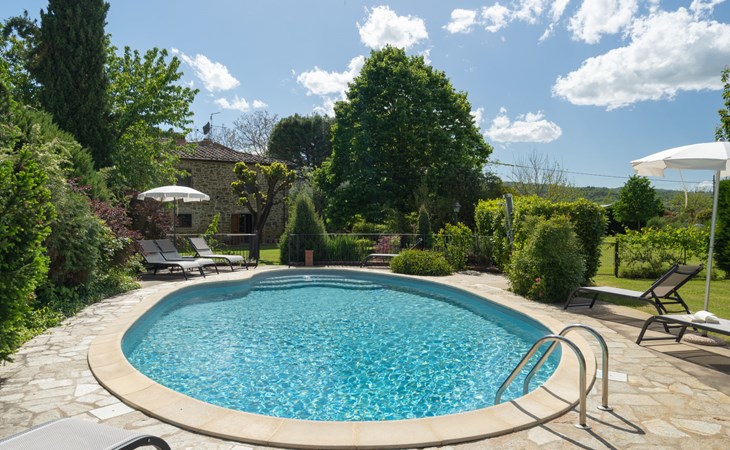 Cosy cottage, recently renovated, divided into two spaciuos parts, each with private garden of 400 m2. Under conservation act. A large fenced garden surrounds this house and the owners house which lay nearby. Swimming pool with outdoor hot water shower. View of the sunflowers fields, typical of the tuscan landcape. Sunset over the famous Gargonza castle. Private gate. Video entry phone for each apartments. The interiors are well kept, have terracotta and parquet floorings, beamed ceilings, stone archways, bedrooms had ceiling fan. Wrought iron beds. Siena 50 km. Florence 60 km. Rome is approx 2 hours by car. Cosy working farm "Casale il Giglio", renovated in 2004. 5 km from the centre of Monte San Savino, 19 km from the centre of Arezzo, 30 km from the centre of Terme di Rapolano, in the countryside. For shared use: swimming pool (11 x 5 m, depth 100 - 175 cm, seasonal availability: 27.Apr. - 12.Oct.) with salt-electrolysis pool-cleaning system. Unconventional pool shape. Outdoor shower, table tennis, boccia. Private: garden 400 m2 (fenced). Garden furniture. In the complex: WiFi, table football, heating to be paid on the spot, heating available only from 01.Nov. - 15.Apr.. Available: bicycles (4). Parking at the house. Shop 5 km, restaurant 5 km, café 5 km, bus stop 800 m, railway station "Monte San Savino" 5 km. Riding stable 10 km. Please note: car recommended. Suitable for families, suitable for seniors. The owner lives on the same property. The complex has another 1 house for rent.