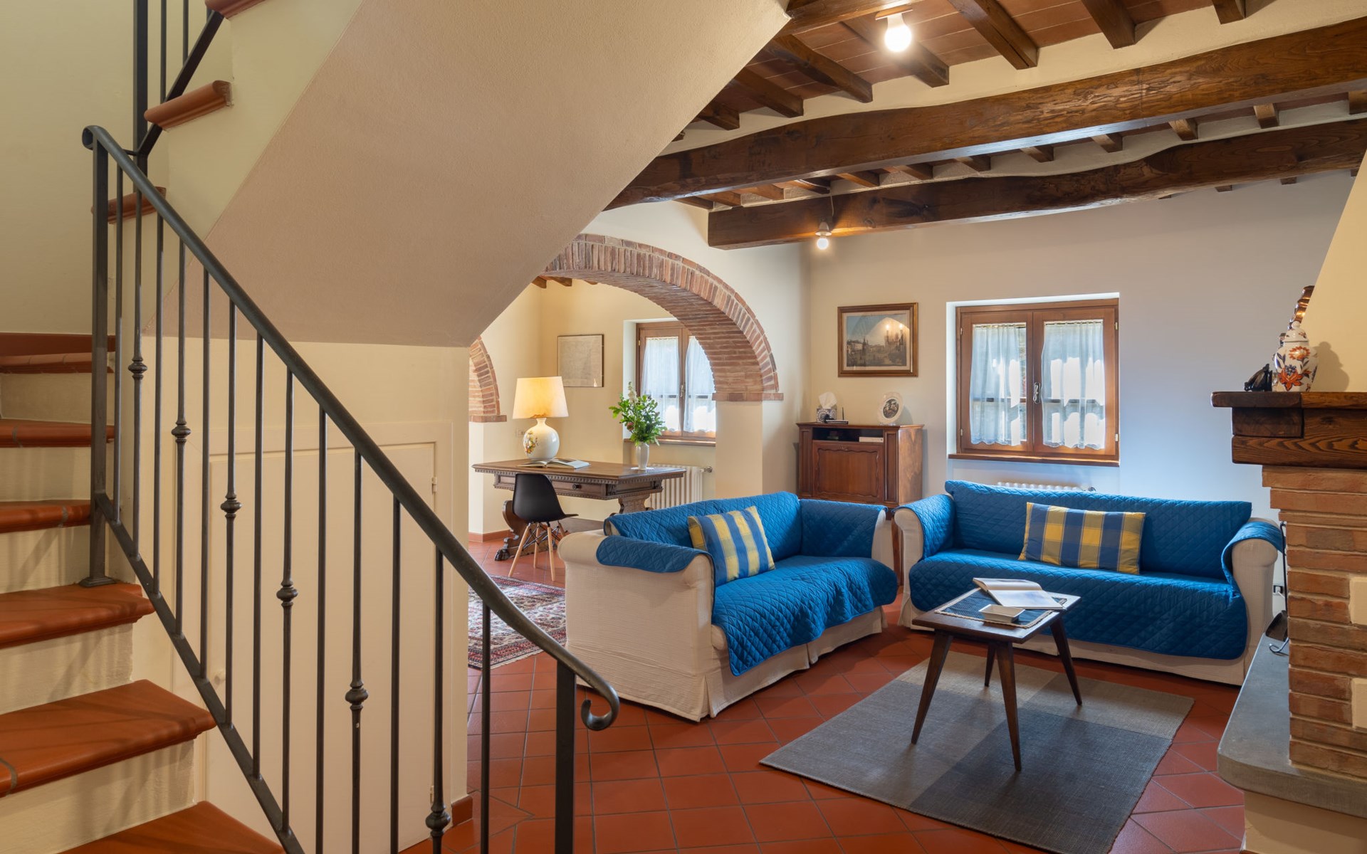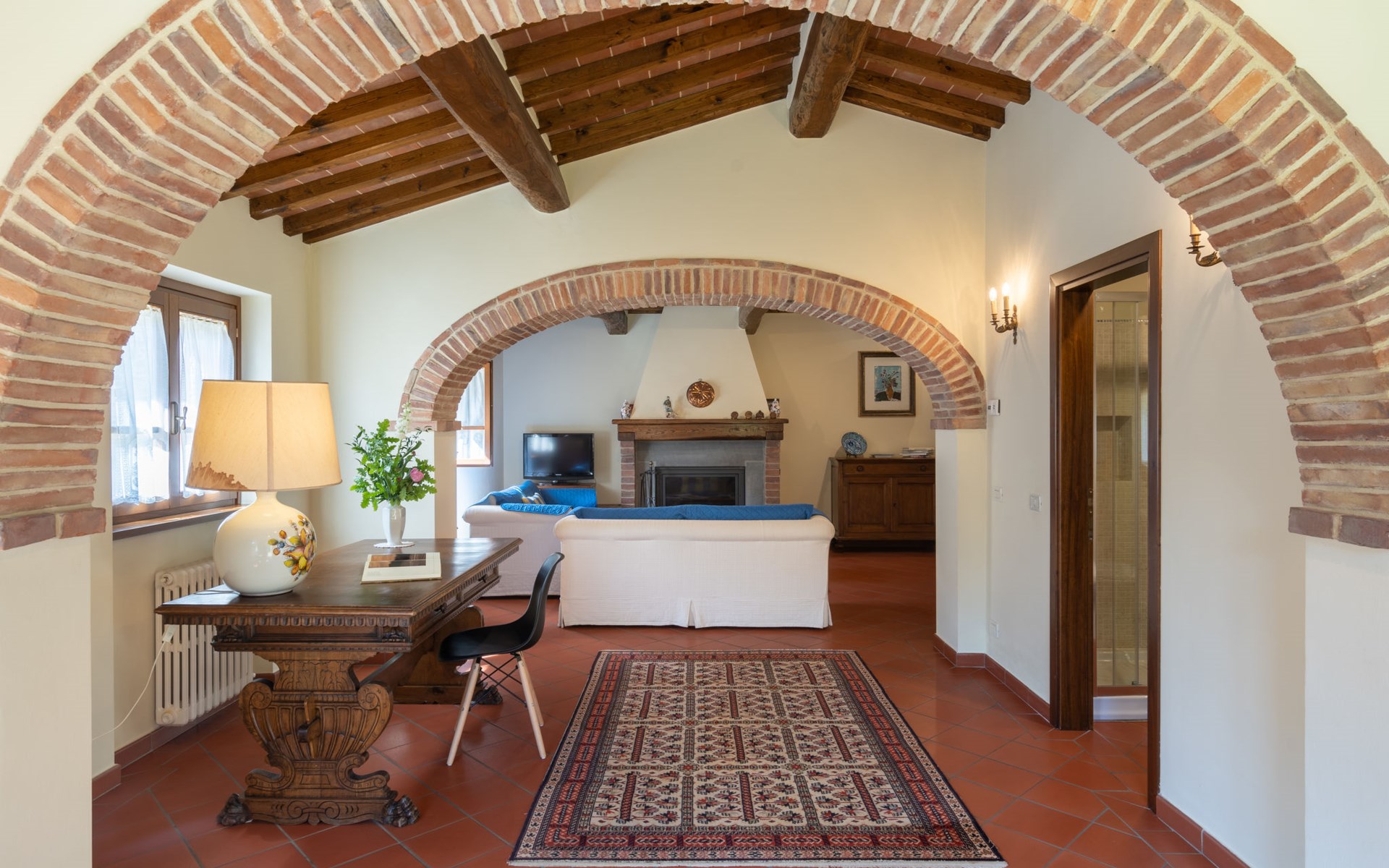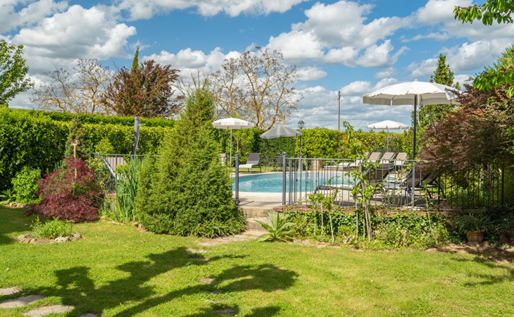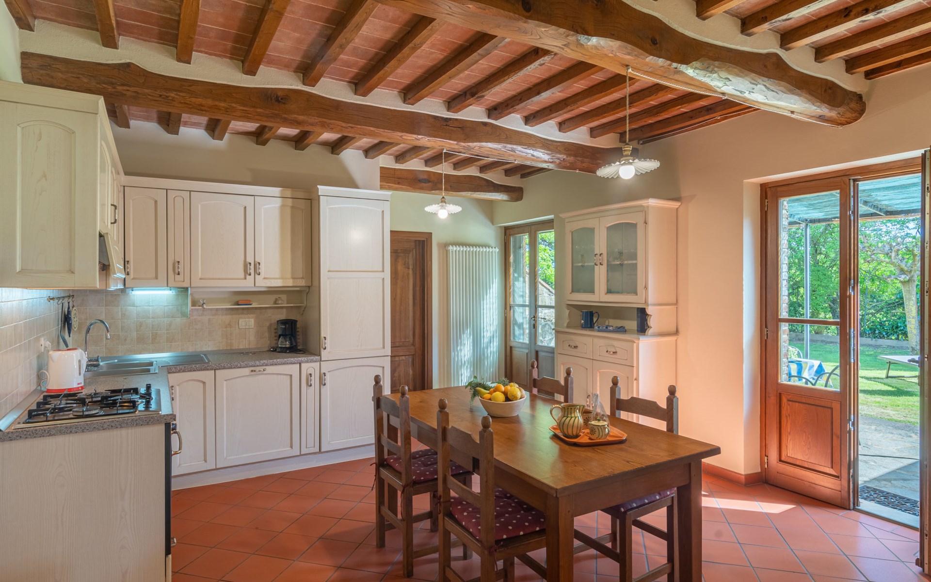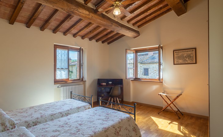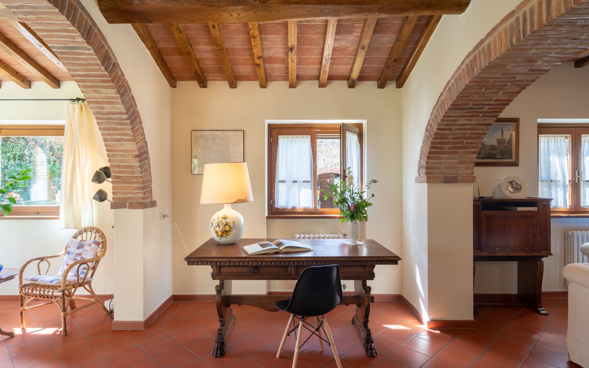 Cosy cottage, recently renovated, divided into two spaciuos parts, each with private garden of 400 m2. Under conservation act. A large fenced garden surrounds this house and the owners house which lay nearby. Swimming pool with outdoor hot water shower. View of the sunflowers fields, typical of the tuscan landcape. Sunset over the famous Gargonza castle. Private gate. Video entry phone for each apartments. The interiors are well kept, have terracotta and parquet floorings, beamed ceilings, stone archways, bedrooms had ceiling fan. Wrought iron beds. Siena 50 km. Florence 60 km. Rome is approx 2 hours by car. Cosy working farm "Casale il Giglio", renovated in 2004. 5 km from the centre of Monte San Savino, 19 km from the centre of Arezzo, 30 km from the centre of Terme di Rapolano, in the countryside. For shared use: swimming pool (11 x 5 m, depth 100 - 175 cm, seasonal availability: 27.Apr. - 12.Oct.) with salt-electrolysis pool-cleaning system. Unconventional pool shape. Outdoor shower, table tennis, boccia. Private: garden 400 m2 (fenced). Garden furniture. In the complex: WiFi, table football, heating to be paid on the spot, heating available only from 01.Nov. - 15.Apr.. Available: bicycles (4). Parking at the house. Shop 5 km, restaurant 5 km, café 5 km, bus stop 800 m, railway station "Monte San Savino" 5 km. Riding stable 10 km. Please note: car recommended. Suitable for families, suitable for seniors. The owner lives on the same property. The complex has another 1 house for rent.