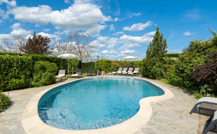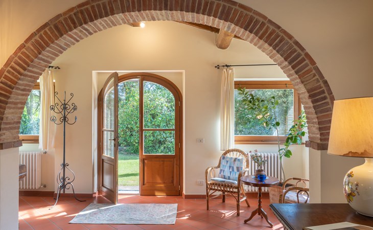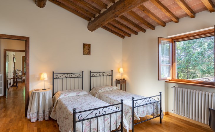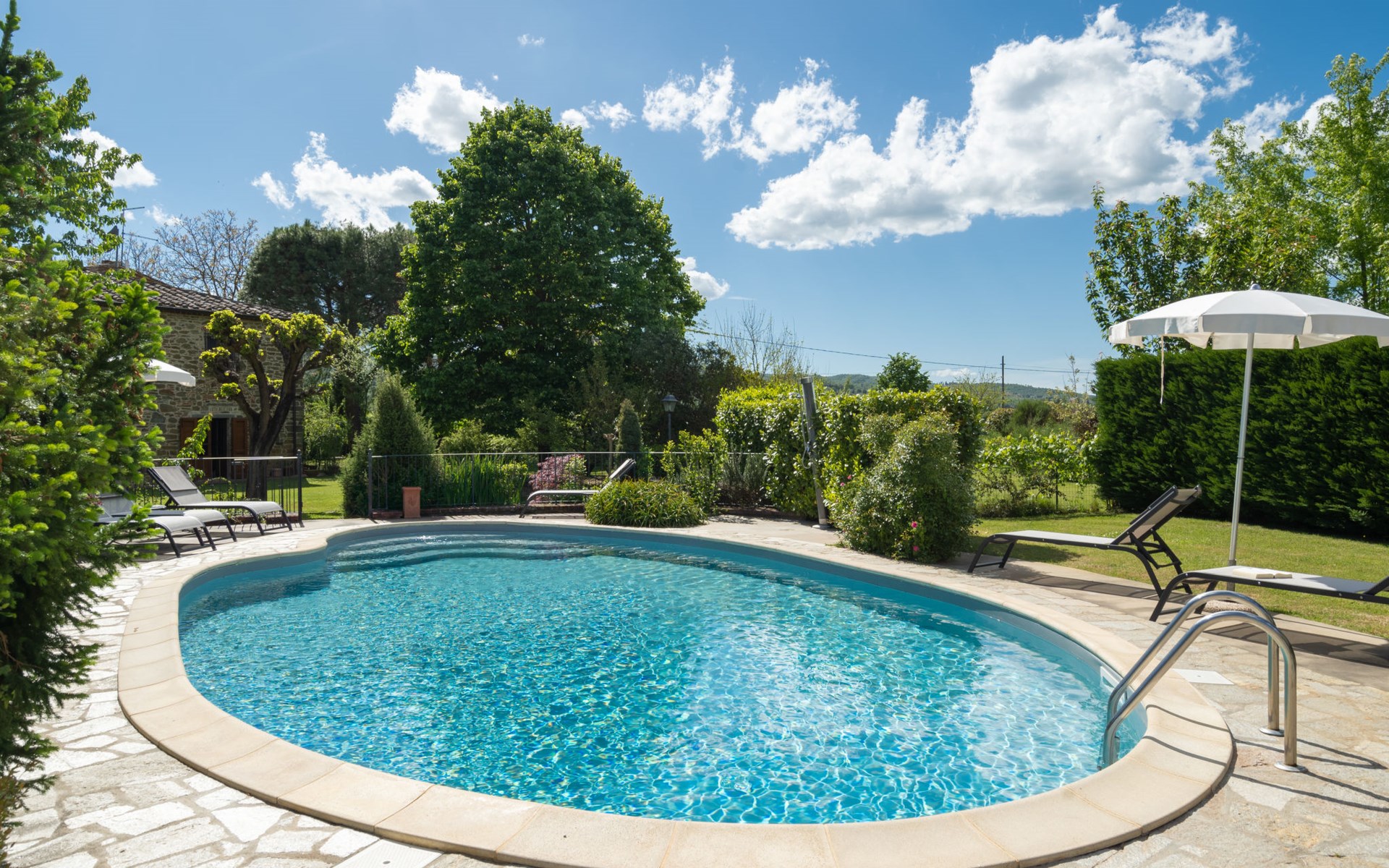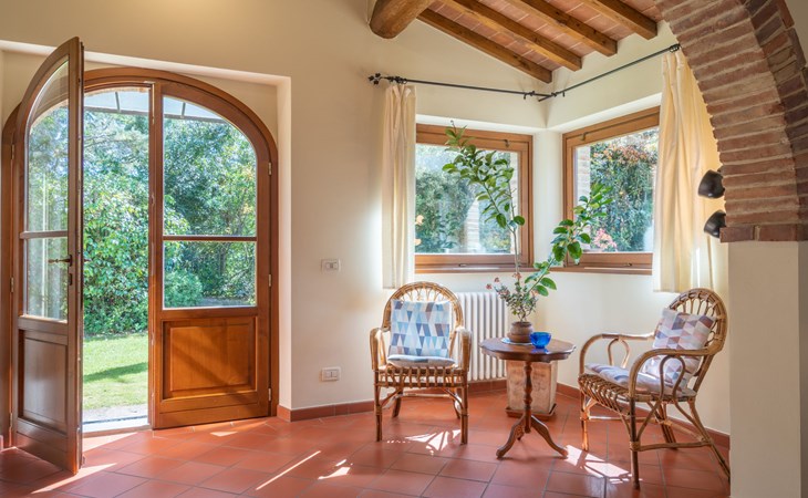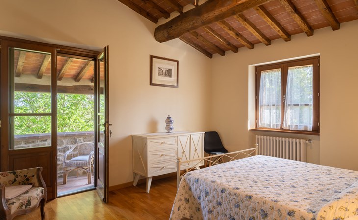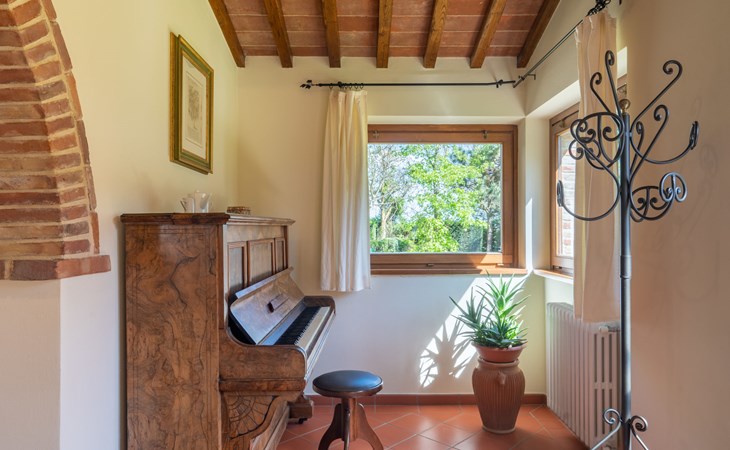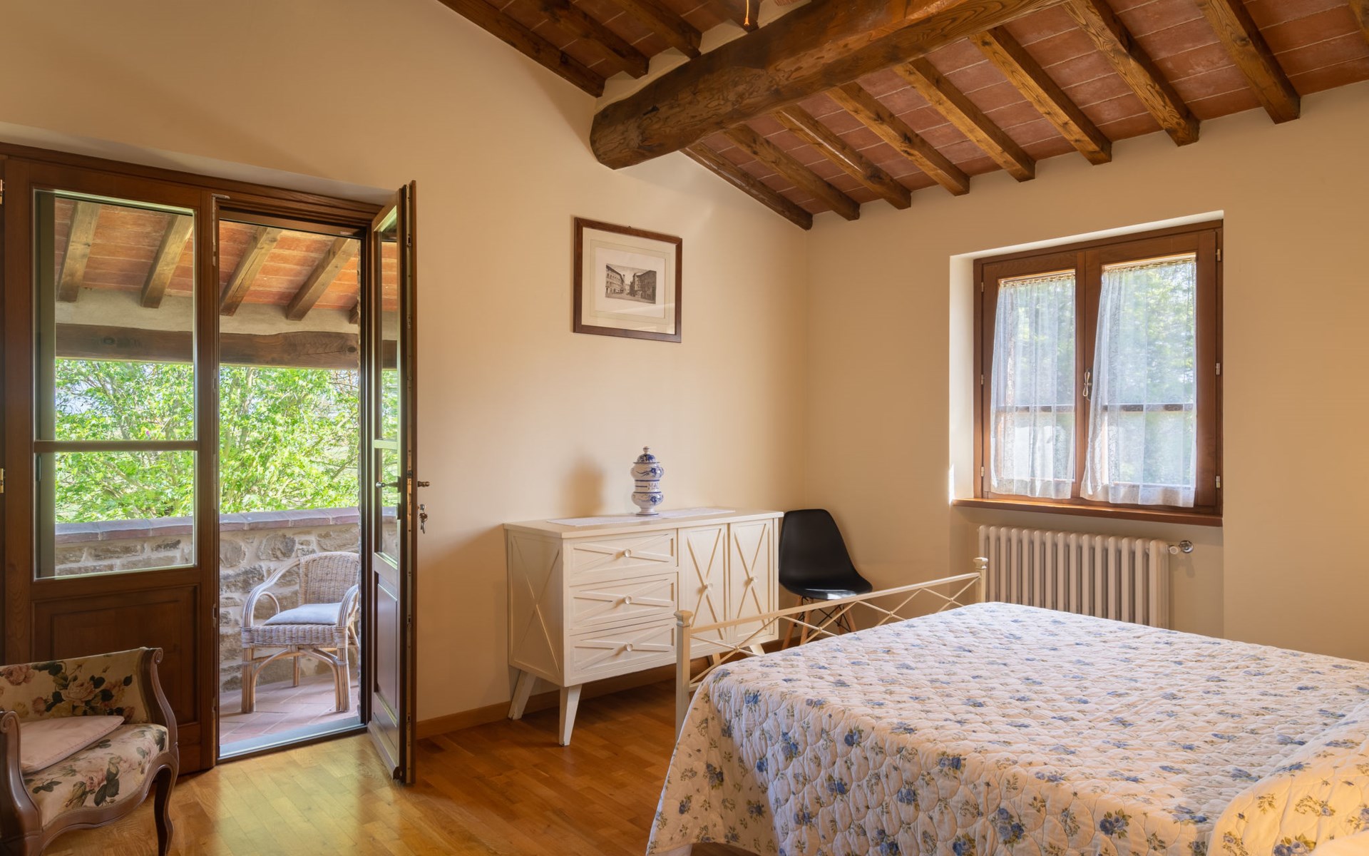 Cosy cottage, recently renovated, divided into two spaciuos parts, each with private garden of 400 m2. Under conservation act. A large fenced garden surrounds this house and the owners house which lay nearby. Swimming pool with outdoor hot water shower. View of the sunflowers fields, typical of the tuscan landcape. Sunset over the famous Gargonza castle. Private gate. Video entry phone for each apartments. The interiors are well kept, have terracotta and parquet floorings, beamed ceilings, stone archways, bedrooms had ceiling fan. Wrought iron beds. Siena 50 km. Florence 60 km. Rome is approx 2 hours by car. Cosy working farm "Casale il Giglio", renovated in 2004. 5 km from the centre of Monte San Savino, 19 km from the centre of Arezzo, 30 km from the centre of Terme di Rapolano, in the countryside. For shared use: swimming pool (11 x 5 m, depth 100 - 175 cm, seasonal availability: 27.Apr. - 12.Oct.) with salt-electrolysis pool-cleaning system. Unconventional pool shape. Outdoor shower, table tennis, boccia. Private: garden 400 m2 (fenced). Garden furniture. In the complex: WiFi, table football, heating to be paid on the spot, heating available only from 01.Nov. - 15.Apr.. Available: bicycles (4). Parking at the house. Shop 5 km, restaurant 5 km, café 5 km, bus stop 800 m, railway station "Monte San Savino" 5 km. Riding stable 10 km. Please note: car recommended. Suitable for families, suitable for seniors. The owner lives on the same property. The complex has another 1 house for rent.