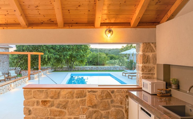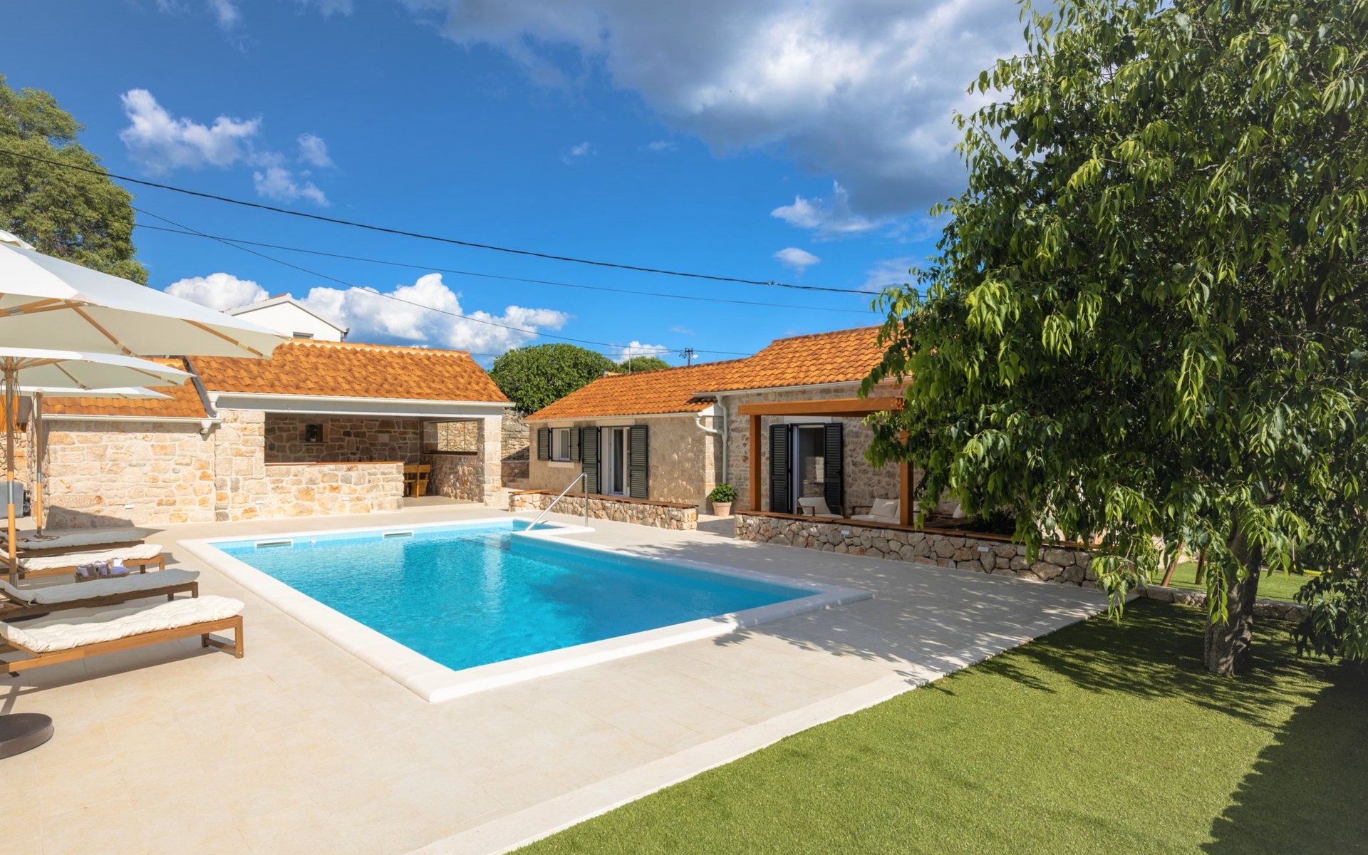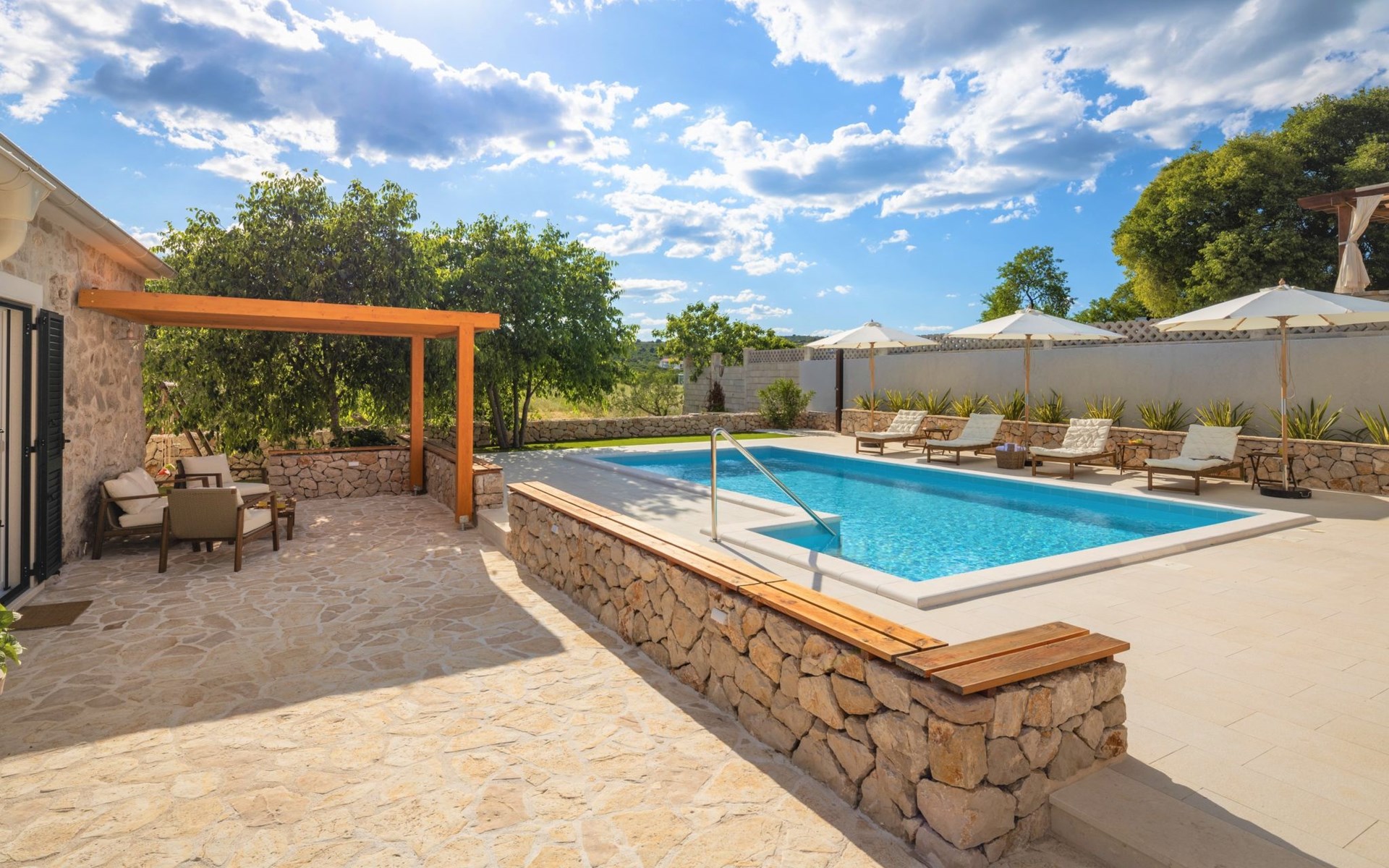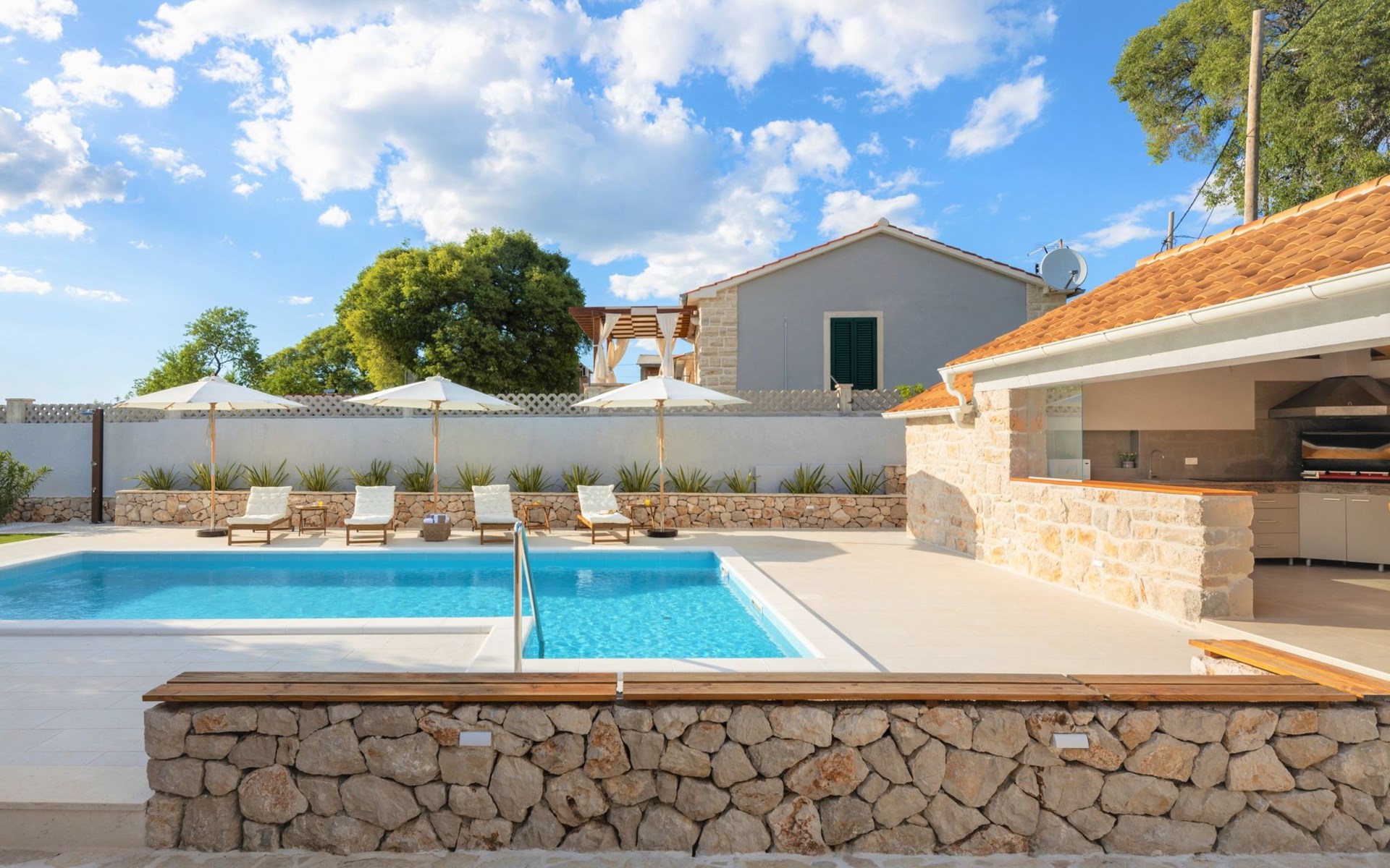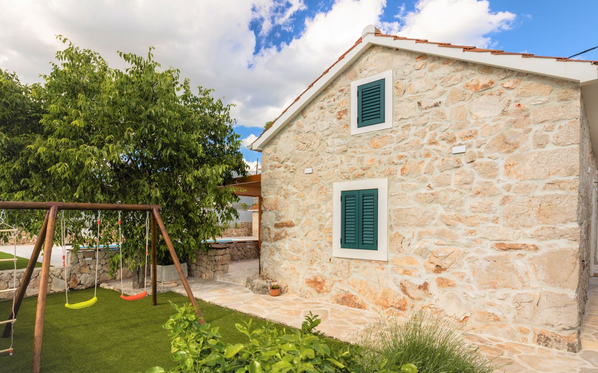 Beautiful single-family house "Villa di Perla", built in 2024. 3.5 km from the centre of Primošten, in a sunny position, 3 km from the sea, 3 km from the beach. Private: property 620 m2 (fenced), garden with trees, swimming pool angular (38 m2, depth 150 cm, seasonal availability: 01.May. - 31.Oct.). Outdoor shower, pool house with fridge and cooking stove, terrace (30 m2), garden furniture, children's playground (swing). In the house: internet access, washing machine. Parking (for 2 cars) at the house on the premises. Shop 3 km, restaurant 3 km, bus stop 3.3 km, pebble beach 3 km. Marina 6 km. Please note: suitable for families. The owner does not accept any youth groups. The unit consists of the small, separate house and the main house rented as one unit.