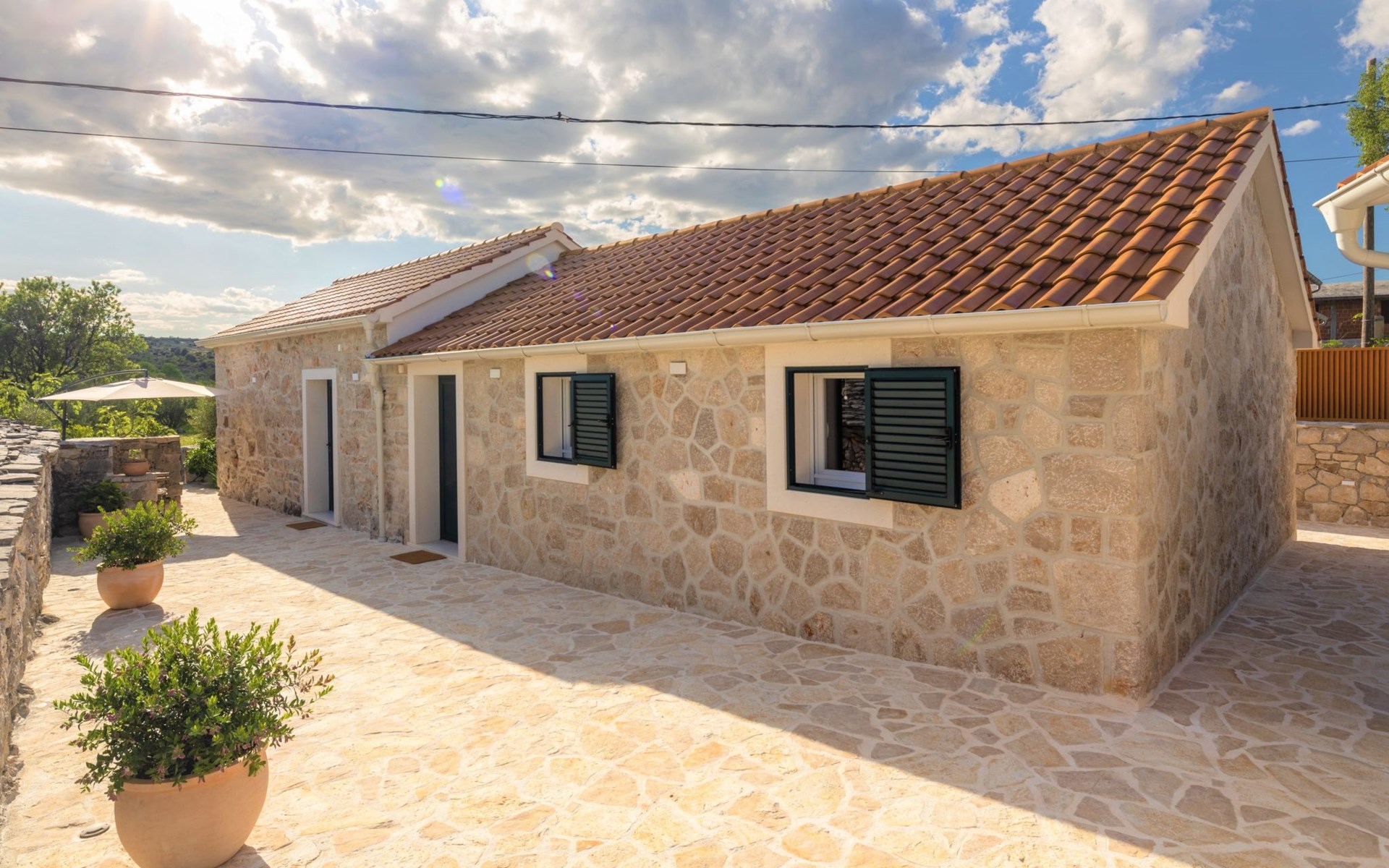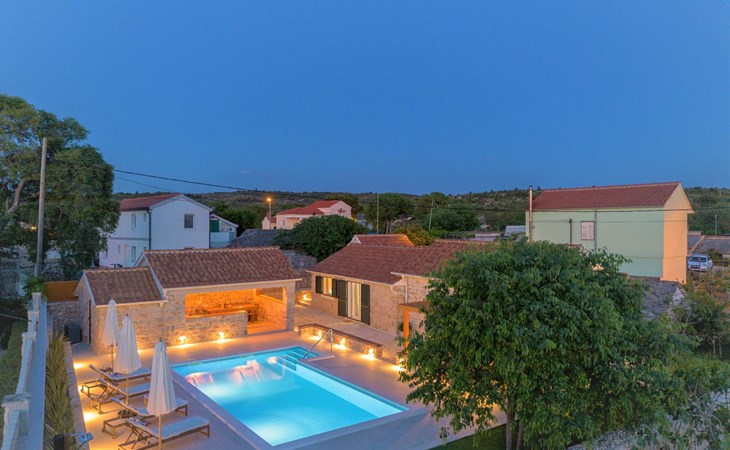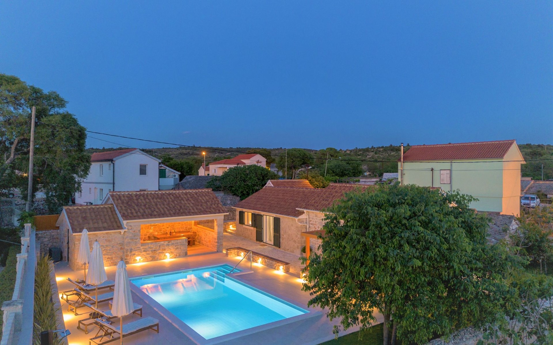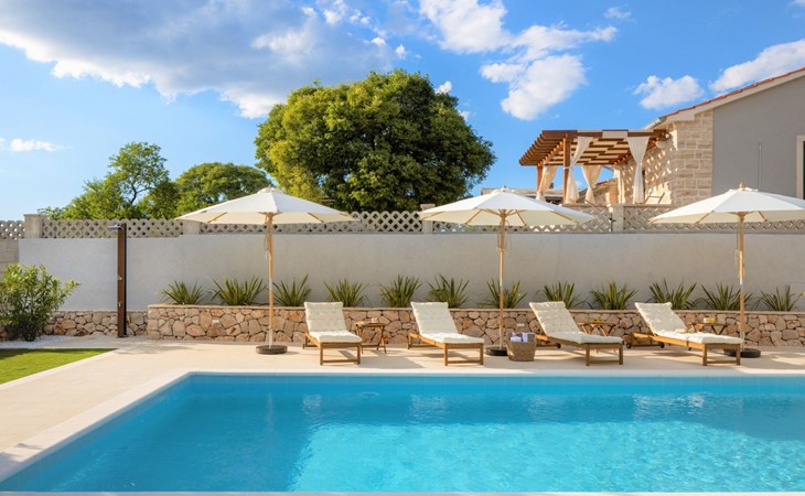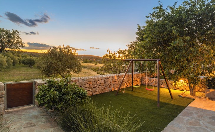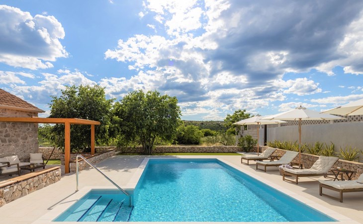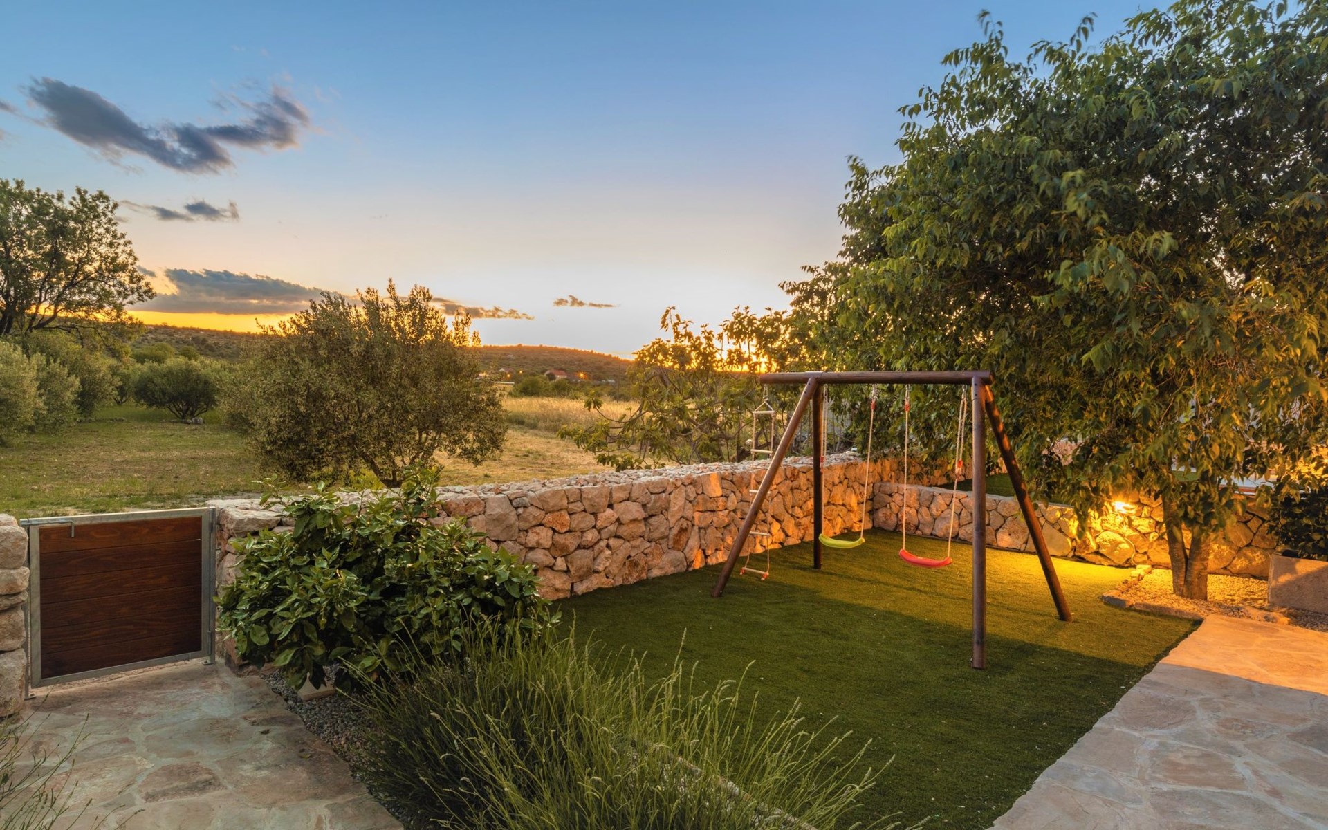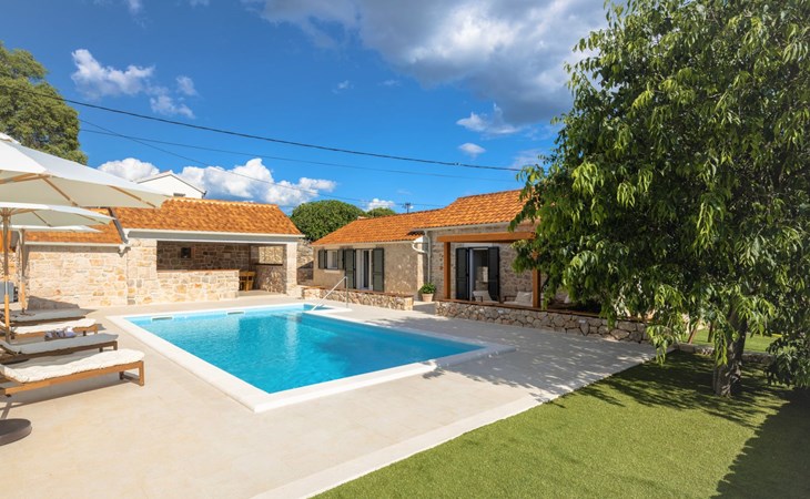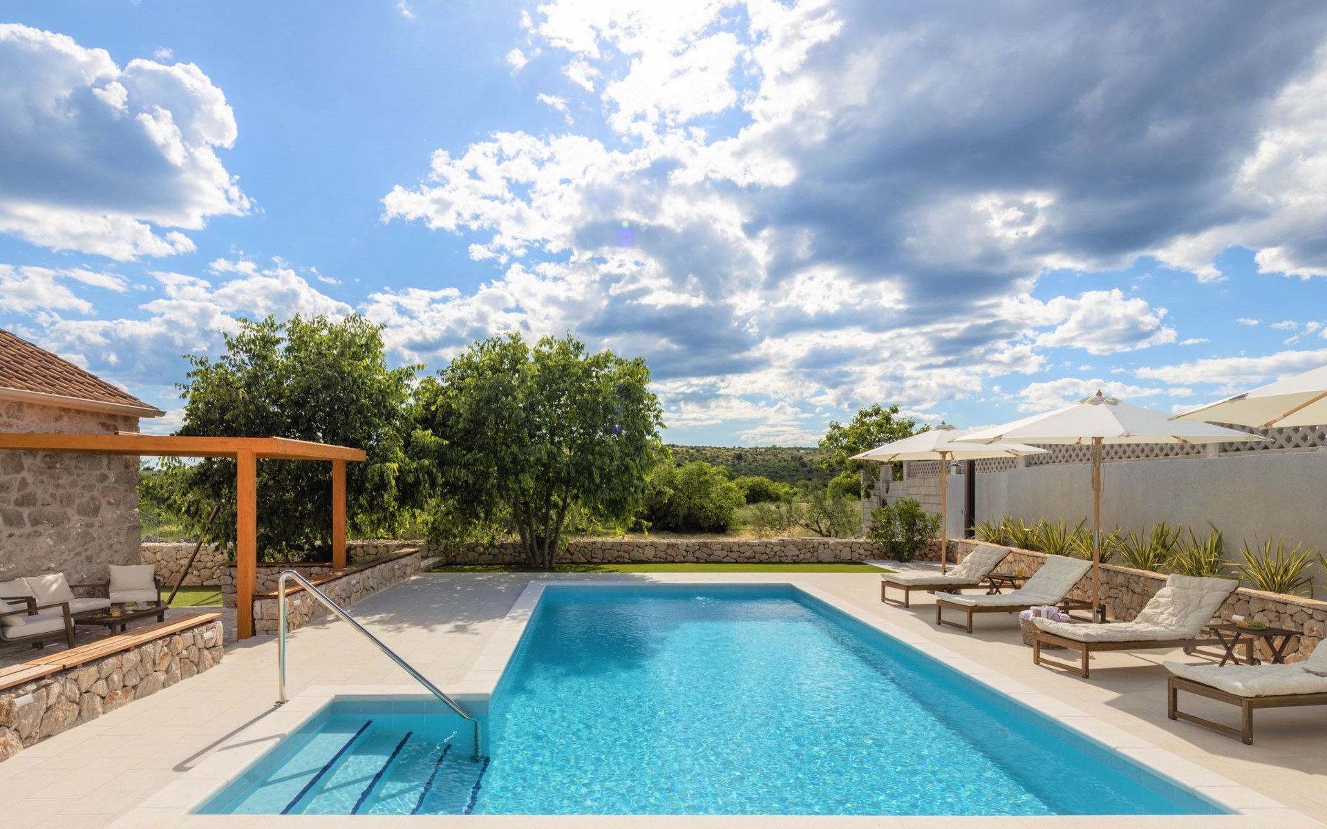 Beautiful single-family house "Villa di Perla", built in 2024. 3.5 km from the centre of Primošten, in a sunny position, 3 km from the sea, 3 km from the beach. Private: property 620 m2 (fenced), garden with trees, swimming pool angular (38 m2, depth 150 cm, seasonal availability: 01.May. - 31.Oct.). Outdoor shower, pool house with fridge and cooking stove, terrace (30 m2), garden furniture, children's playground (swing). In the house: internet access, washing machine. Parking (for 2 cars) at the house on the premises. Shop 3 km, restaurant 3 km, bus stop 3.3 km, pebble beach 3 km. Marina 6 km. Please note: suitable for families. The owner does not accept any youth groups. The unit consists of the small, separate house and the main house rented as one unit.
