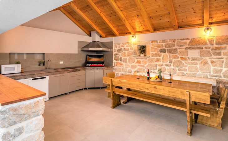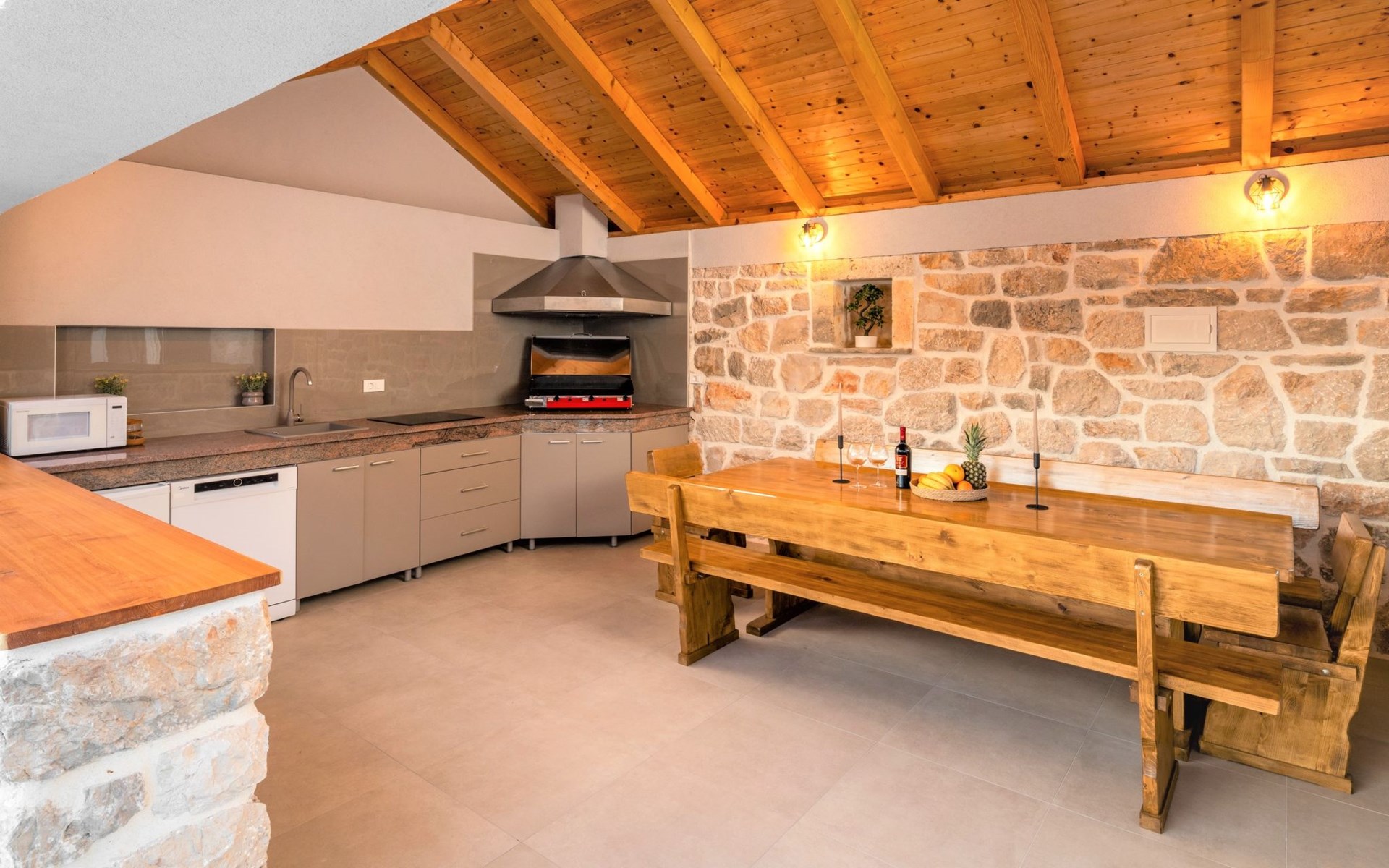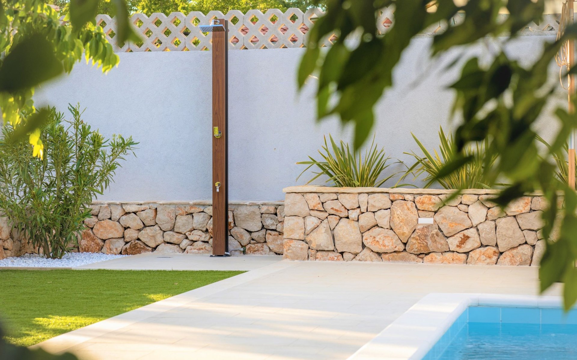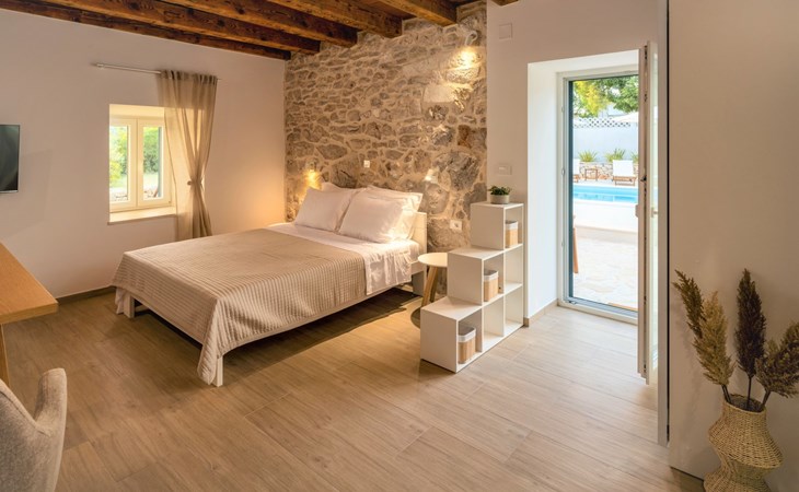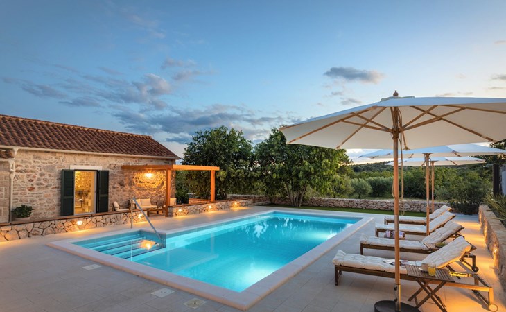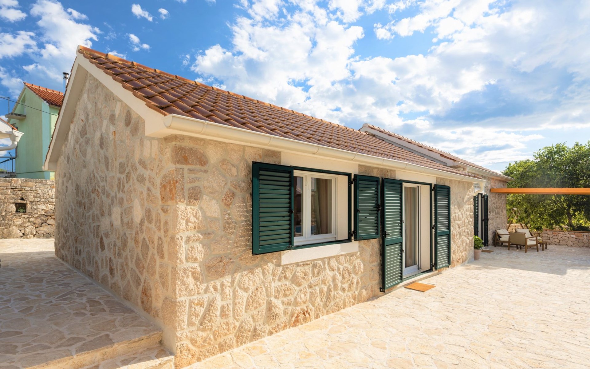 Beautiful single-family house "Villa di Perla", built in 2024. 3.5 km from the centre of Primošten, in a sunny position, 3 km from the sea, 3 km from the beach. Private: property 620 m2 (fenced), garden with trees, swimming pool angular (38 m2, depth 150 cm, seasonal availability: 01.May. - 31.Oct.). Outdoor shower, pool house with fridge and cooking stove, terrace (30 m2), garden furniture, children's playground (swing). In the house: internet access, washing machine. Parking (for 2 cars) at the house on the premises. Shop 3 km, restaurant 3 km, bus stop 3.3 km, pebble beach 3 km. Marina 6 km. Please note: suitable for families. The owner does not accept any youth groups. The unit consists of the small, separate house and the main house rented as one unit.