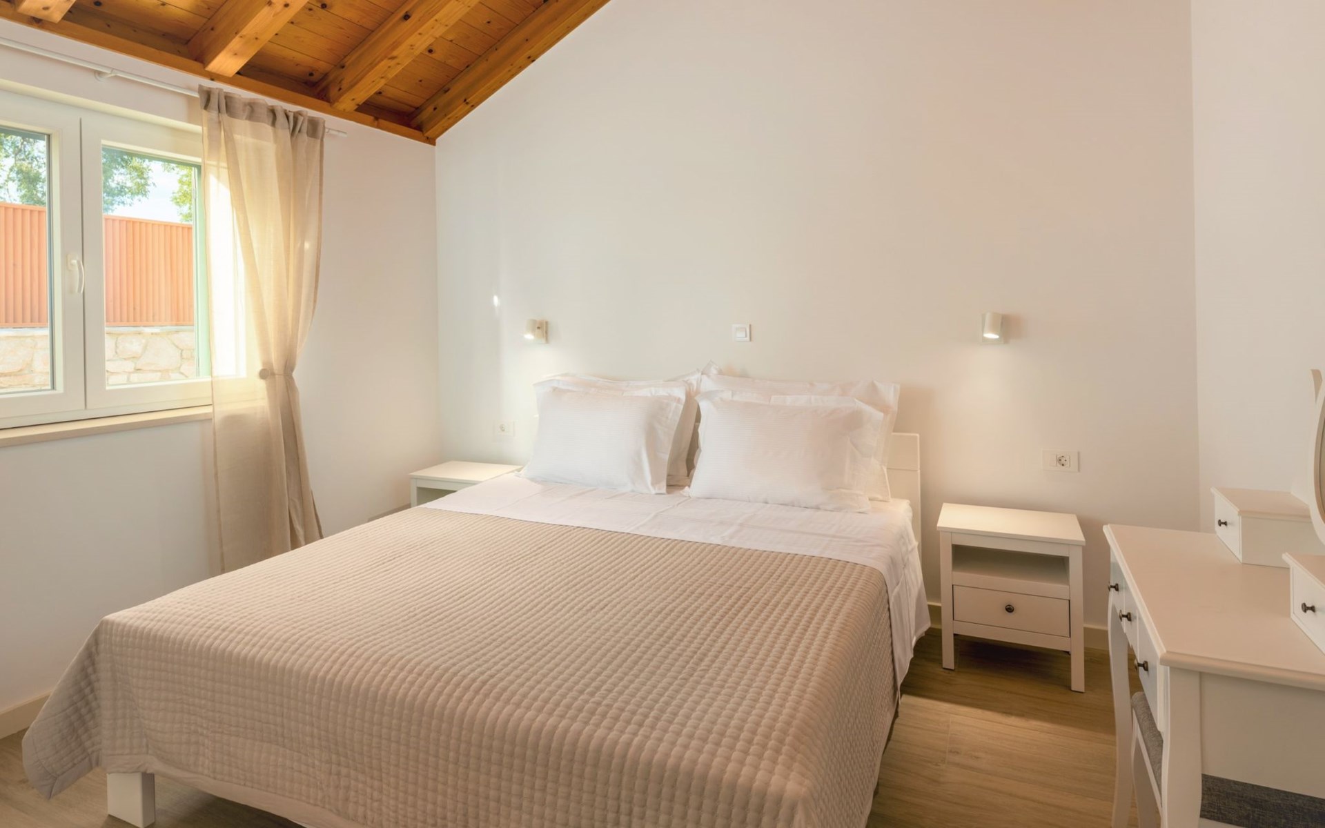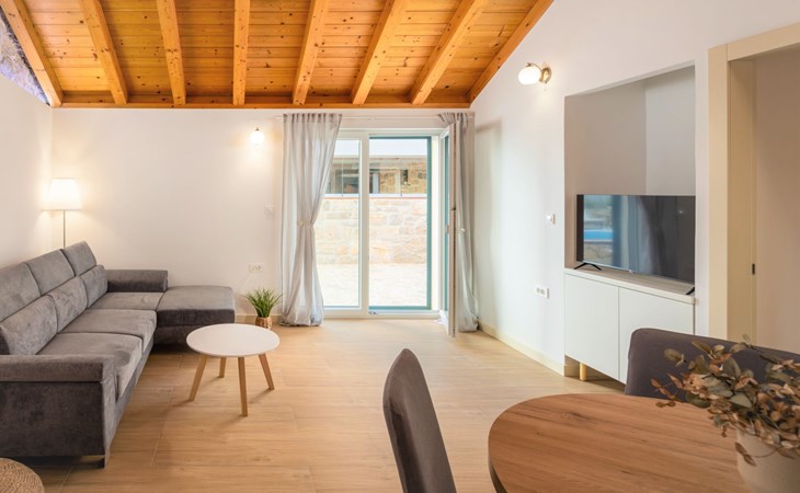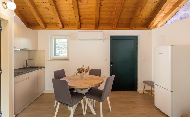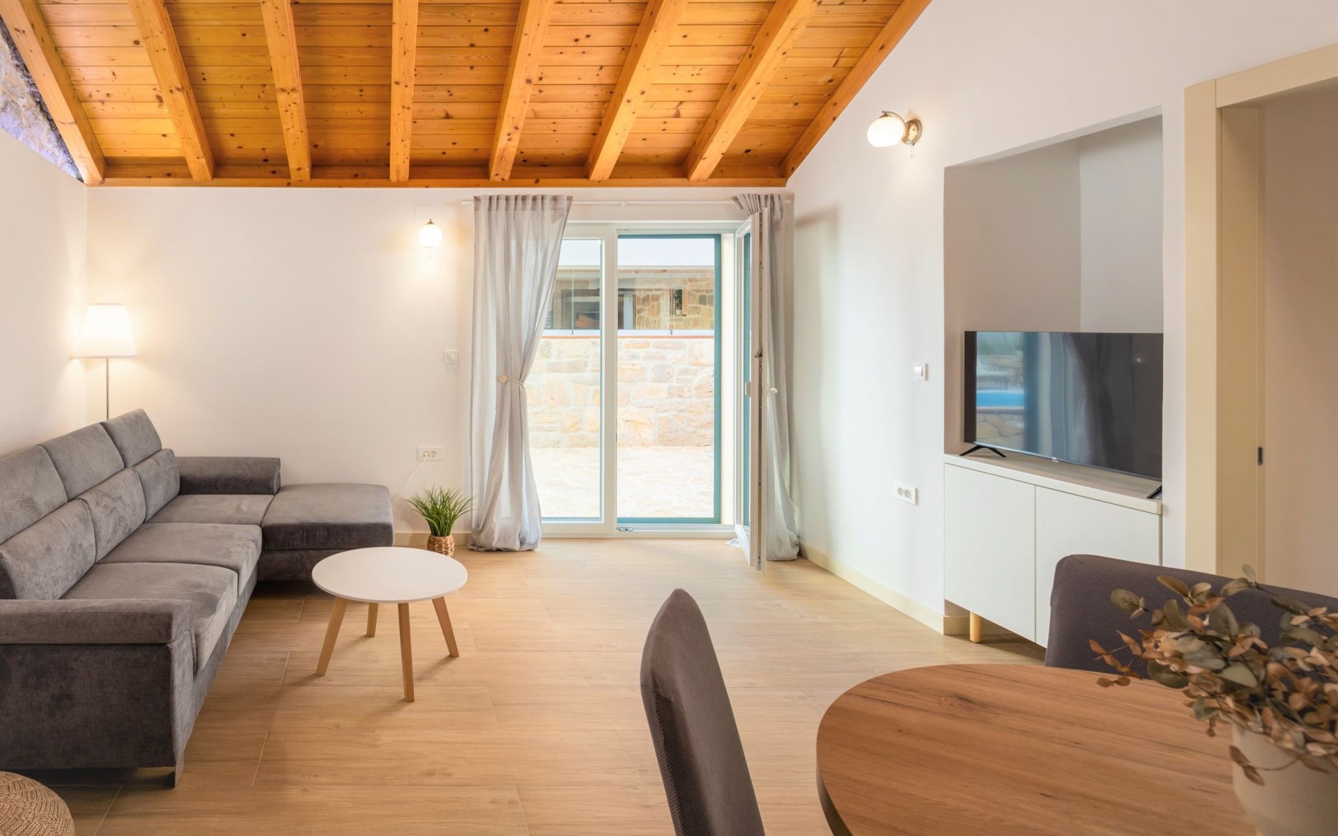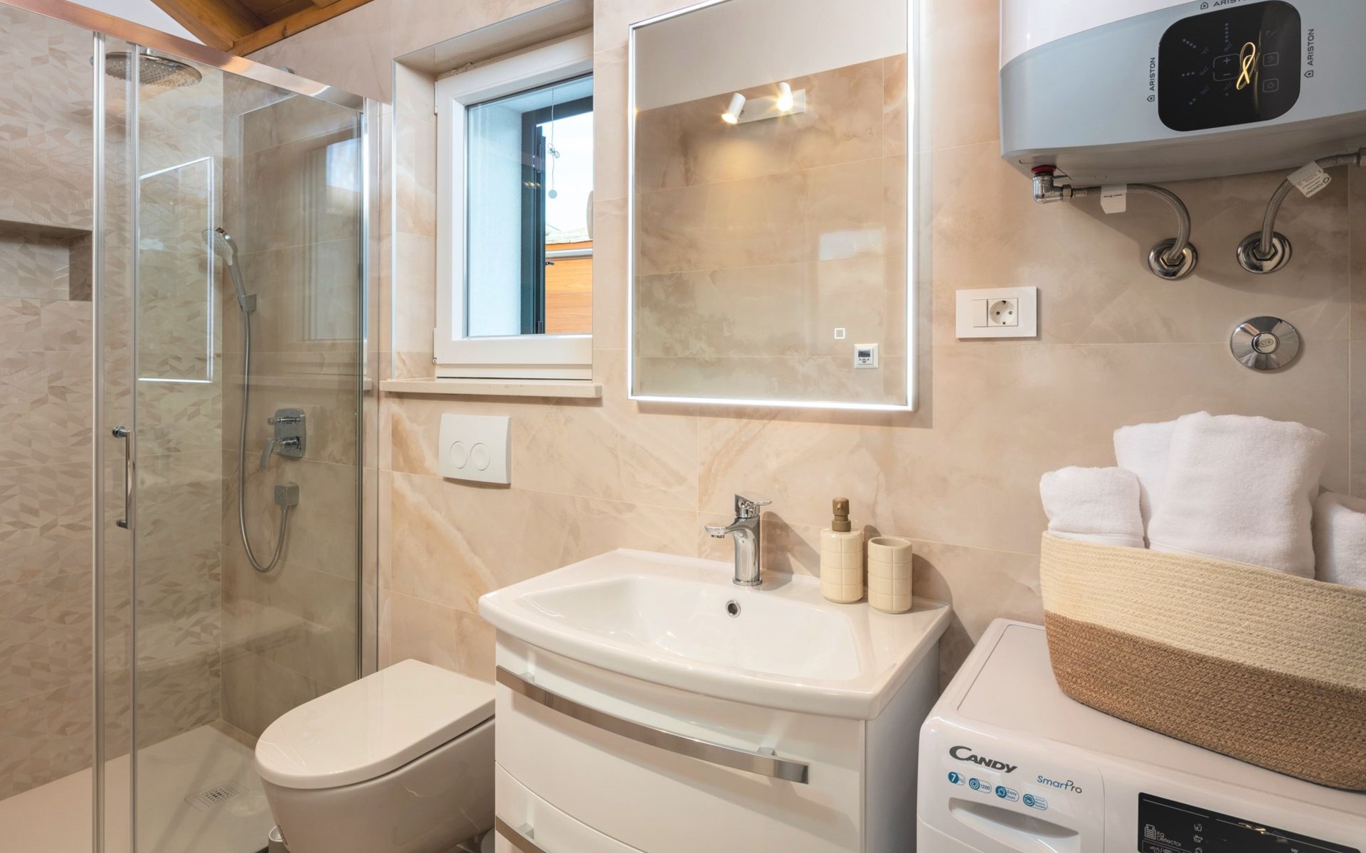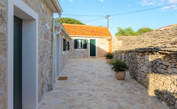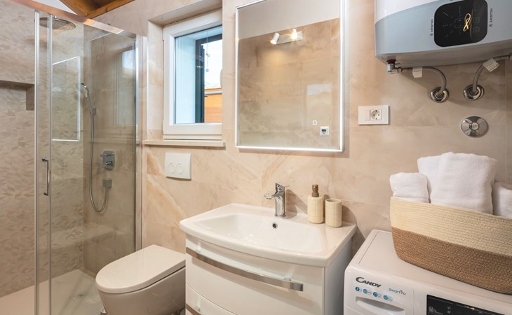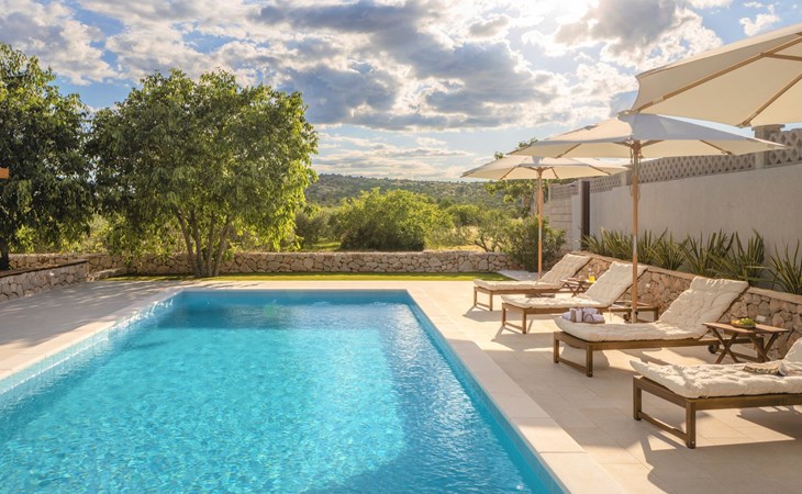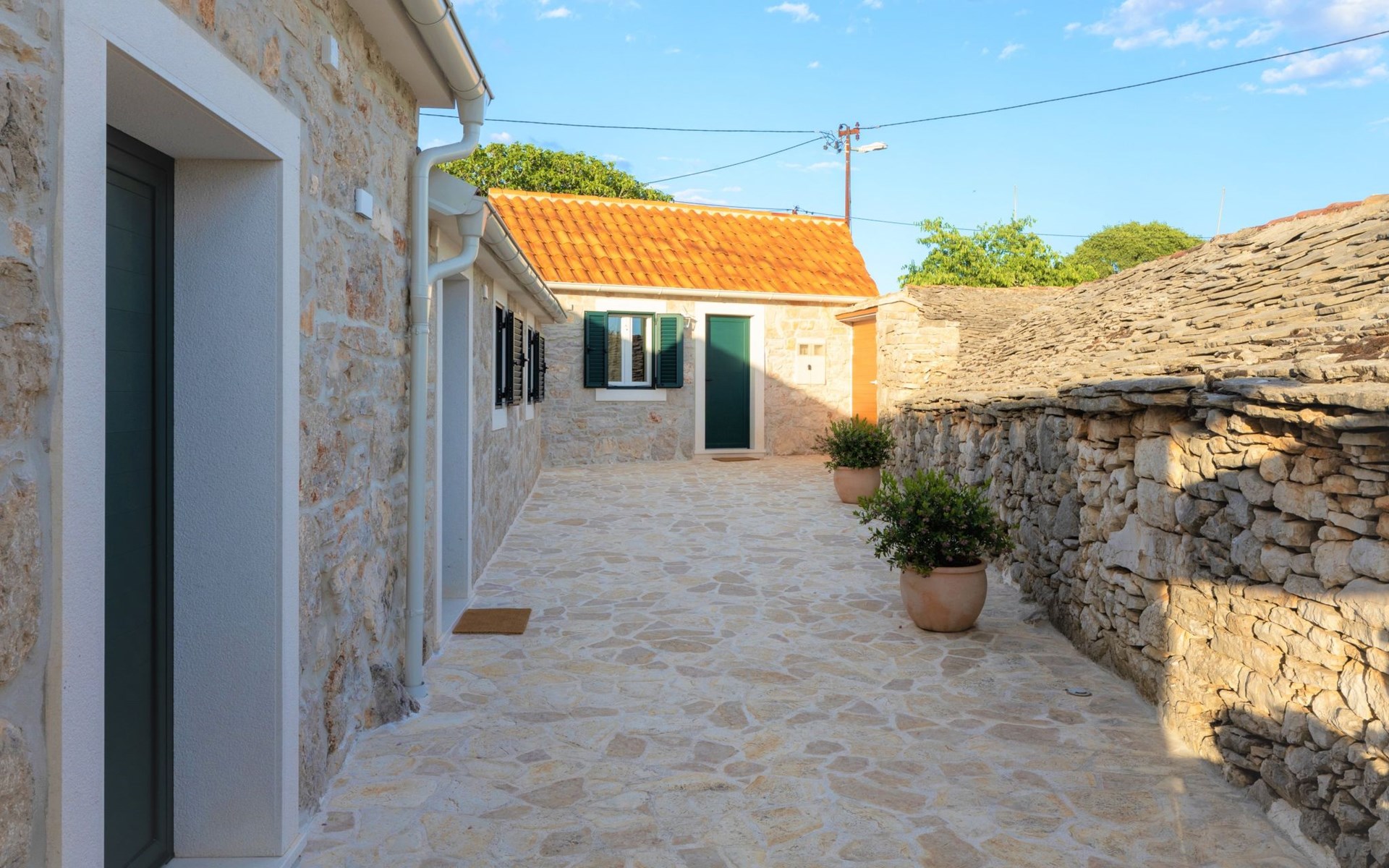 Beautiful single-family house "Villa di Perla", built in 2024. 3.5 km from the centre of Primošten, in a sunny position, 3 km from the sea, 3 km from the beach. Private: property 620 m2 (fenced), garden with trees, swimming pool angular (38 m2, depth 150 cm, seasonal availability: 01.May. - 31.Oct.). Outdoor shower, pool house with fridge and cooking stove, terrace (30 m2), garden furniture, children's playground (swing). In the house: internet access, washing machine. Parking (for 2 cars) at the house on the premises. Shop 3 km, restaurant 3 km, bus stop 3.3 km, pebble beach 3 km. Marina 6 km. Please note: suitable for families. The owner does not accept any youth groups. The unit consists of the small, separate house and the main house rented as one unit.