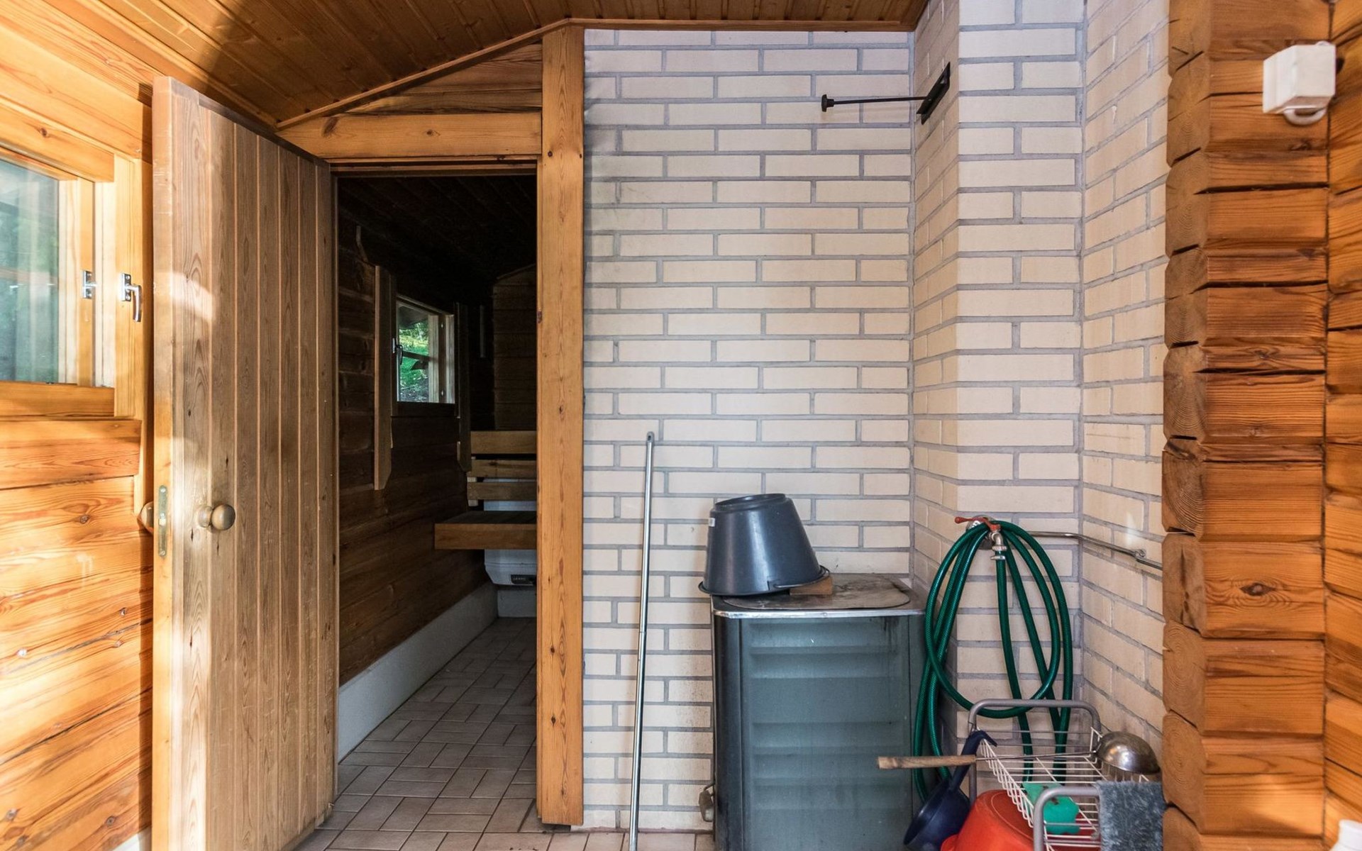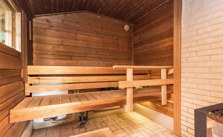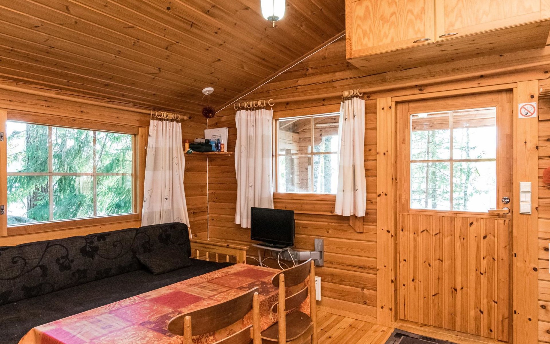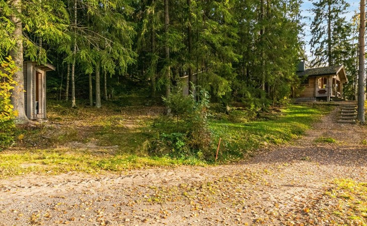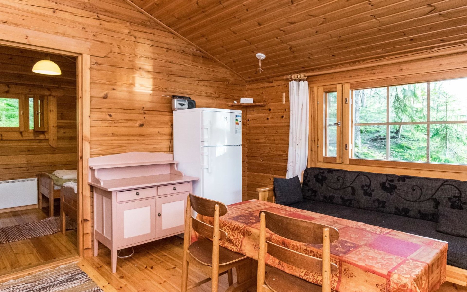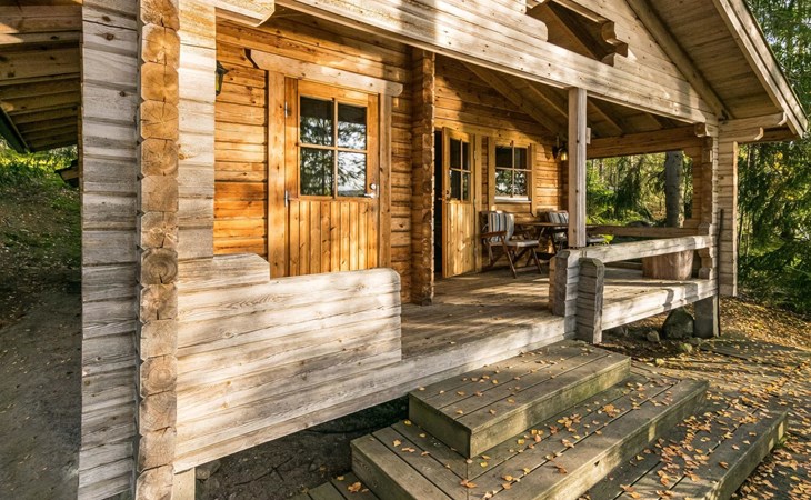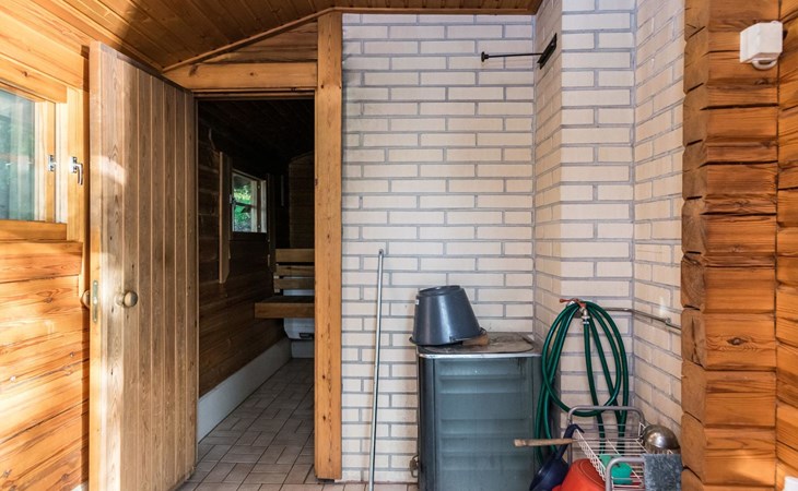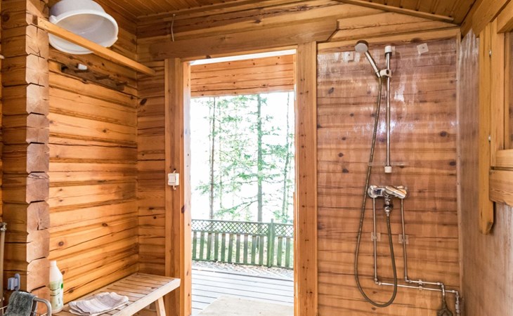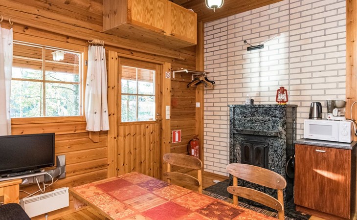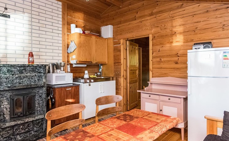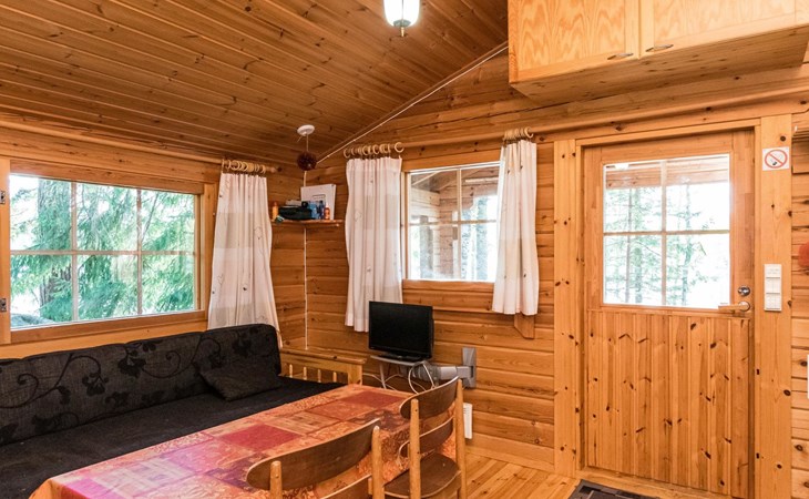 Log cabin 1997, living room/kitchen (13 m²) with spreadable bed for two, bedroom with (9 m²) two beds, access to sauna via terrace, toilet and shower in dressing/washroom, wood-burning sauna stove in sauna.