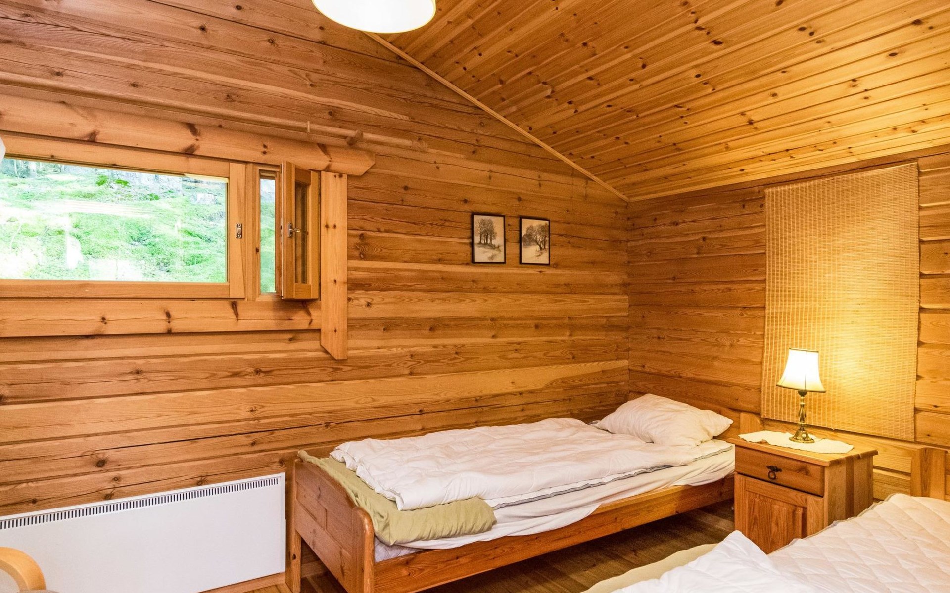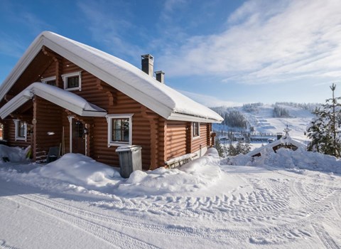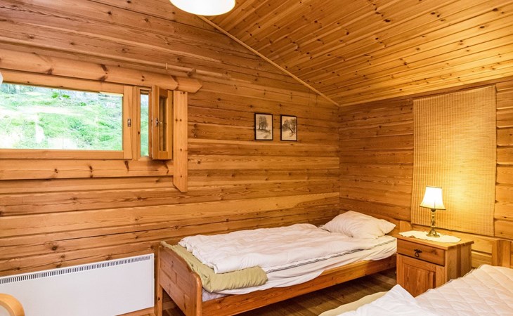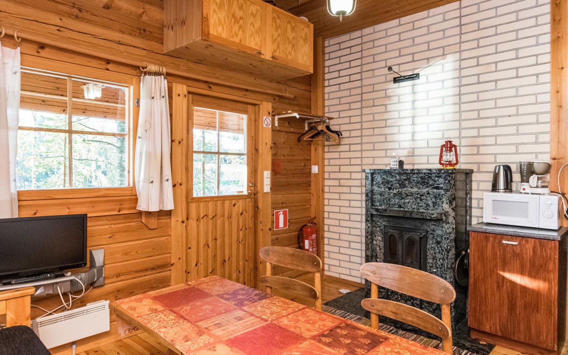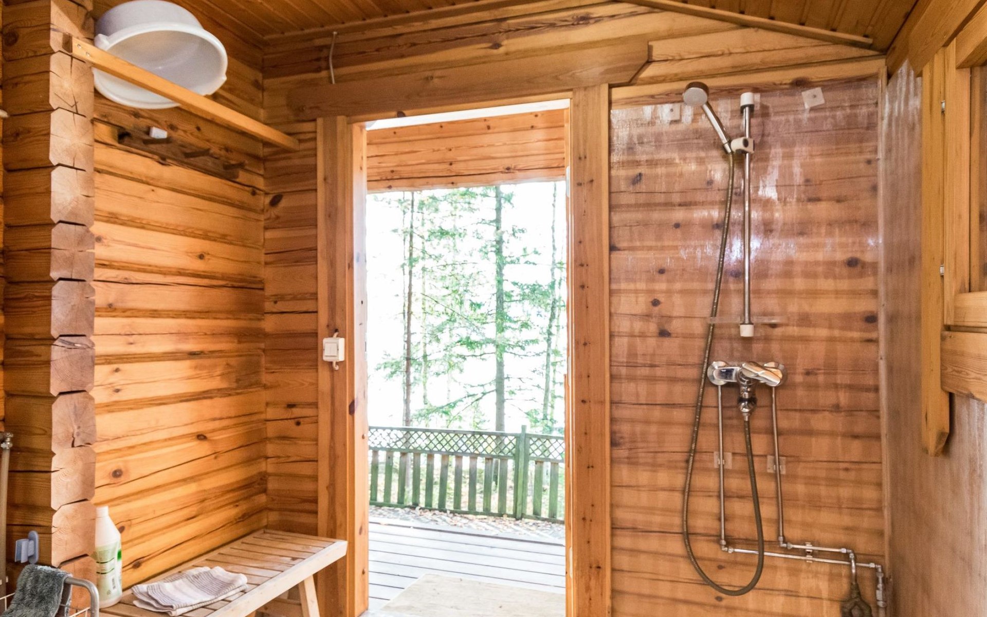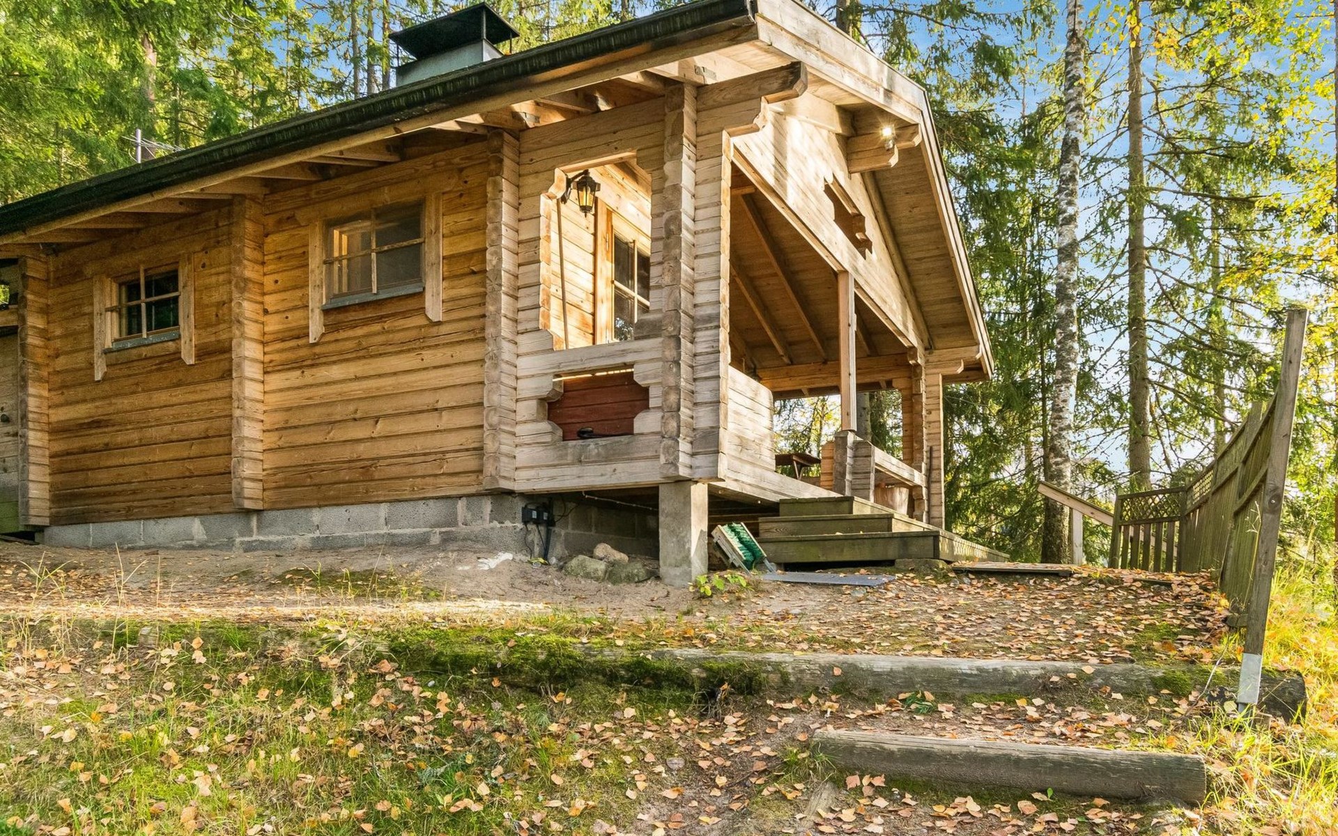 Log cabin 1997, living room/kitchen (13 m²) with spreadable bed for two, bedroom with (9 m²) two beds, access to sauna via terrace, toilet and shower in dressing/washroom, wood-burning sauna stove in sauna.