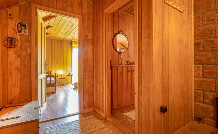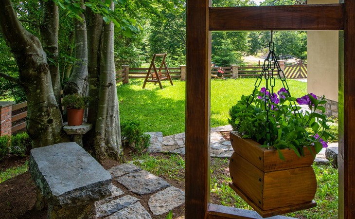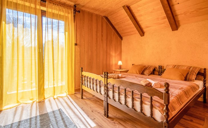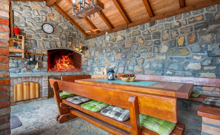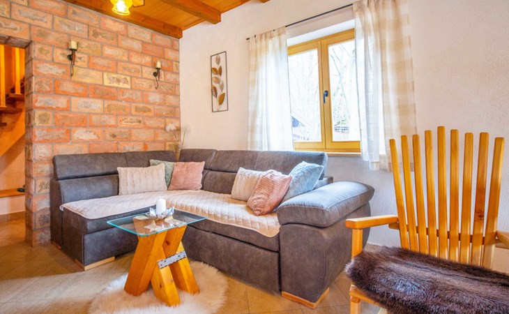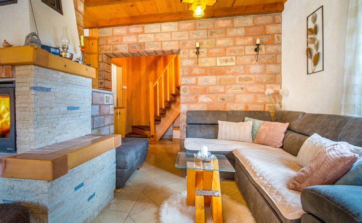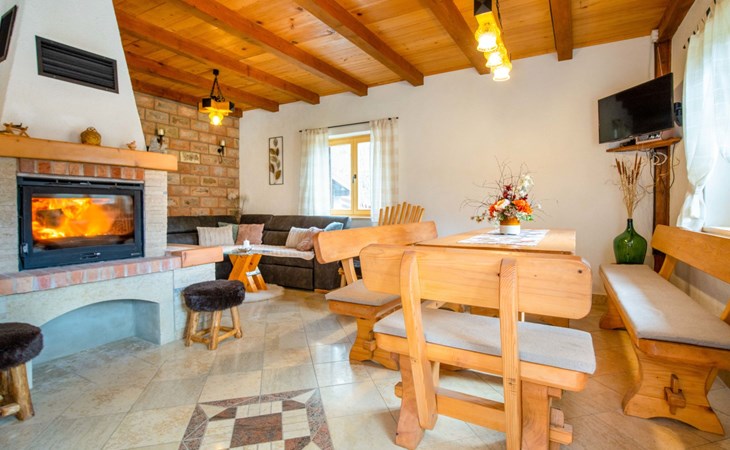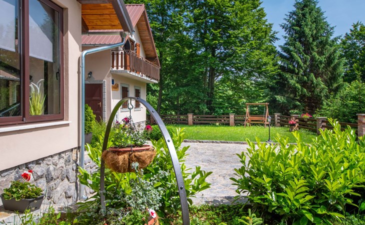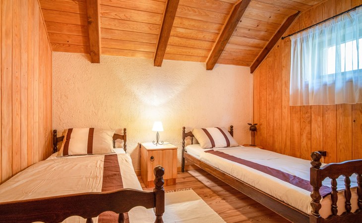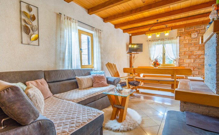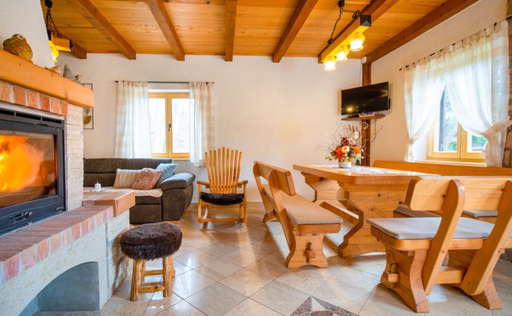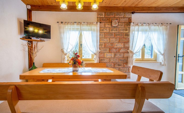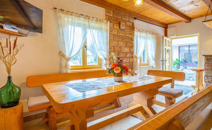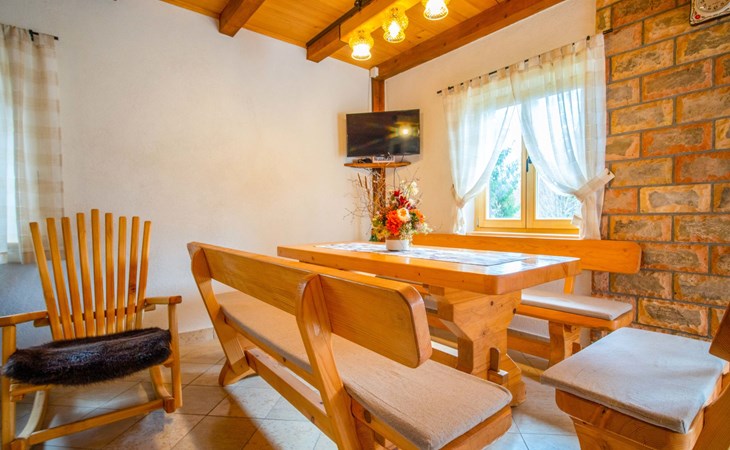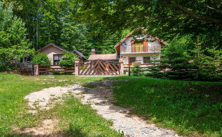 Lukovo 13 km from Fužine: Single-family house "Bazak", 2 storeys, surrounded by trees. In the hamlet Ravno, in a quiet, sunny position, 24 km from the sea, 14 km from the lake. Private: property 2'000 m2 with lawn 130 m2. Hot tub, barbecue house (swing). In the house: internet access, infrared sauna. Motor access (800 m via unmade road). Parking (for 3 cars) at the house on the premises. Shop 11 km, restaurant 1 km, bus stop 14.1 km, pebble beach 24 km, public bathing area 24 km. Riding stable 17 km, walking paths from the house 600 m, cycle lane 650 m. Well-known lakes can easily be reached: Bajer 14 km. The tap water has no drinking water quality.