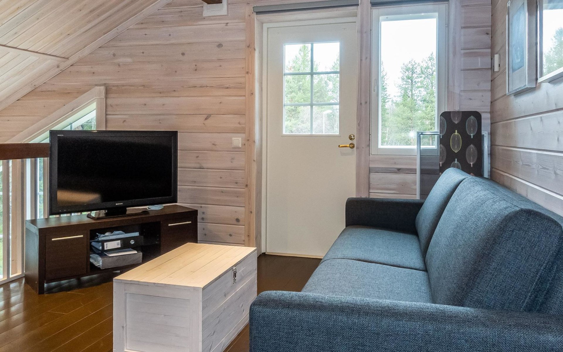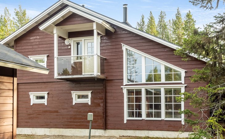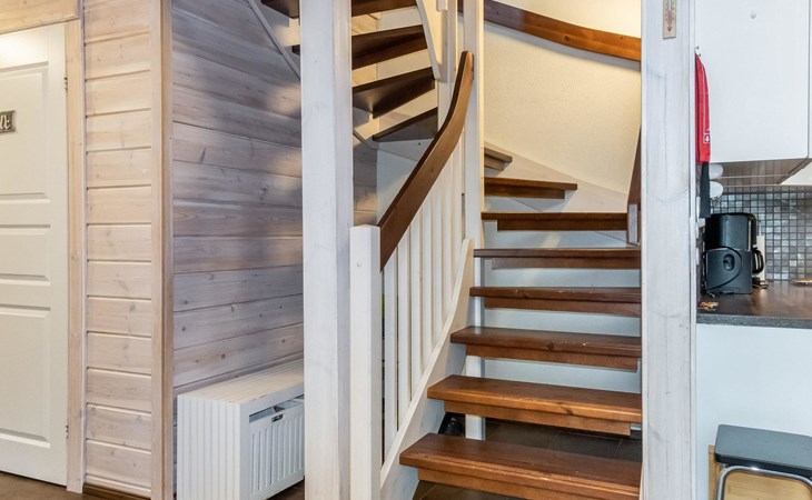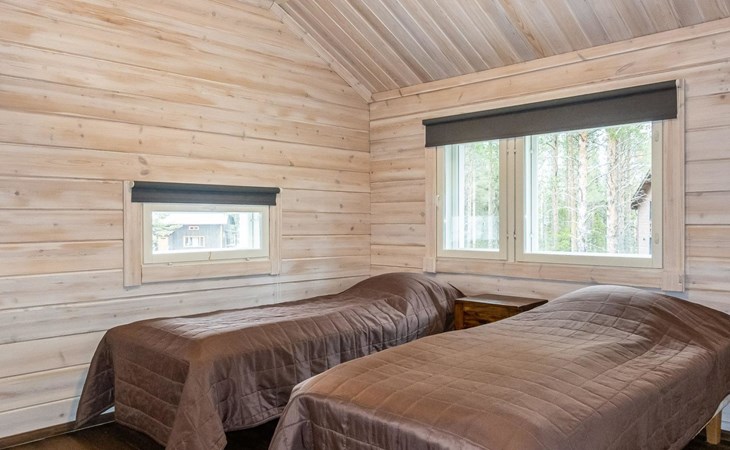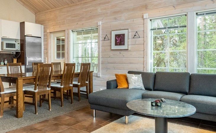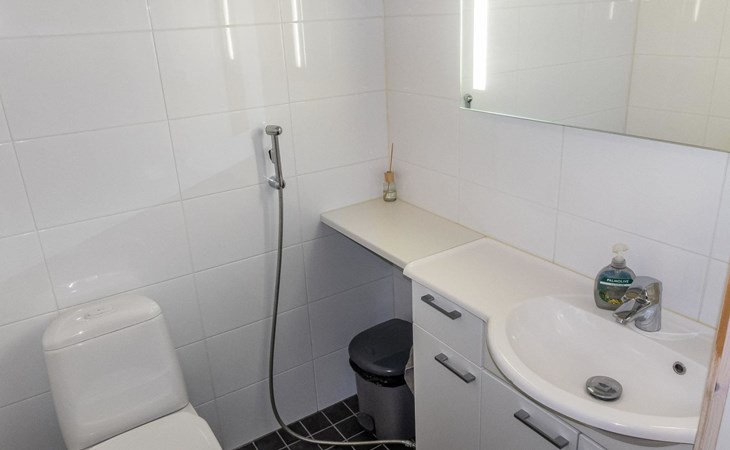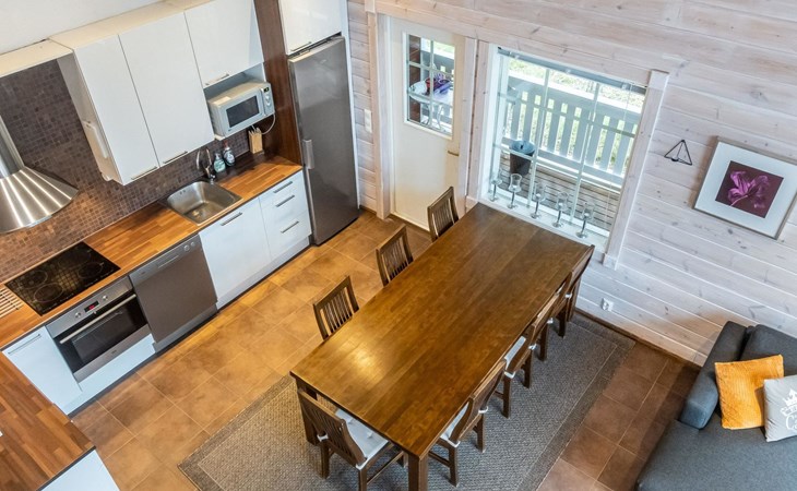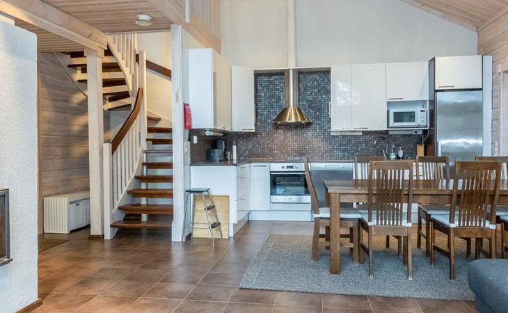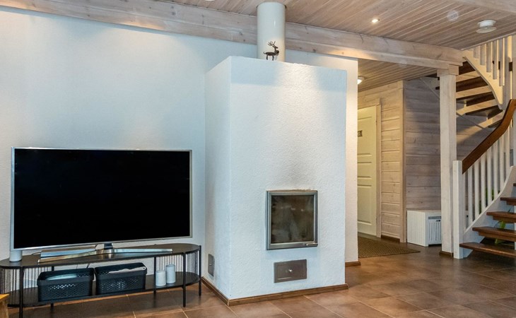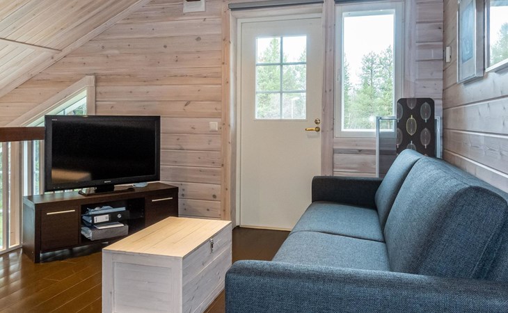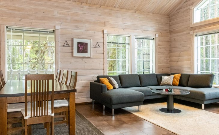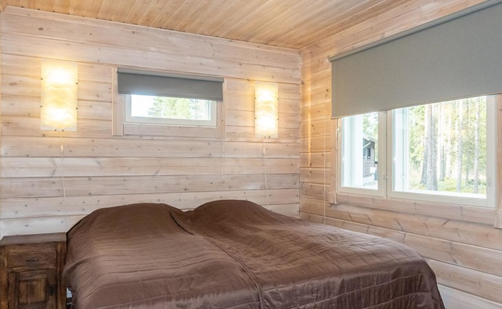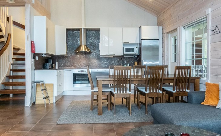 Downstairs: living room/kitchen, bedroom with double bed, sauna (electric stove), washroom (2 showers), utility room, hall, WC and porch.
