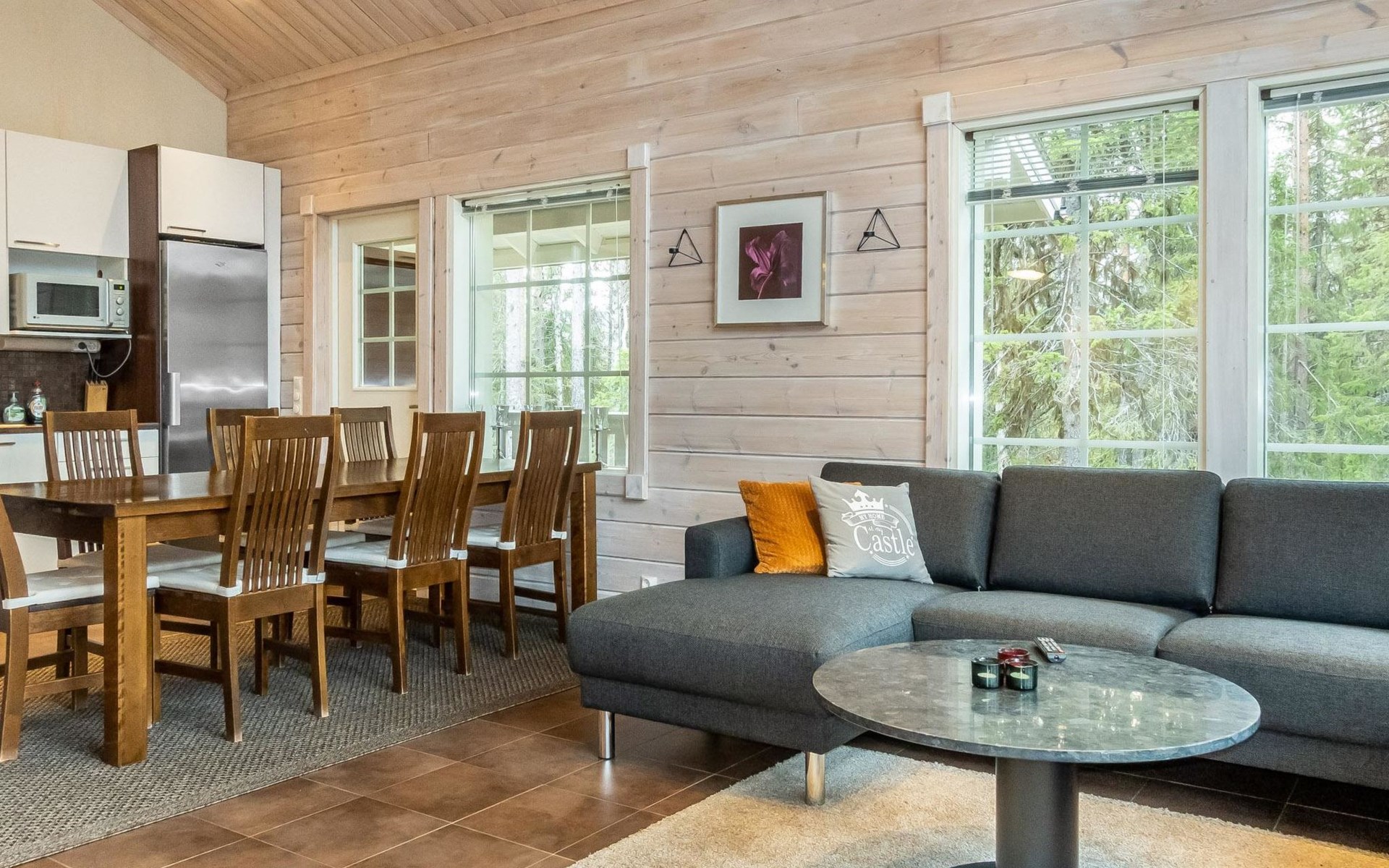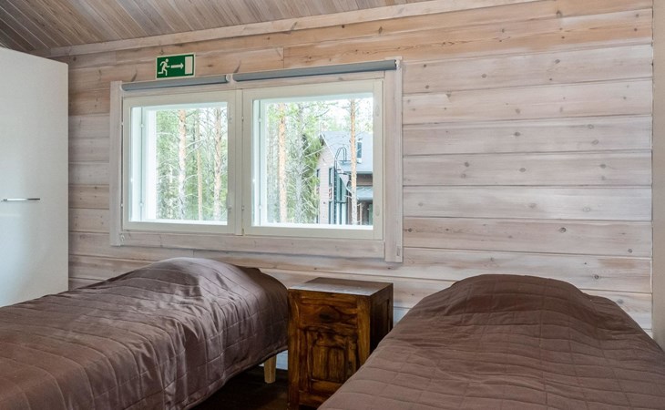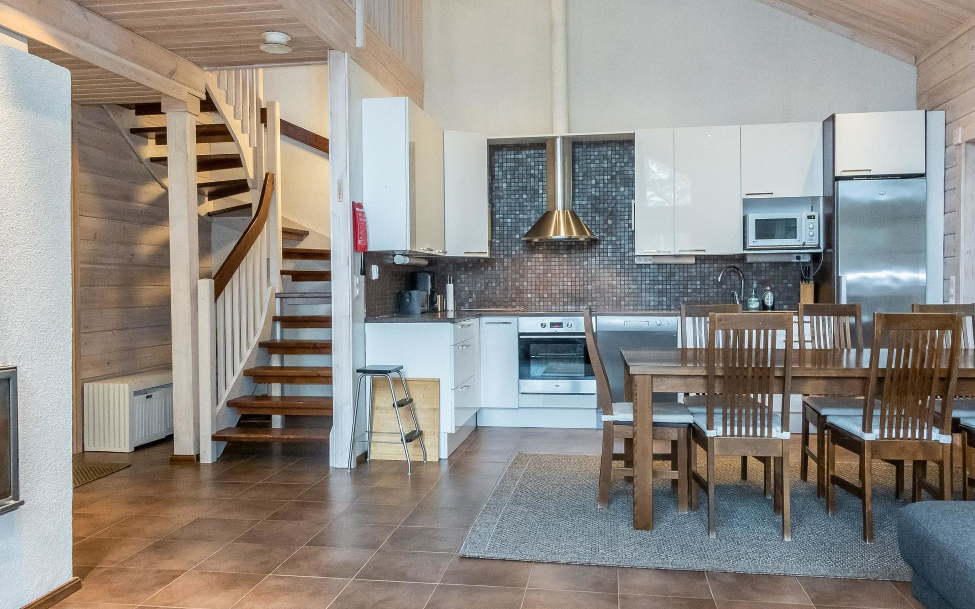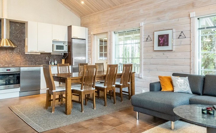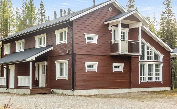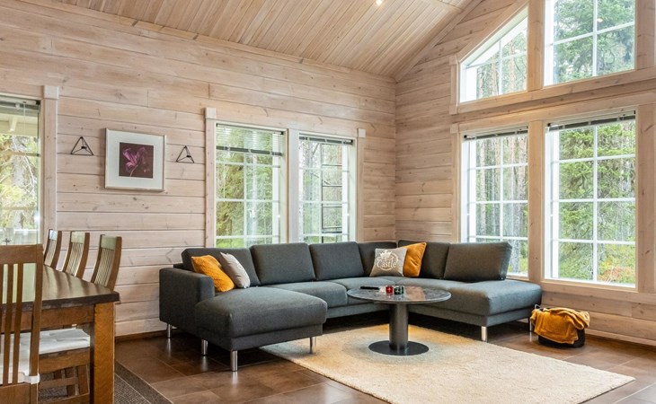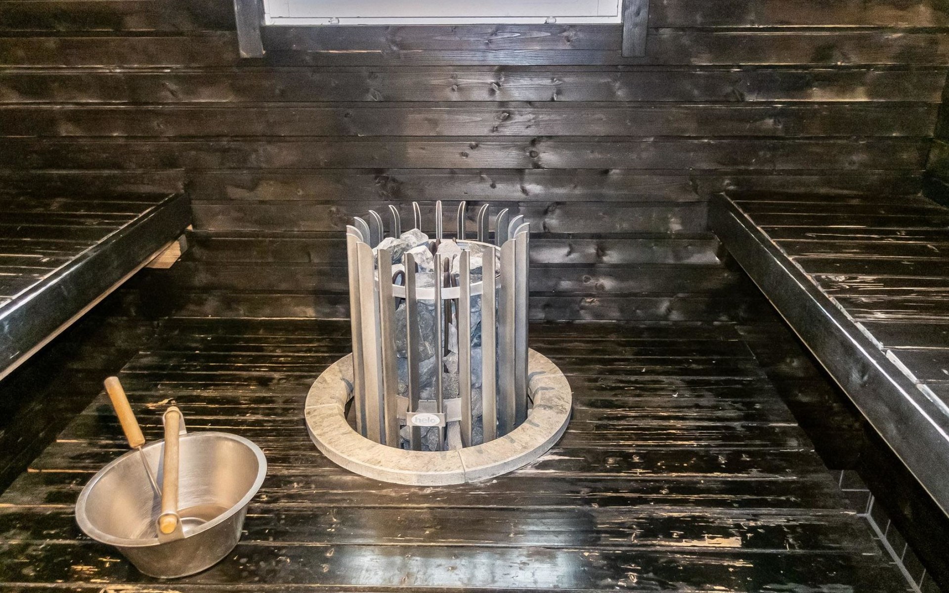 Downstairs: living room/kitchen, bedroom with double bed, sauna (electric stove), washroom (2 showers), utility room, hall, WC and porch.