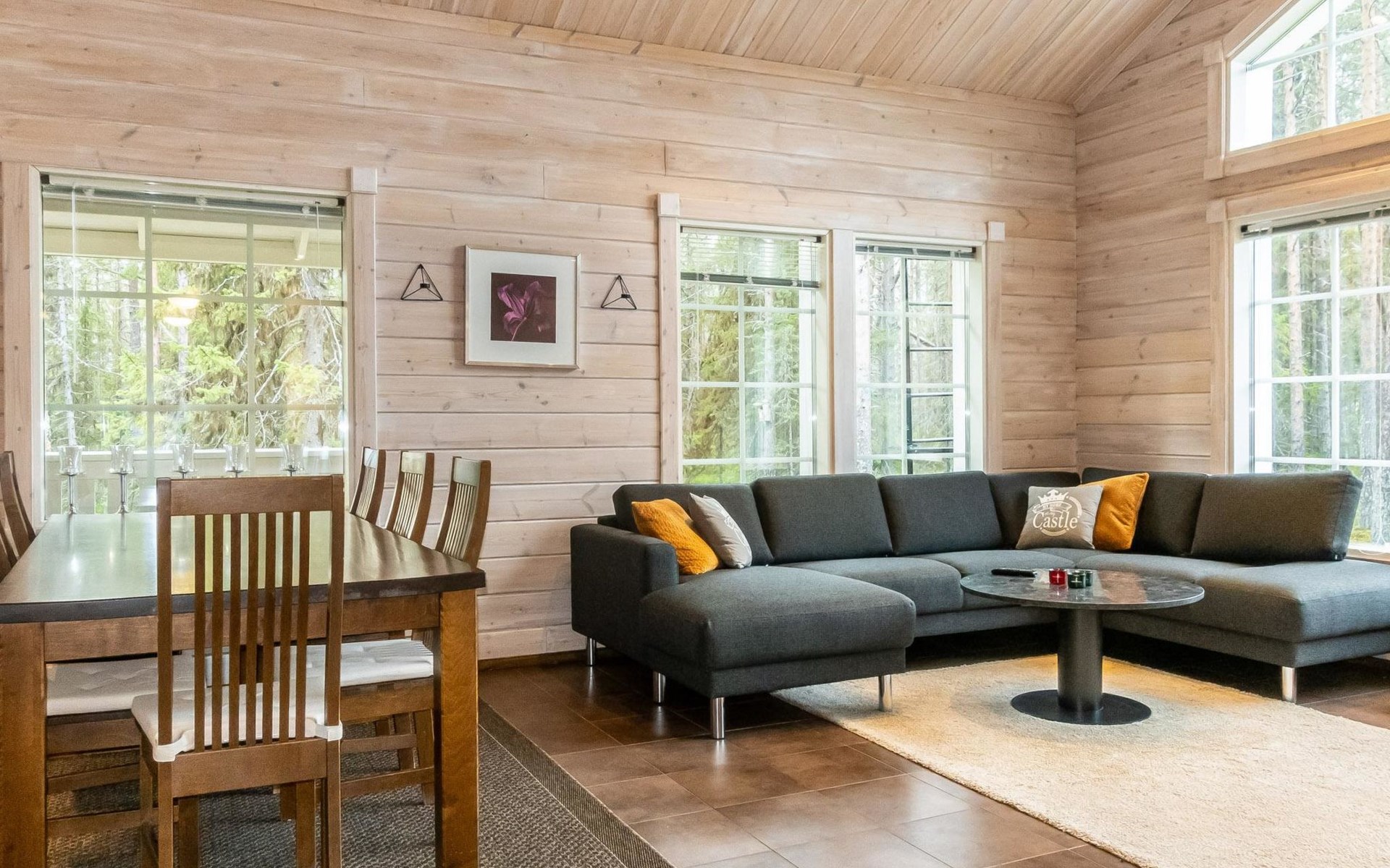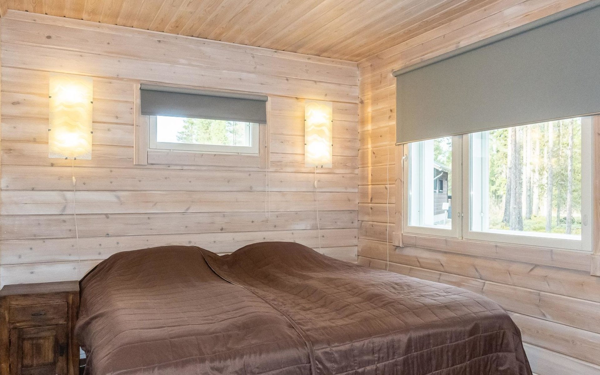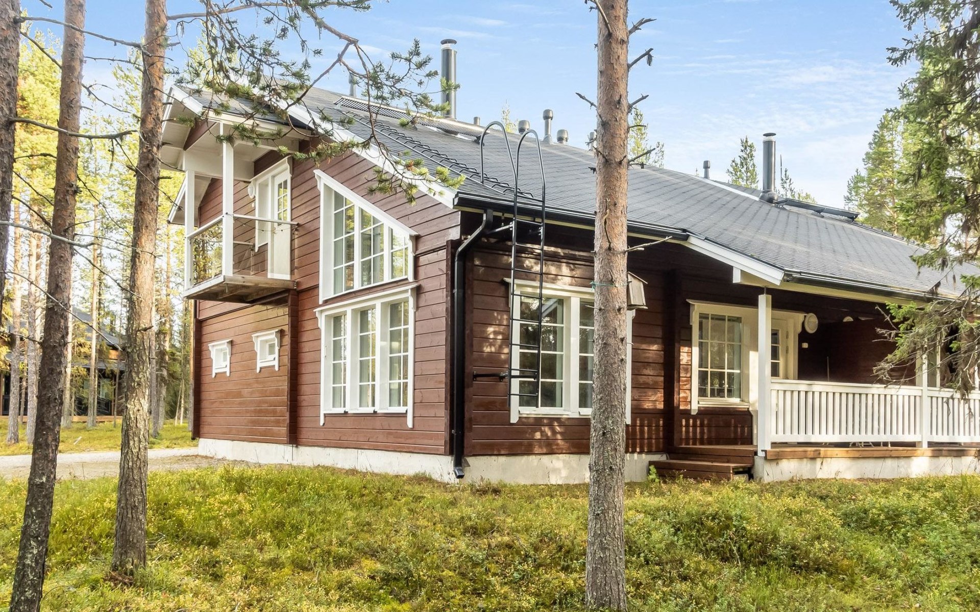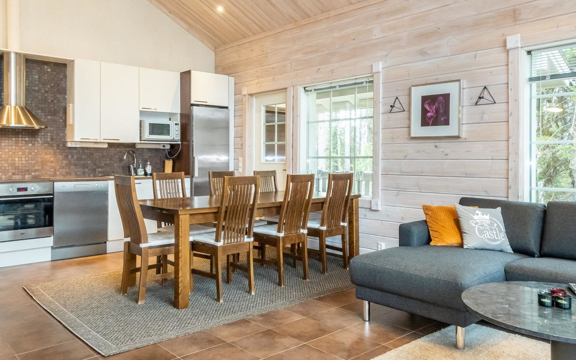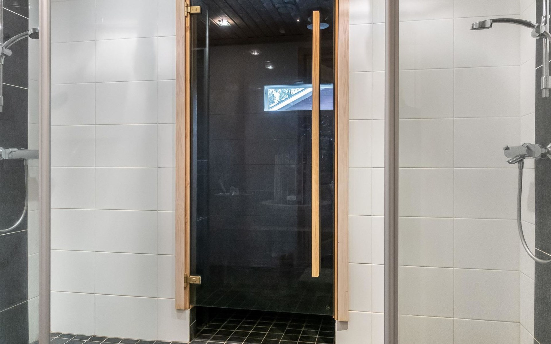 Downstairs: living room/kitchen, bedroom with double bed, sauna (electric stove), washroom (2 showers), utility room, hall, WC and porch.