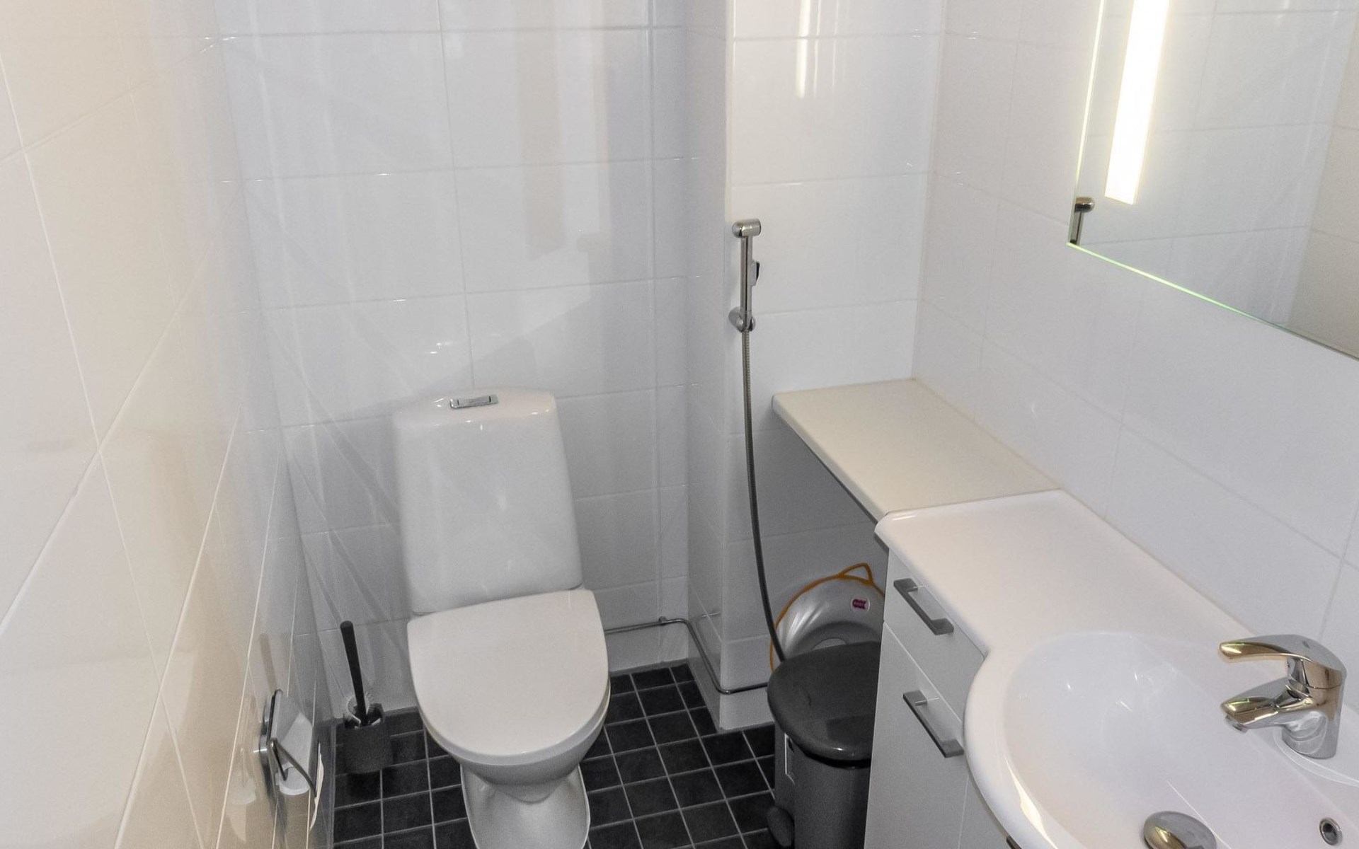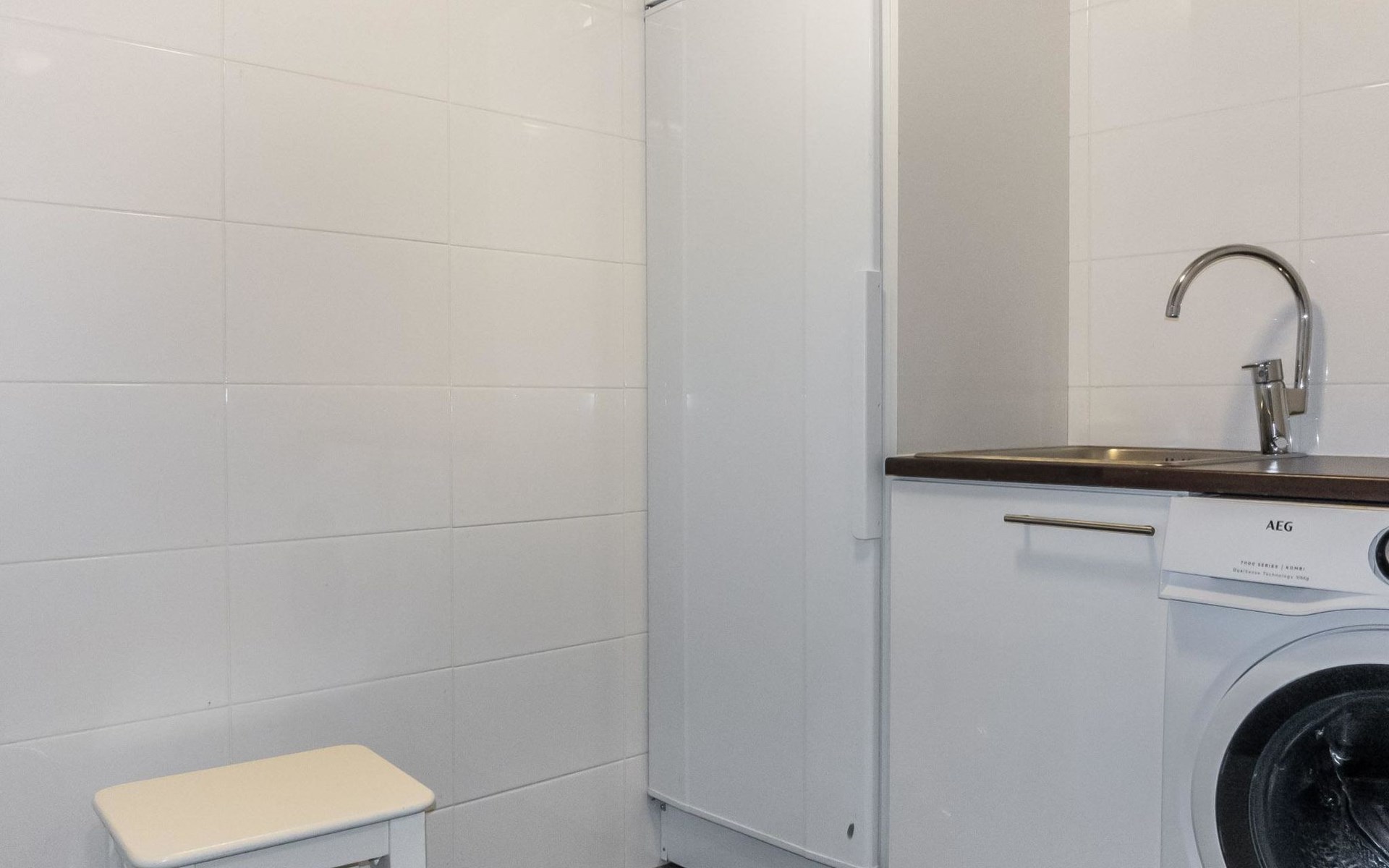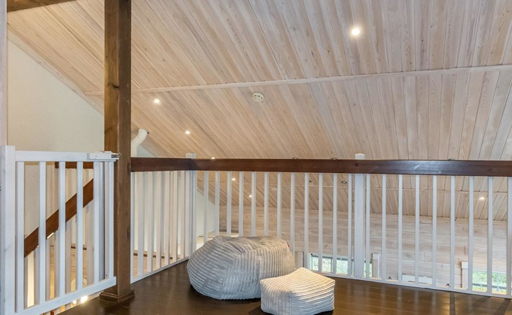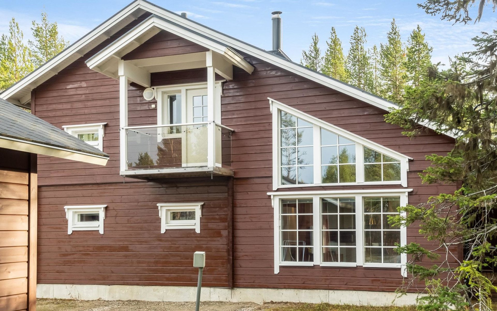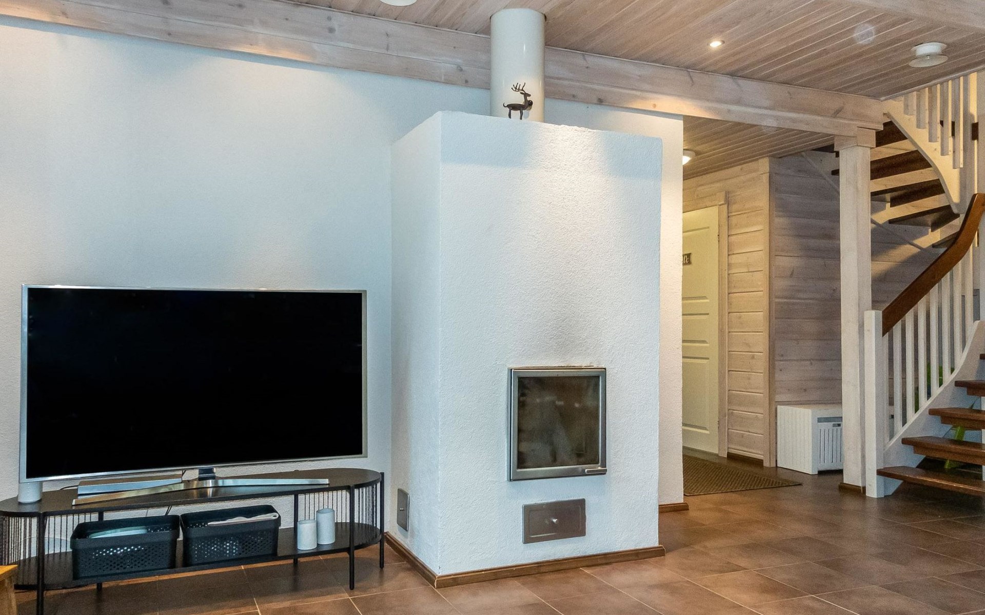 Downstairs: living room/kitchen, bedroom with double bed, sauna (electric stove), washroom (2 showers), utility room, hall, WC and porch.