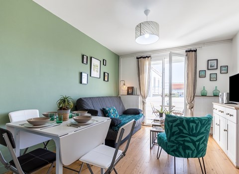 Vaux sur Mer 2 km from Royan: Residence "Les Soleils Rouges". 96 apartments in the residence. In the district of Pontaillac 1.8 km from the centre of Vaux sur Mer, 500 m from the sea, 500 m from the beach. Parking (limited number of spaces). Shop 500 m, supermarket 1.2 km, restaurant, bakery, café 500 m, bus stop "Porte Océane" 250 m, railway station "Royan" 4 km, sandy beach "Pontaillac" 500 m, park "Luna Park (Juillet-Août)", indoor swimming pool 4 km, thermal baths "Thalassothérapie Thalazur Royan" 2 km. Sports harbour 3 km, golf course (18 hole) 6 km, surf school 500 m, tennis 2.3 km, indoor tennis centre 2.3 km, minigolf 1 km, riding stable 7 km, cycle lane 200 m. Nearby attractions: Zoo de La Palmyre 13 km, Hippodrome - La Palmyre 14 km, Centre aquatique Iléo - Ile d'Oléron 47 km, Fort Boyard - Fouras 57 km, Aéroport La Rochelle - Ile de Ré 79 km, Aéroport Bordeaux - Merignac 132 km. Please note: Additional accommodations can be booked.
