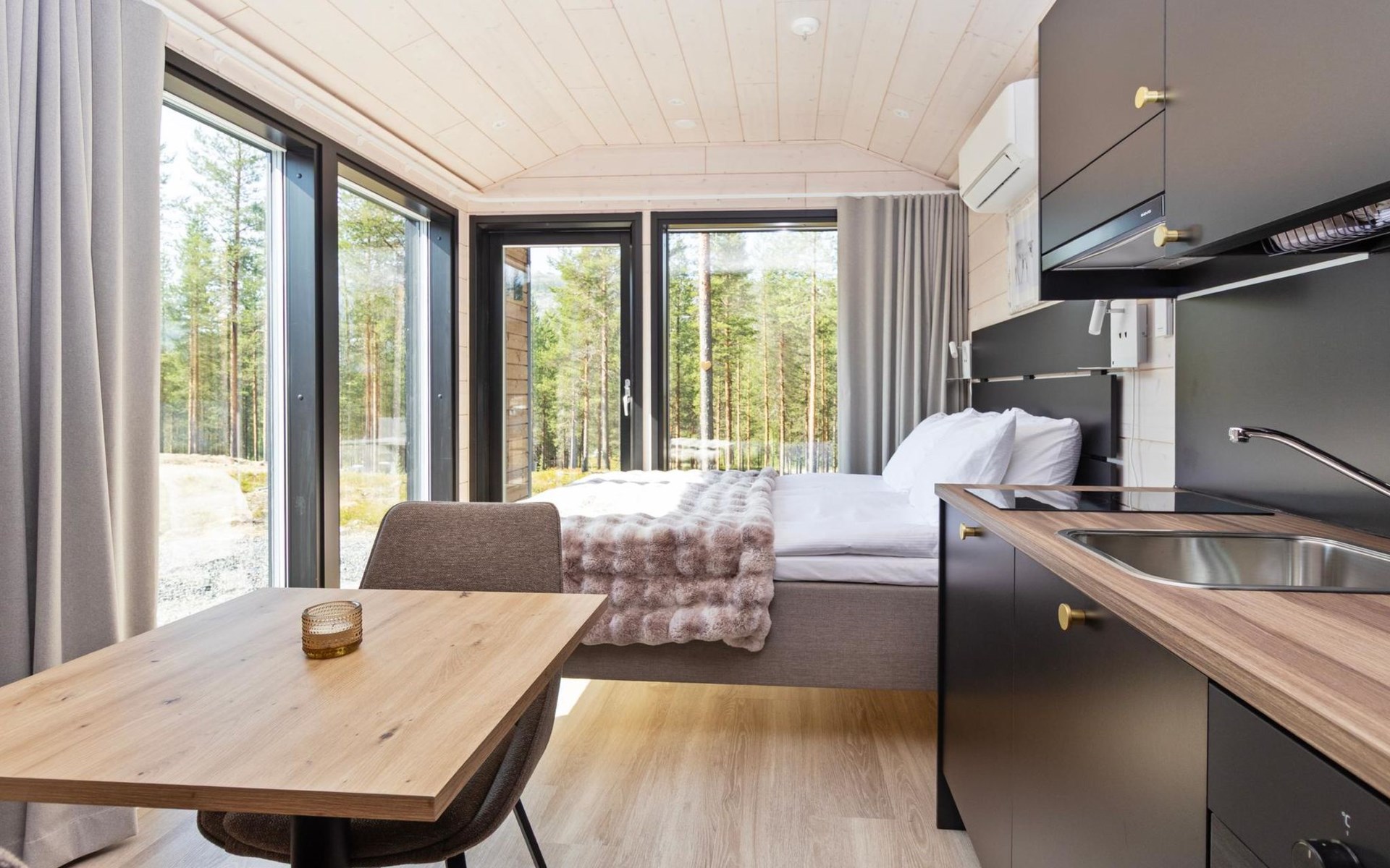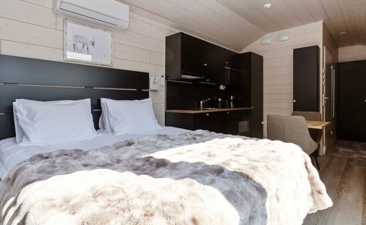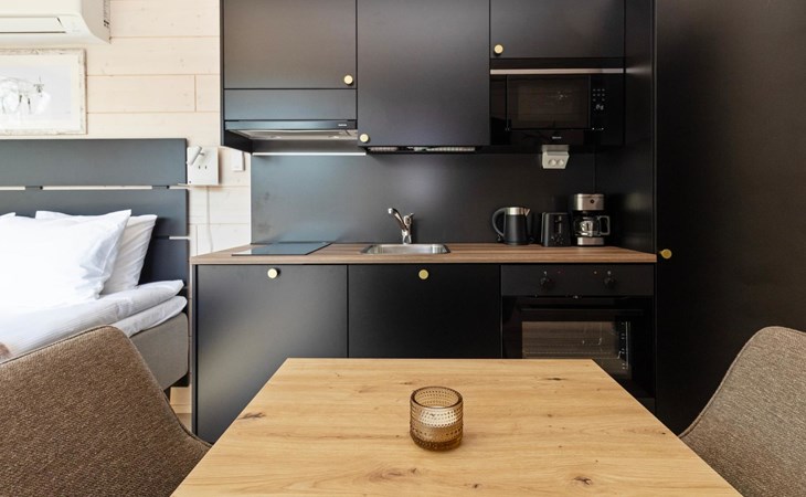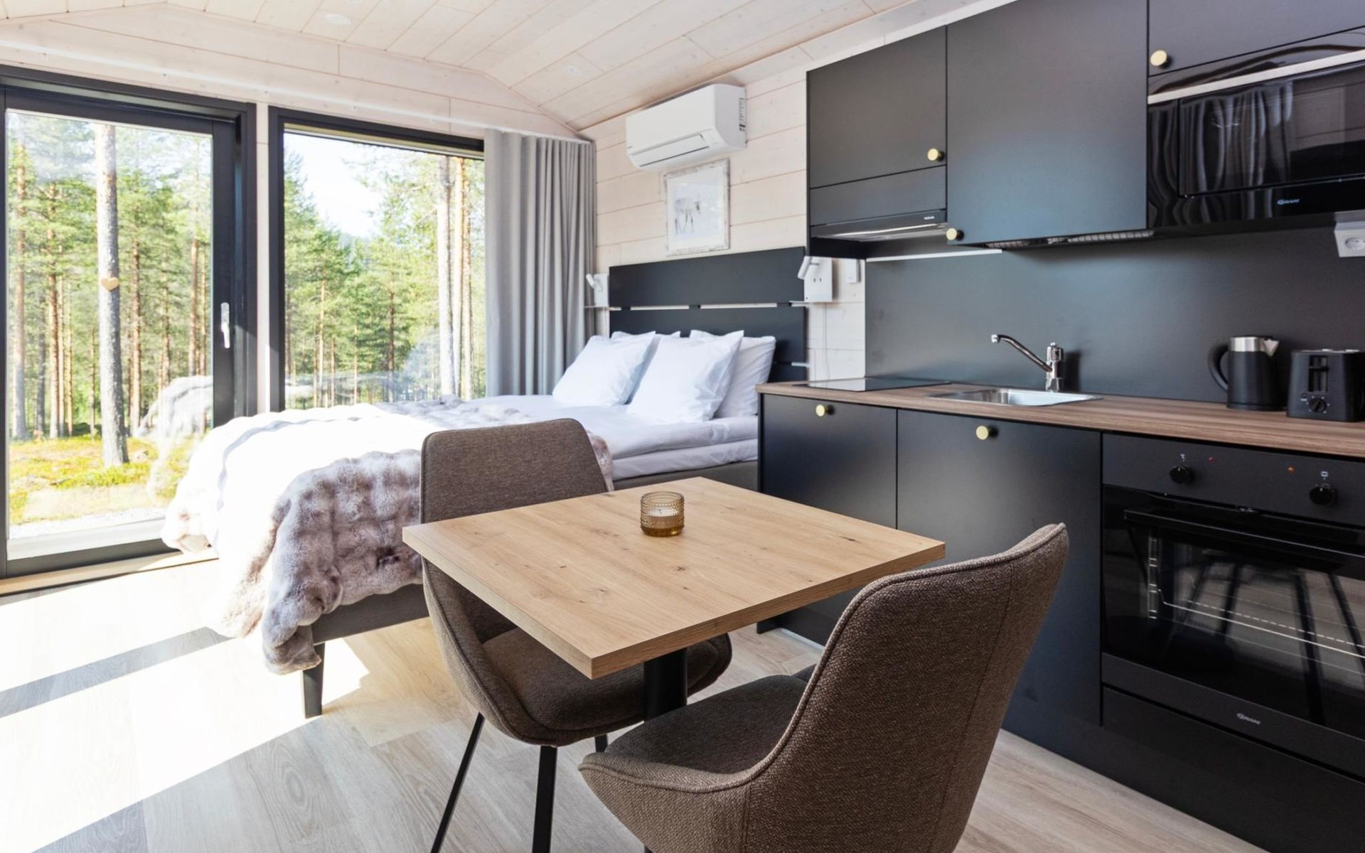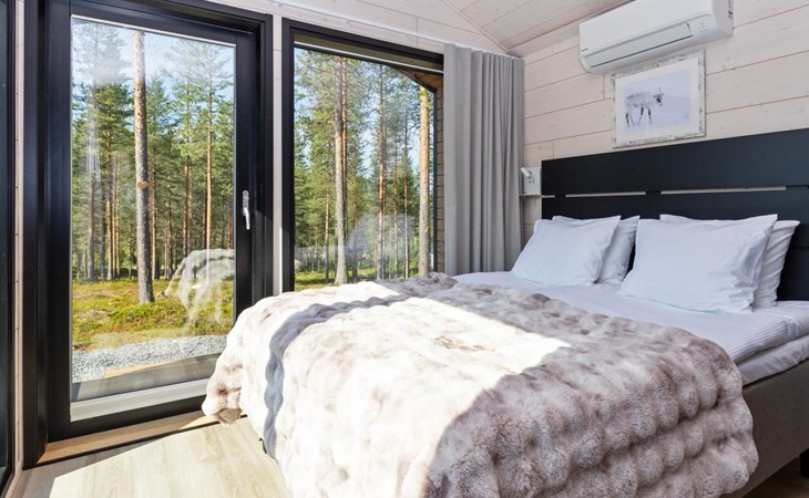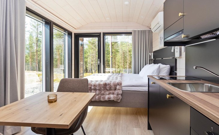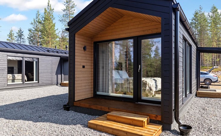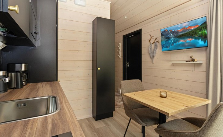 Built in 2025, the cabin has everything you need for a relaxing holiday. The combined living room/kitchen/sleeping area is practical and comfortable, and the bathroom includes a shower and WC. The sleeping area features a 160 cm wide bed for two. Large windows and a covered terrace bring the scenery into your stay. Heating is provided by underfloor heating and an air source heat pump, keeping the cabin comfortable in both winter's cold and summer heat.