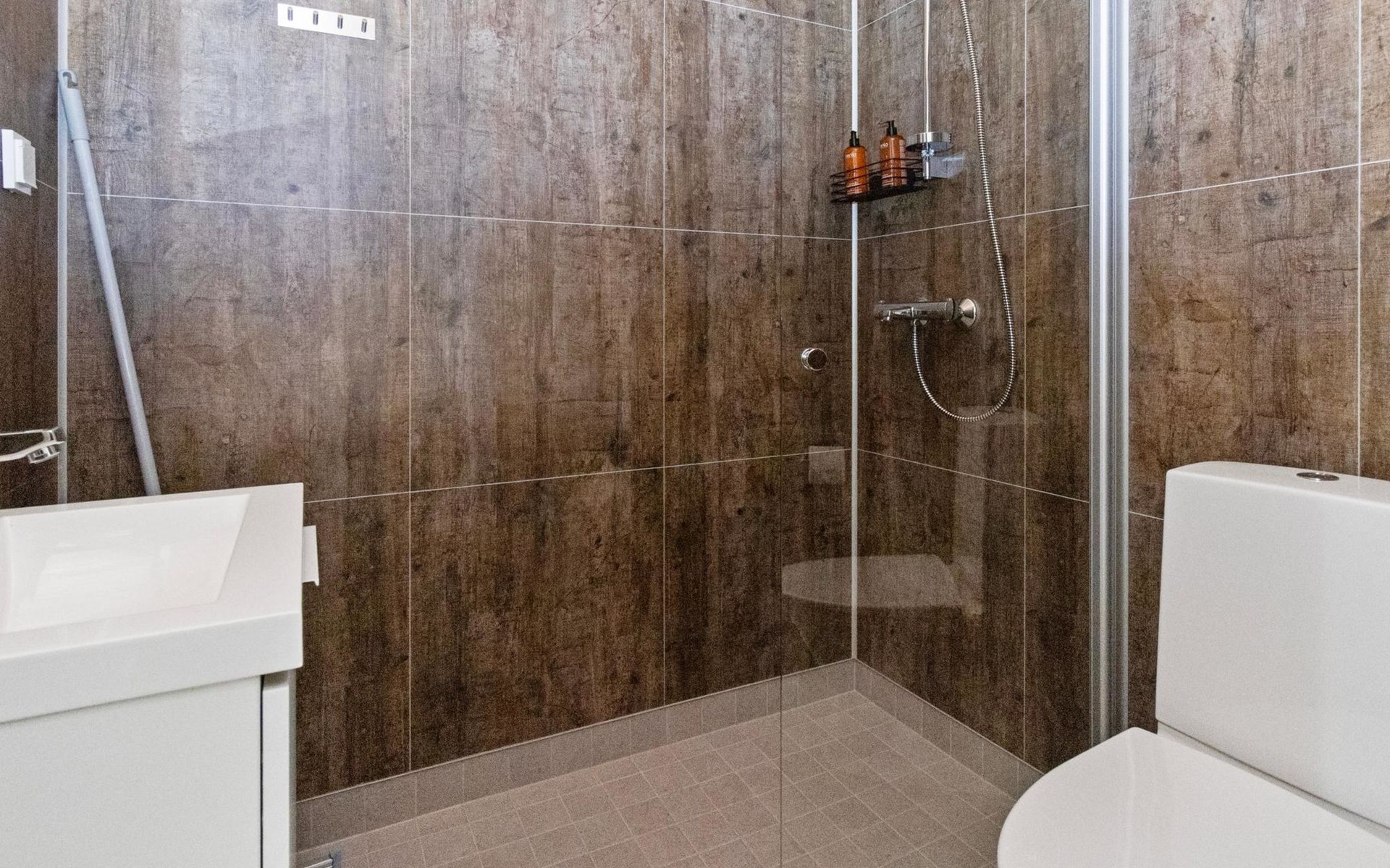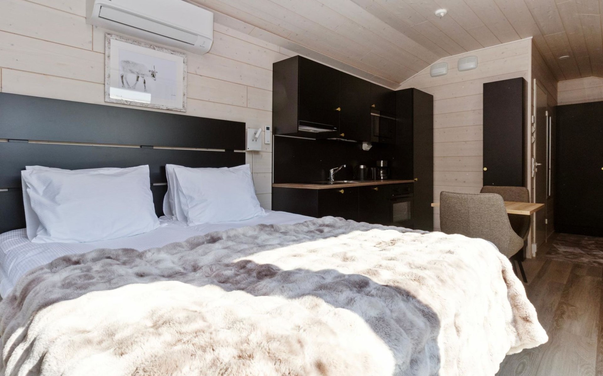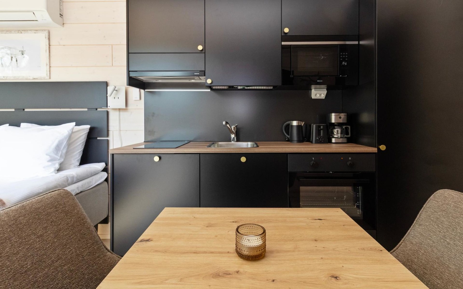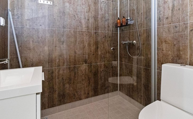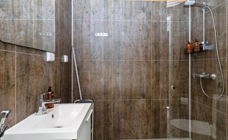 Built in 2025, the cabin has everything you need for a relaxing holiday. The combined living room/kitchen/sleeping area is practical and comfortable, and the bathroom includes a shower and WC. The sleeping area features a 160 cm wide bed for two. Large windows and a covered terrace bring the scenery into your stay. Heating is provided by underfloor heating and an air source heat pump, keeping the cabin comfortable in both winter's cold and summer heat.