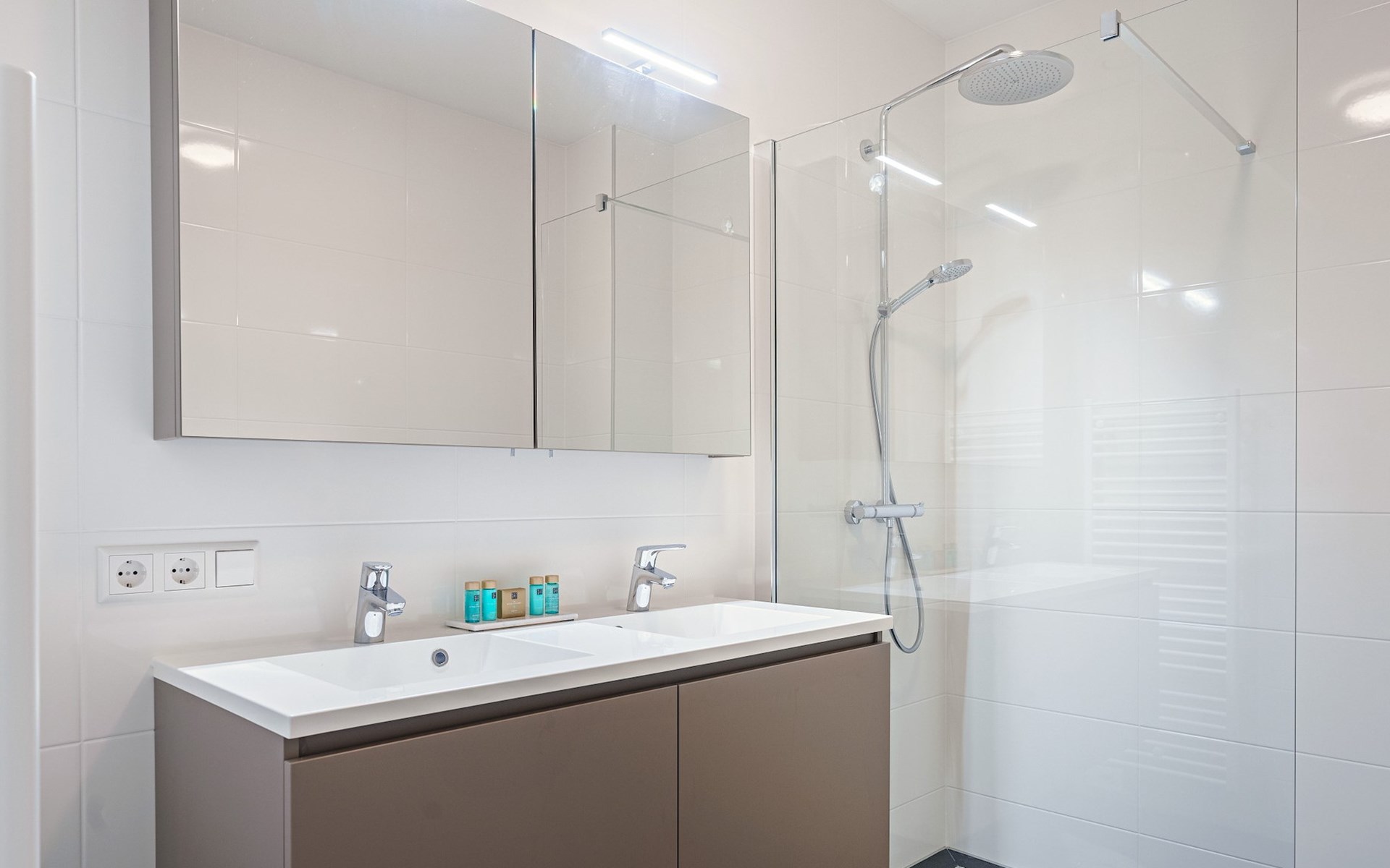 There are 2 bedrooms with two single beds and a separate en suite bathroom in the apartment. One of the en suite bathrooms has a walk-in shower, a double washbasin, and a toilet. The other en suite bathroom has a shower and a washbasin. There also is a separate toilet.